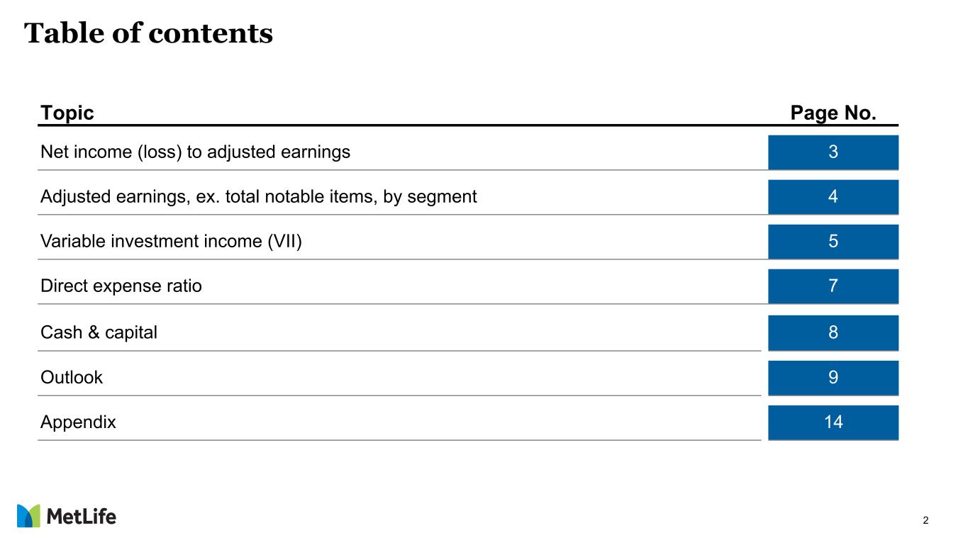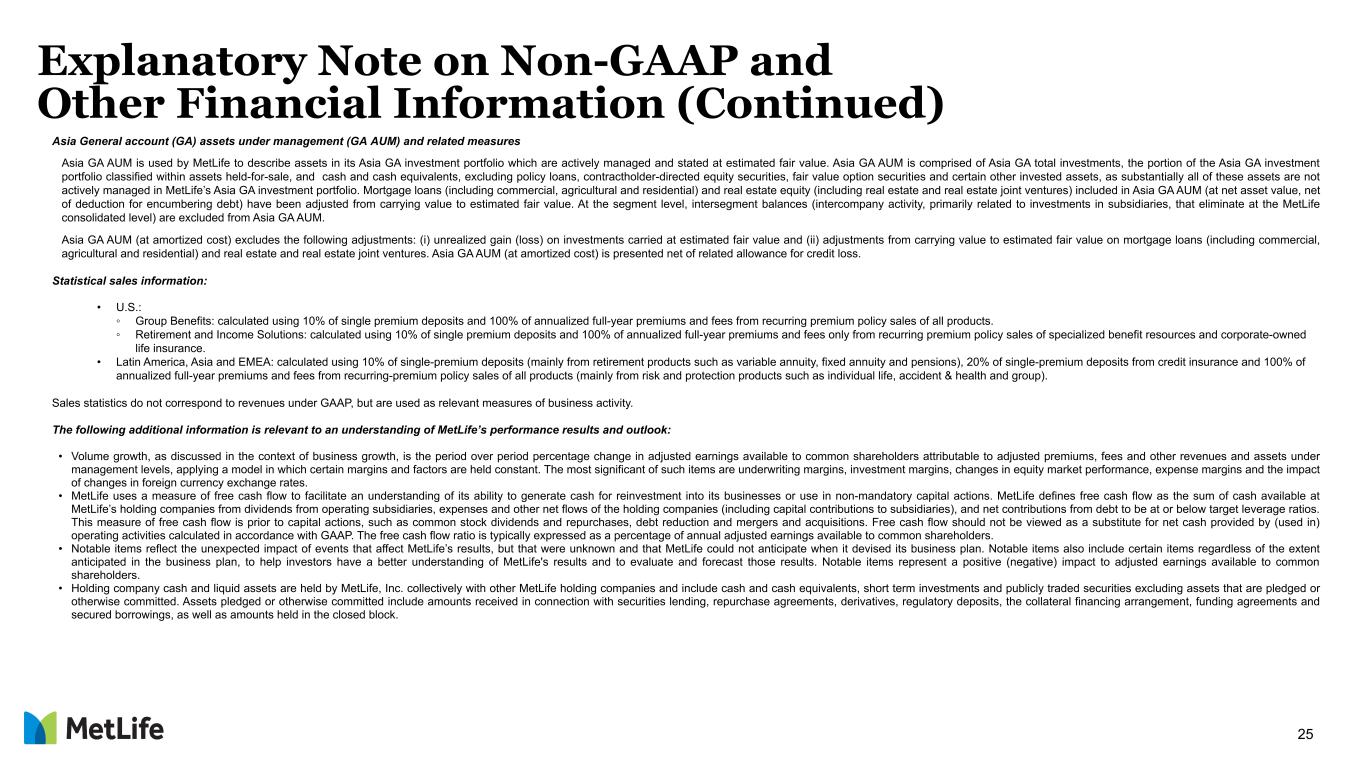 24 Explanatory Note on Non-GAAP and Other Financial Information (Continued) The following additional adjustments are made to revenues, in the line items indicated, in calculating adjusted revenues: • Universal life and investment-type product policy fees excludes the amortization of unearned revenue related to NIGL and NDGL (Unearned revenue adjustments) and certain variable annuity guaranteed minimum income benefits (GMIB) fees (GMIB fees); • Net investment income: (i) includes adjustments for earned income on derivatives and amortization of premium on derivatives that are hedges of investments or that are used to replicate certain investments, but do not qualify for hedge accounting treatment (Investment hedge adjustments), (ii) excludes post-tax adjusted earnings adjustments relating to insurance joint ventures accounted for under the equity method, (iii) excludes certain amounts related to contractholder- directed equity securities, (iv) excludes certain amounts related to securitization entities that are variable interest entities (VIEs) consolidated under GAAP and (v) includes distributions of profits from certain other limited partnership interests that were previously accounted for under the cost method, but are now accounted for at estimated fair value, where the change in estimated fair value is recognized in NIGL under GAAP; and • Other revenues is adjusted for settlements of foreign currency earnings hedges and excludes fees received in association with services provided under transition service agreements (TSA fees). The following additional adjustments are made to expenses, in the line items indicated, in calculating adjusted expenses: • Policyholder benefits and claims and policyholder dividends excludes: (i) amortization of basis adjustments associated with de-designated fair value hedges of future policy benefits, (ii) changes in the policyholder dividend obligation related to NIGL and NDGL, (iii) inflation-indexed benefit adjustments associated with contracts backed by inflation-indexed investments and amounts associated with periodic crediting rate adjustments based on the total return of a contractually referenced pool of assets and other pass-through adjustments, (iv) benefits and hedging costs related to GMIBs (GMIB costs), and (v) market value adjustments associated with surrenders or terminations of contracts (Market value adjustments); • Interest credited to policyholder account balances includes adjustments for earned income on derivatives and amortization of premium on derivatives that are hedges of policyholder account balances but do not qualify for hedge accounting treatment and excludes certain amounts related to net investment income earned on contractholder-directed equity securities; • Amortization of DAC and value of business acquired (VOBA) excludes amounts related to: (i) NIGL and NDGL, (ii) GMIB fees and GMIB costs and (iii) Market value adjustments; • Amortization of negative VOBA excludes amounts related to Market value adjustments; • Interest expense on debt excludes certain amounts related to securitization entities that are VIEs consolidated under GAAP; and • Other expenses excludes: (i) noncontrolling interests, (ii) implementation of new insurance regulatory requirements costs (Regulatory implementation costs), and (iii) acquisition, integration and other costs. Other expenses includes TSA fees. Adjusted earnings also excludes the recognition of certain contingent assets and liabilities that could not be recognized at acquisition or adjusted for during the measurement period under GAAP business combination accounting guidance. The tax impact of the adjustments mentioned above are calculated net of the U.S. or foreign statutory tax rate, which could differ from MetLife's effective tax rate. Additionally, the provision for income tax (expense) benefit also includes the impact related to the timing of certain tax credits, as well as certain tax reforms. In addition, adjusted earnings available to common shareholders excludes the impact of preferred stock redemption premium, which is reported as a reduction to net income (loss) available to MetLife, Inc.’s common shareholders. Return on equity and related measures • Total MetLife, Inc.’s common stockholders’ equity, excluding AOCI other than FCTA: total MetLife, Inc.’s common stockholders’ equity, excluding the net unrealized investment gains (losses) and defined benefit plans adjustment components of AOCI, net of income tax. Expense ratio, direct expense ratio, adjusted expense ratio and related measures • Expense ratio: other expenses, net of capitalization of DAC, divided by premiums, fees and other revenues. • Direct expense ratio: adjusted direct expenses, divided by adjusted premiums, fees and other revenues. • Direct expense ratio, excluding total notable items related to direct expenses and PRT: adjusted direct expenses, excluding total notable items related to direct expenses, divided by adjusted premiums, fees and other revenues, excluding PRT. • Adjusted expense ratio: adjusted other expenses, net of adjusted capitalization of DAC, divided by adjusted premiums, fees and other revenues. • Adjusted expense ratio, excluding total notable items related to adjusted other expenses and PRT: adjusted other expenses, net of adjusted capitalization of DAC, excluding total notable items related to adjusted other expenses, divided by adjusted premiums, fees and other revenues, excluding PRT.