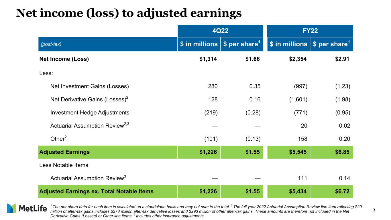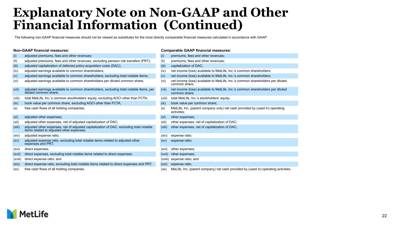 21 Explanatory Note on Non-GAAP and Other Financial Information Any references in this presentation (except in this Explanatory Note on Non-GAAP Financial Information and Reconciliations) to: Should be read as, respectively: (i) net income (loss); (i) net income (loss) available to MetLife, Inc.’s common shareholders; (ii) net income (loss) per share; (ii) net income (loss) available to MetLife, Inc.’s common shareholders per diluted common share; (iii) adjusted earnings; (iii) adjusted earnings available to common shareholders; (iv) adjusted earnings per share; (iv) adjusted earnings available to common shareholders per diluted common share; (v) book value per share; and (v) book value per common share; and (vi) book value per share, excluding AOCI other than FCTA. (vi) book value per common share, excluding AOCI other than FCTA. In this presentation, MetLife presents certain measures of its performance on a consolidated and segment basis that are not calculated in accordance with accounting principles generally accepted in the United States of America (GAAP). MetLife believes that these non-GAAP financial measures enhance the understanding for MetLife and its investors of MetLife's performance by highlighting the results of operations and the underlying profitability drivers of the business. Segment-specific financial measures are calculated using only the portion of consolidated results attributable to that specific segment.
