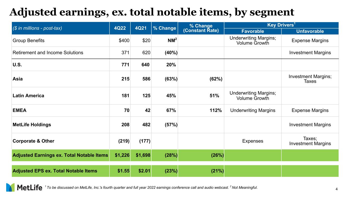 3 Net income (loss) to adjusted earnings 4Q22 FY22 (post-tax) $ in millions $ per share1 $ in millions $ per share1 Net Income (Loss) $1,314 $1.66 $2,354 $2.91 Less: Net Investment Gains (Losses) 280 0.35 (997) (1.23) Net Derivative Gains (Losses)2 128 0.16 (1,601) (1.98) Investment Hedge Adjustments (219) (0.28) (771) (0.95) Actuarial Assumption Review2,3 — — 20 0.02 Other2 (101) (0.13) 158 0.20 Adjusted Earnings $1,226 $1.55 $5,545 $6.85 Less Notable Items: Actuarial Assumption Review3 — — 111 0.14 Adjusted Earnings ex. Total Notable Items $1,226 $1.55 $5,434 $6.72 1 The per share data for each item is calculated on a standalone basis and may not sum to the total. 2 The full year 2022 Actuarial Assumption Review line item reflecting $20 million of after-tax gains includes $273 million after-tax derivative losses and $293 million of other after-tax gains. These amounts are therefore not included in the Net Derivative Gains (Losses) or Other line items. 3 Includes other insurance adjustments.