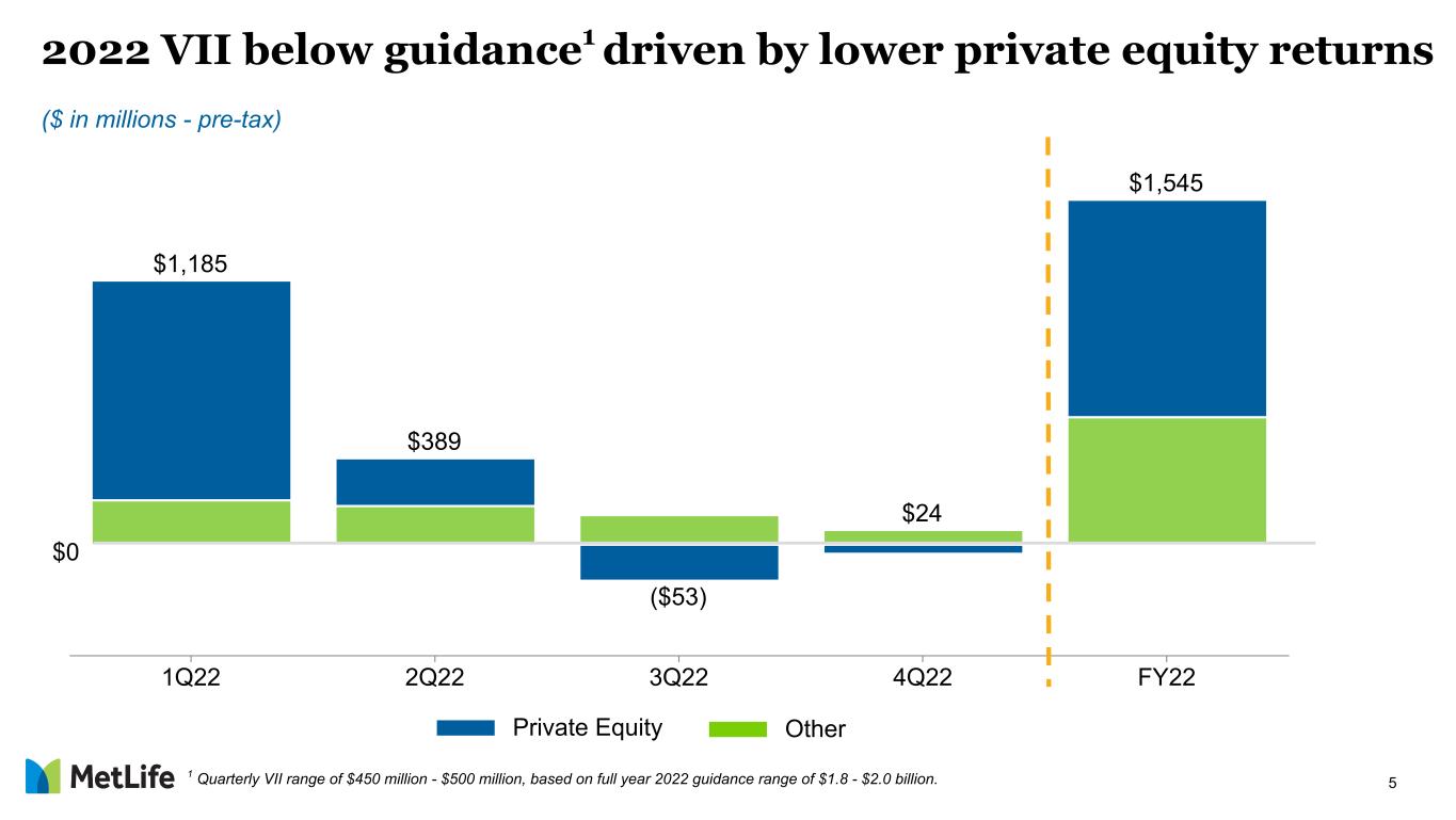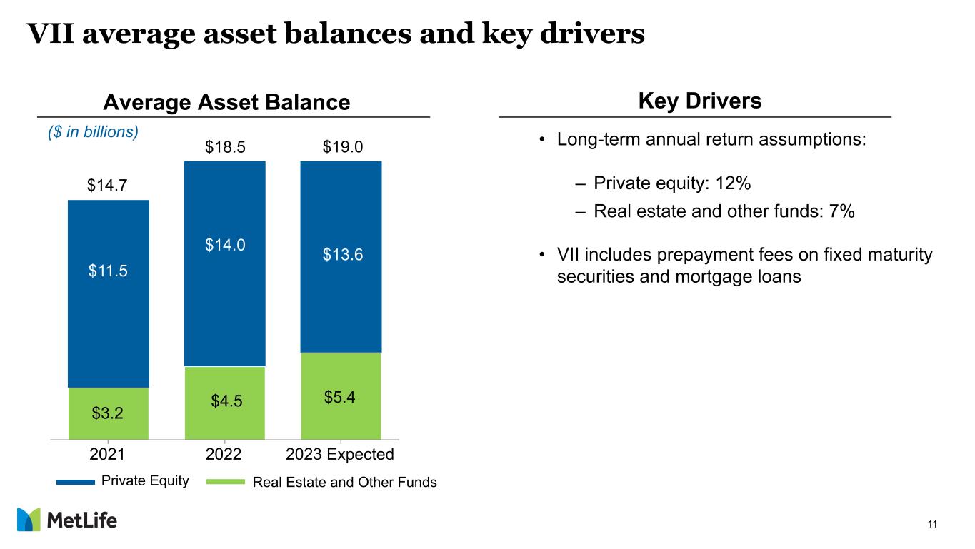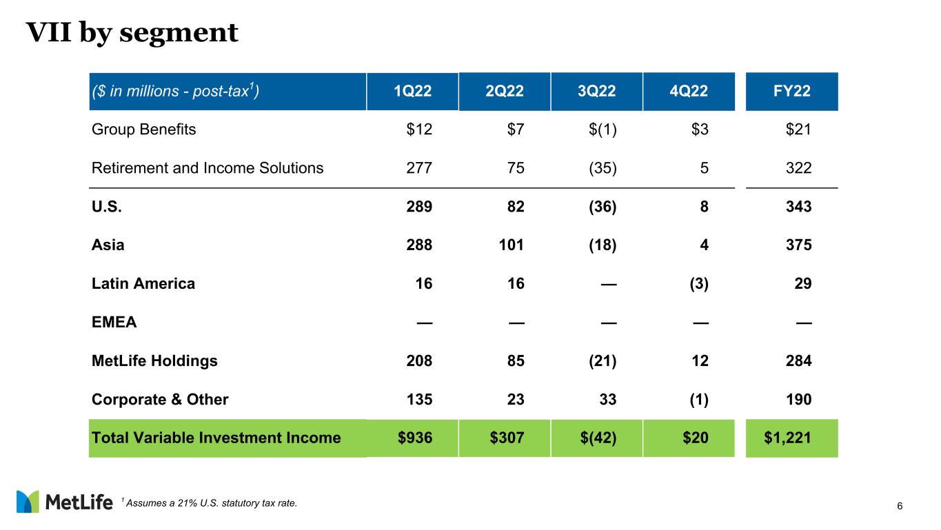 6 ($ in millions - post-tax1) 1Q22 2Q22 3Q22 4Q22 FY22 Group Benefits $12 $7 $(1) $3 $21 Retirement and Income Solutions 277 75 (35) 5 322 U.S. 289 82 (36) 8 343 Asia 288 101 (18) 4 375 Latin America 16 16 — (3) 29 EMEA — — — — — MetLife Holdings 208 85 (21) 12 284 Corporate & Other 135 23 33 (1) 190 Total Variable Investment Income $936 $307 $(42) $20 $1,221 1 Assumes a 21% U.S. statutory tax rate. VII by segment