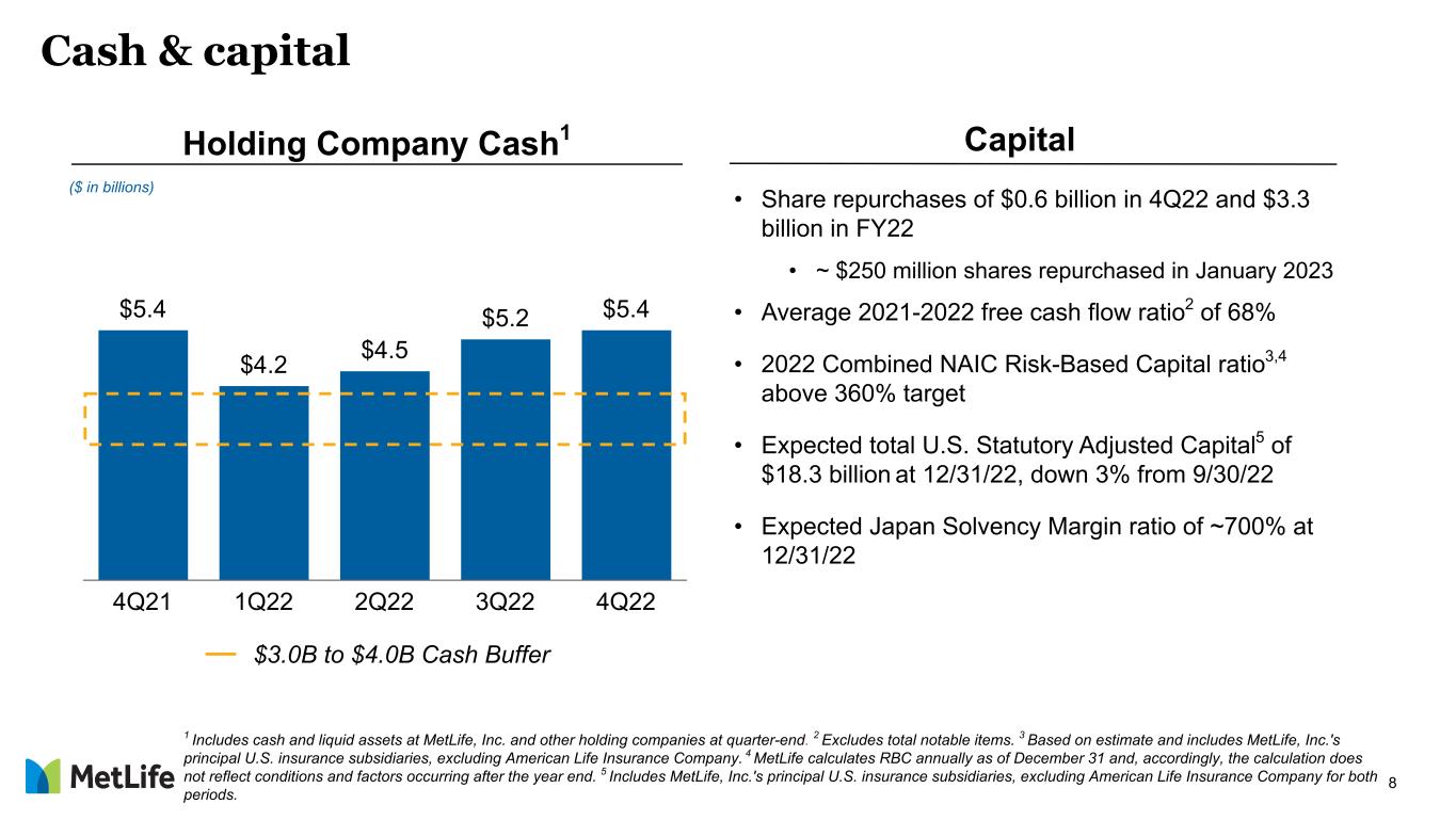 8 Holding Company Cash1 $5.4 $4.2 $4.5 $5.2 $5.4 4Q21 1Q22 2Q22 3Q22 4Q22 Cash & capital 1 Includes cash and liquid assets at MetLife, Inc. and other holding companies at quarter-end. 2 Excludes total notable items. 3 Based on estimate and includes MetLife, Inc.'s principal U.S. insurance subsidiaries, excluding American Life Insurance Company. 4 MetLife calculates RBC annually as of December 31 and, accordingly, the calculation does not reflect conditions and factors occurring after the year end. 5 Includes MetLife, Inc.'s principal U.S. insurance subsidiaries, excluding American Life Insurance Company for both periods. $3.0B to $4.0B Cash Buffer Capital • Share repurchases of $0.6 billion in 4Q22 and $3.3 billion in FY22 • ~ $250 million shares repurchased in January 2023 • Average 2021-2022 free cash flow ratio2 of 68% • 2022 Combined NAIC Risk-Based Capital ratio3,4 above 360% target • Expected total U.S. Statutory Adjusted Capital5 of $18.3 billion at 12/31/22, down 3% from 9/30/22 • Expected Japan Solvency Margin ratio of ~700% at 12/31/22 ($ in billions)