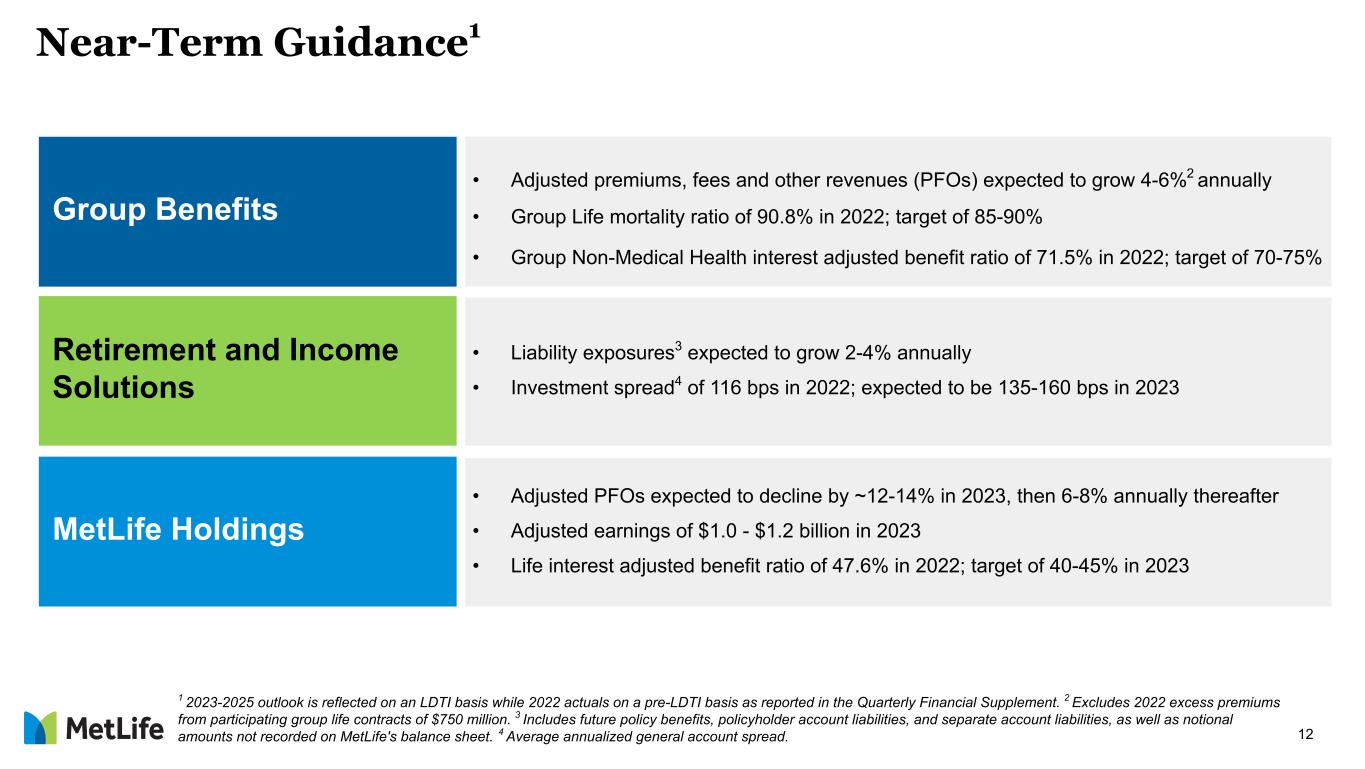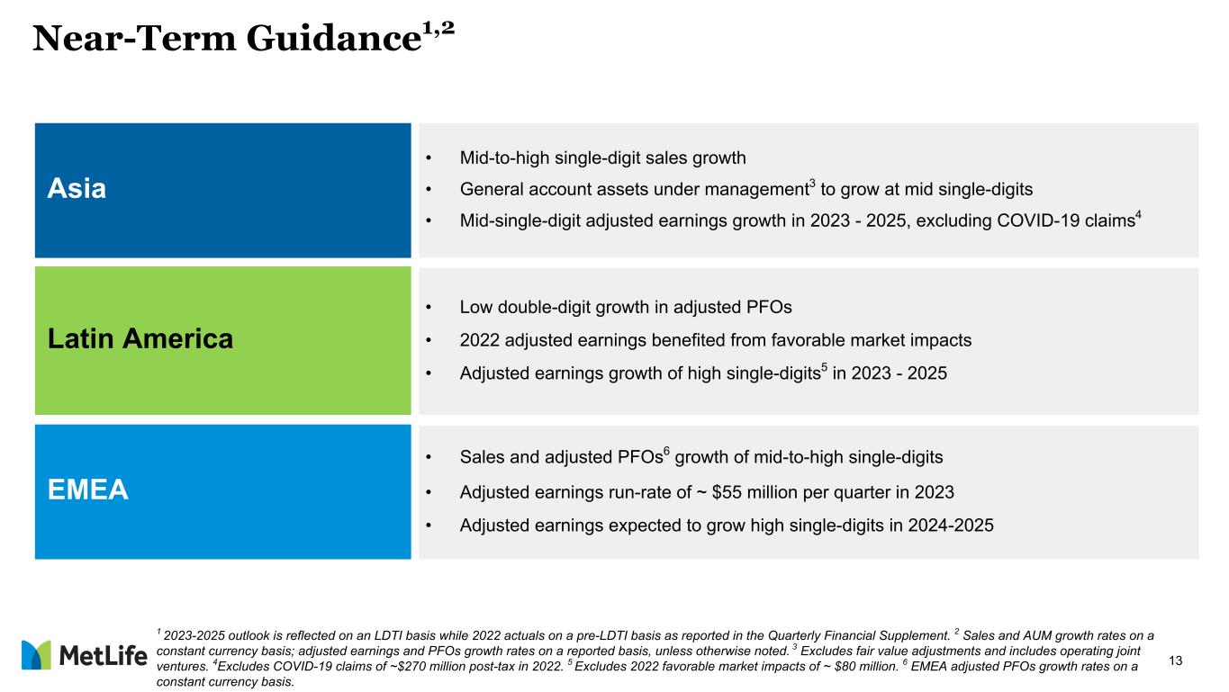 12 Near-Term Guidance1 • Adjusted premiums, fees and other revenues (PFOs) expected to grow 4-6%2 annually • Group Life mortality ratio of 90.8% in 2022; target of 85-90% • Group Non-Medical Health interest adjusted benefit ratio of 71.5% in 2022; target of 70-75% • Liability exposures3 expected to grow 2-4% annually • Investment spread4 of 116 bps in 2022; expected to be 135-160 bps in 2023 • Adjusted PFOs expected to decline by ~12-14% in 2023, then 6-8% annually thereafter • Adjusted earnings of $1.0 - $1.2 billion in 2023 • Life interest adjusted benefit ratio of 47.6% in 2022; target of 40-45% in 2023 Group Benefits Retirement and Income Solutions MetLife Holdings 1 2023-2025 outlook is reflected on an LDTI basis while 2022 actuals on a pre-LDTI basis as reported in the Quarterly Financial Supplement. 2 Excludes 2022 excess premiums from participating group life contracts of $750 million. 3 Includes future policy benefits, policyholder account liabilities, and separate account liabilities, as well as notional amounts not recorded on MetLife's balance sheet. 4 Average annualized general account spread.