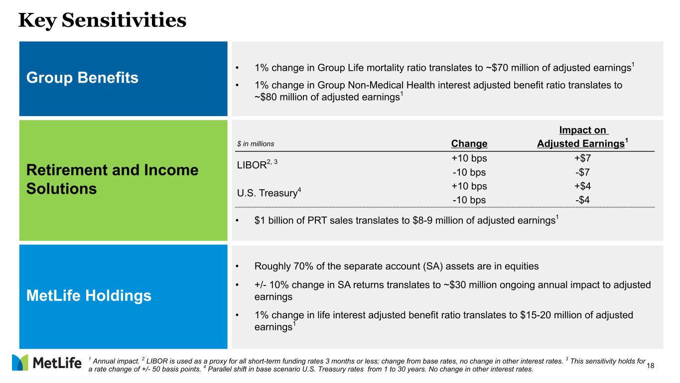 18 Key Sensitivities • 1% change in Group Life mortality ratio translates to ~$70 million of adjusted earnings1 • 1% change in Group Non-Medical Health interest adjusted benefit ratio translates to ~$80 million of adjusted earnings1 • Roughly 70% of the separate account (SA) assets are in equities • +/- 10% change in SA returns translates to ~$30 million ongoing annual impact to adjusted earnings • 1% change in life interest adjusted benefit ratio translates to $15-20 million of adjusted earnings1 Group Benefits Retirement and Income Solutions MetLife Holdings Impact on $ in millions Change Adjusted Earnings1 LIBOR2, 3 +10 bps +$7 -10 bps -$7 U.S. Treasury4 +10 bps +$4 -10 bps -$4 • $1 billion of PRT sales translates to $8-9 million of adjusted earnings1 1 Annual impact. 2 LIBOR is used as a proxy for all short-term funding rates 3 months or less; change from base rates, no change in other interest rates. 3 This sensitivity holds for a rate change of +/- 50 basis points. 4 Parallel shift in base scenario U.S. Treasury rates from 1 to 30 years. No change in other interest rates.