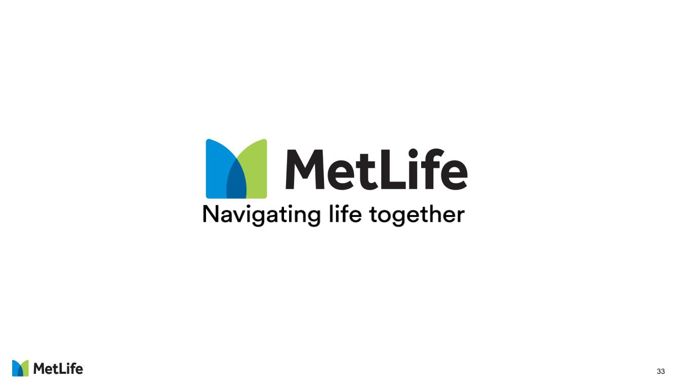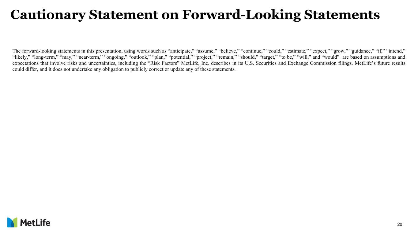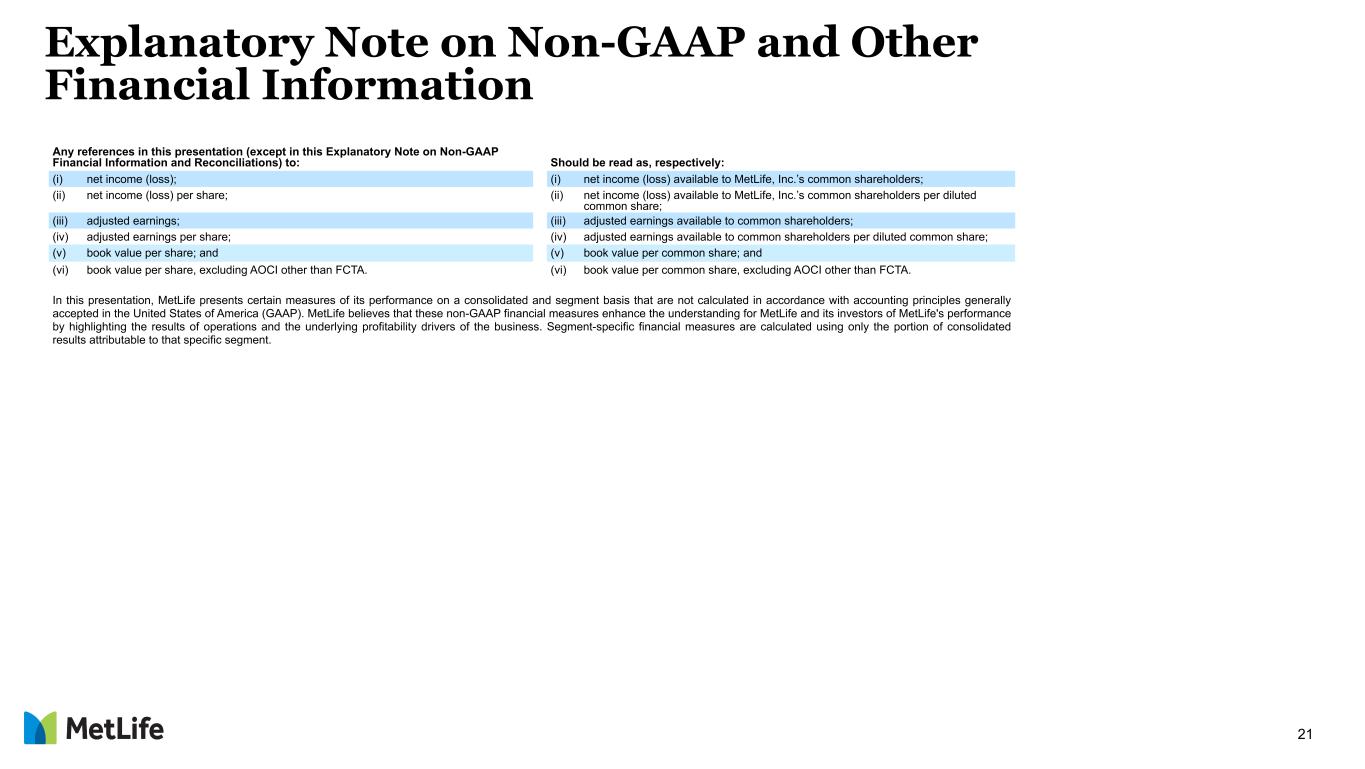 20 Cautionary Statement on Forward-Looking Statements The forward-looking statements in this presentation, using words such as “anticipate,” “assume,” “believe,” “continue,” “could,” “estimate,” “expect,” “grow,” “guidance,” “if,” “intend,” “likely,” “long-term,” “may,” “near-term,” “ongoing,” “outlook,” “plan,” “potential,” “project,” “remain,” “should,” “target,” “to be,” “will,” and “would” are based on assumptions and expectations that involve risks and uncertainties, including the “Risk Factors” MetLife, Inc. describes in its U.S. Securities and Exchange Commission filings. MetLife’s future results could differ, and it does not undertake any obligation to publicly correct or update any of these statements.