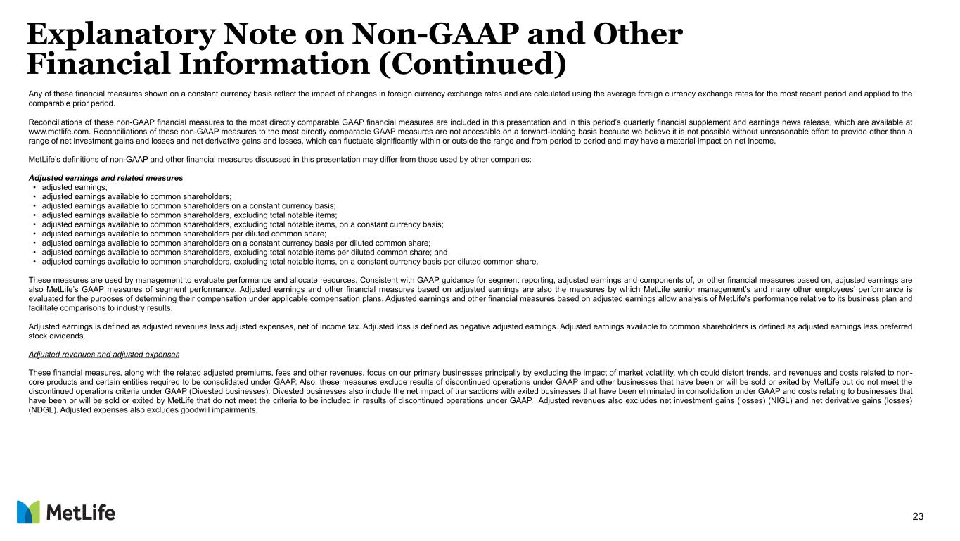 22 Explanatory Note on Non-GAAP and Other Financial Information (Continued) The following non-GAAP financial measures should not be viewed as substitutes for the most directly comparable financial measures calculated in accordance with GAAP: Non-GAAP financial measures: Comparable GAAP financial measures: (i) adjusted premiums, fees and other revenues; (i) premiums, fees and other revenues; (ii) adjusted premiums, fees and other revenues, excluding pension risk transfers (PRT); (ii) premiums, fees and other revenues; (iii) adjusted capitalization of deferred policy acquisition costs (DAC); (iii) capitalization of DAC; (iv) adjusted earnings available to common shareholders; (iv) net income (loss) available to MetLife, Inc.’s common shareholders; (v) adjusted earnings available to common shareholders, excluding total notable items; (v) net income (loss) available to MetLife, Inc.’s common shareholders; (vi) adjusted earnings available to common shareholders per diluted common share; (vi) net income (loss) available to MetLife, Inc.’s common shareholders per diluted common share; (vii) adjusted earnings available to common shareholders, excluding total notable items, per diluted common share; (vii) net income (loss) available to MetLife, Inc.’s common shareholders per diluted common share; (viii) total MetLife, Inc.’s common stockholders’ equity, excluding AOCI other than FCTA; (viii) total MetLife, Inc.’s stockholders’ equity; (ix) book value per common share, excluding AOCI other than FCTA; (ix) book value per common share; (x) free cash flows of all holding companies; (x) MetLife, Inc. (parent company only) net cash provided by (used in) operating activiites; (xi) adjusted other expenses; (xi) other expenses; (xii) adjusted other expenses, net of adjusted capitalization of DAC; (xii) other expenses, net of capitalization of DAC; (xiii) adjusted other expenses, net of adjusted capitalization of DAC, excluding total notable items related to adjusted other expenses; (xiii) other expenses, net of capitalization of DAC; (xiv) adjusted expense ratio; (xiv) expense ratio; (xv) adjusted expense ratio, excluding total notable items related to adjusted other expenses and PRT; (xv) expense ratio; (xvi) direct expenses; (xvi) other expenses; (xvii) direct expenses, excluding total notable items related to direct expenses; (xvii) other expenses; (xviii) direct expense ratio; and (xviii) expense ratio; and (xix) direct expense ratio, excluding total notable items related to direct expenses and PRT. (xix) expense ratio. (xx) free cash flows of all holding companies. (xx) MeLife, Inc. (parent company) net cash provided by (used in) operating activities.