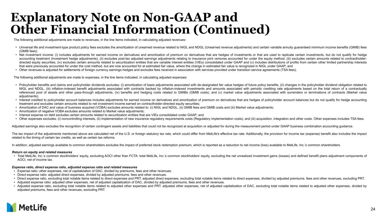 23 Any of these financial measures shown on a constant currency basis reflect the impact of changes in foreign currency exchange rates and are calculated using the average foreign currency exchange rates for the most recent period and applied to the comparable prior period. Reconciliations of these non-GAAP financial measures to the most directly comparable GAAP financial measures are included in this presentation and in this period’s quarterly financial supplement and earnings news release, which are available at www.metlife.com. Reconciliations of these non-GAAP measures to the most directly comparable GAAP measures are not accessible on a forward-looking basis because we believe it is not possible without unreasonable effort to provide other than a range of net investment gains and losses and net derivative gains and losses, which can fluctuate significantly within or outside the range and from period to period and may have a material impact on net income. MetLife’s definitions of non-GAAP and other financial measures discussed in this presentation may differ from those used by other companies: Adjusted earnings and related measures • adjusted earnings; • adjusted earnings available to common shareholders; • adjusted earnings available to common shareholders on a constant currency basis; • adjusted earnings available to common shareholders, excluding total notable items; • adjusted earnings available to common shareholders, excluding total notable items, on a constant currency basis; • adjusted earnings available to common shareholders per diluted common share; • adjusted earnings available to common shareholders on a constant currency basis per diluted common share; • adjusted earnings available to common shareholders, excluding total notable items per diluted common share; and • adjusted earnings available to common shareholders, excluding total notable items, on a constant currency basis per diluted common share. These measures are used by management to evaluate performance and allocate resources. Consistent with GAAP guidance for segment reporting, adjusted earnings and components of, or other financial measures based on, adjusted earnings are also MetLife’s GAAP measures of segment performance. Adjusted earnings and other financial measures based on adjusted earnings are also the measures by which MetLife senior management’s and many other employees’ performance is evaluated for the purposes of determining their compensation under applicable compensation plans. Adjusted earnings and other financial measures based on adjusted earnings allow analysis of MetLife's performance relative to its business plan and facilitate comparisons to industry results. Adjusted earnings is defined as adjusted revenues less adjusted expenses, net of income tax. Adjusted loss is defined as negative adjusted earnings. Adjusted earnings available to common shareholders is defined as adjusted earnings less preferred stock dividends. Adjusted revenues and adjusted expenses These financial measures, along with the related adjusted premiums, fees and other revenues, focus on our primary businesses principally by excluding the impact of market volatility, which could distort trends, and revenues and costs related to non- core products and certain entities required to be consolidated under GAAP. Also, these measures exclude results of discontinued operations under GAAP and other businesses that have been or will be sold or exited by MetLife but do not meet the discontinued operations criteria under GAAP (Divested businesses). Divested businesses also include the net impact of transactions with exited businesses that have been eliminated in consolidation under GAAP and costs relating to businesses that have been or will be sold or exited by MetLife that do not meet the criteria to be included in results of discontinued operations under GAAP. Adjusted revenues also excludes net investment gains (losses) (NIGL) and net derivative gains (losses) (NDGL). Adjusted expenses also excludes goodwill impairments. Explanatory Note on Non-GAAP and Other Financial Information (Continued)