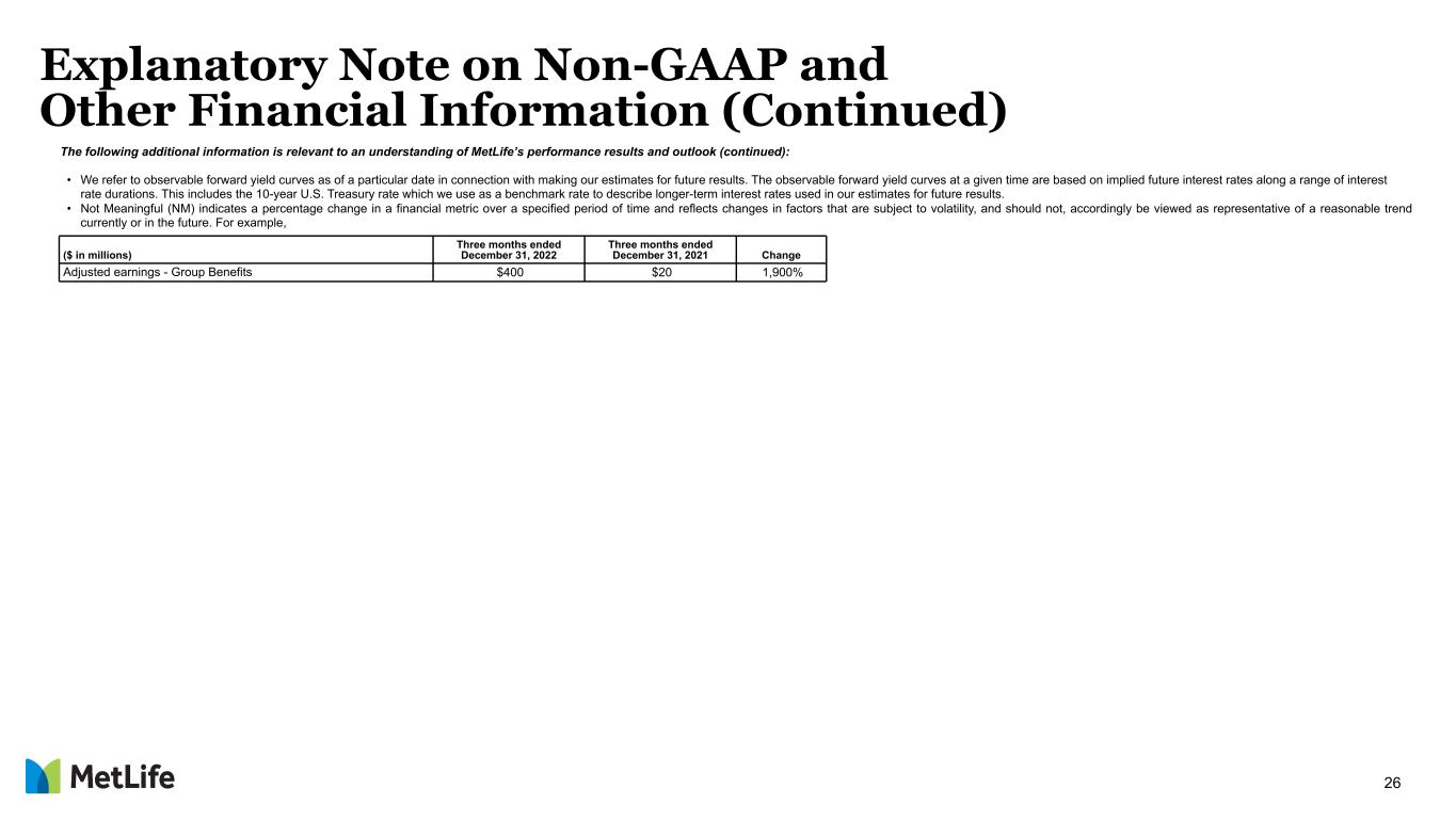 26 Explanatory Note on Non-GAAP and Other Financial Information (Continued) The following additional information is relevant to an understanding of MetLife’s performance results and outlook (continued): • We refer to observable forward yield curves as of a particular date in connection with making our estimates for future results. The observable forward yield curves at a given time are based on implied future interest rates along a range of interest rate durations. This includes the 10-year U.S. Treasury rate which we use as a benchmark rate to describe longer-term interest rates used in our estimates for future results. • Not Meaningful (NM) indicates a percentage change in a financial metric over a specified period of time and reflects changes in factors that are subject to volatility, and should not, accordingly be viewed as representative of a reasonable trend currently or in the future. For example, ($ in millions) Three months ended December 31, 2022 Three months ended December 31, 2021 Change Adjusted earnings - Group Benefits $400 $20 1,900%