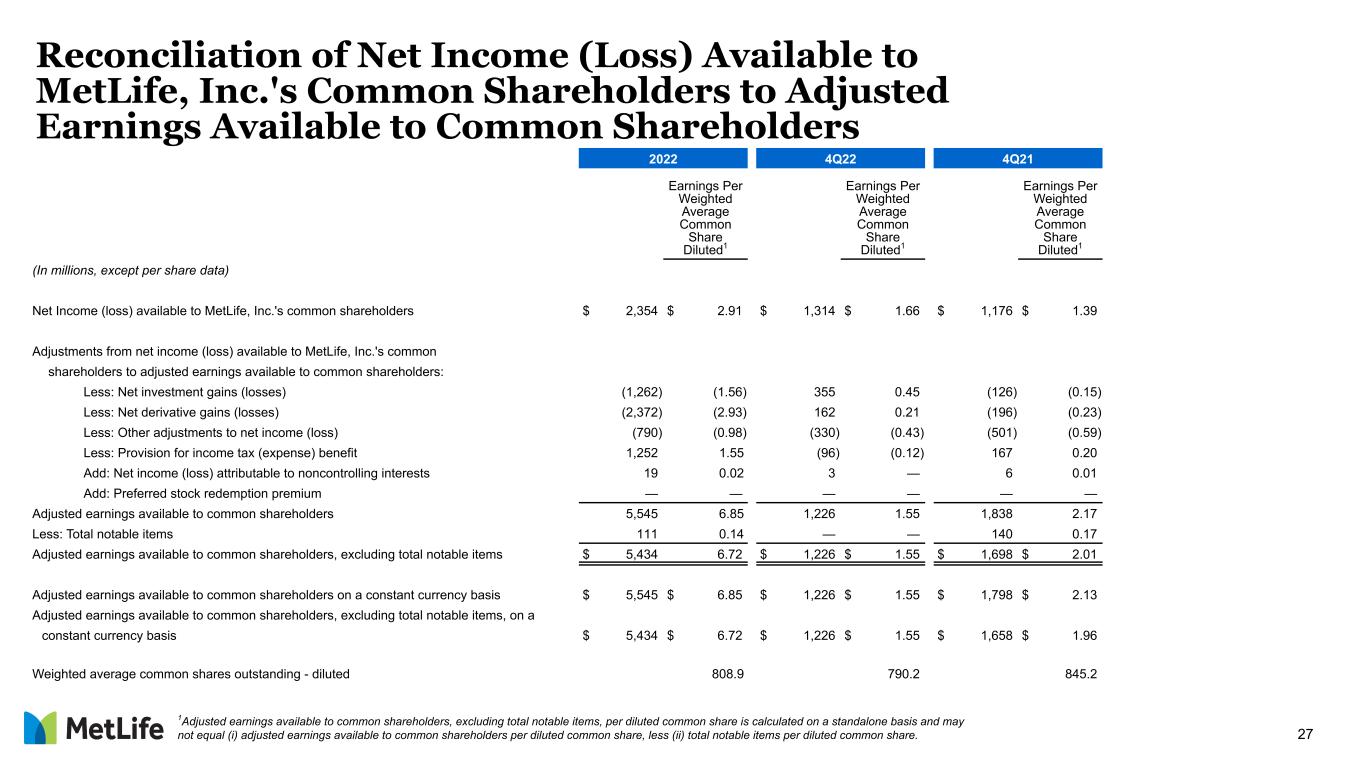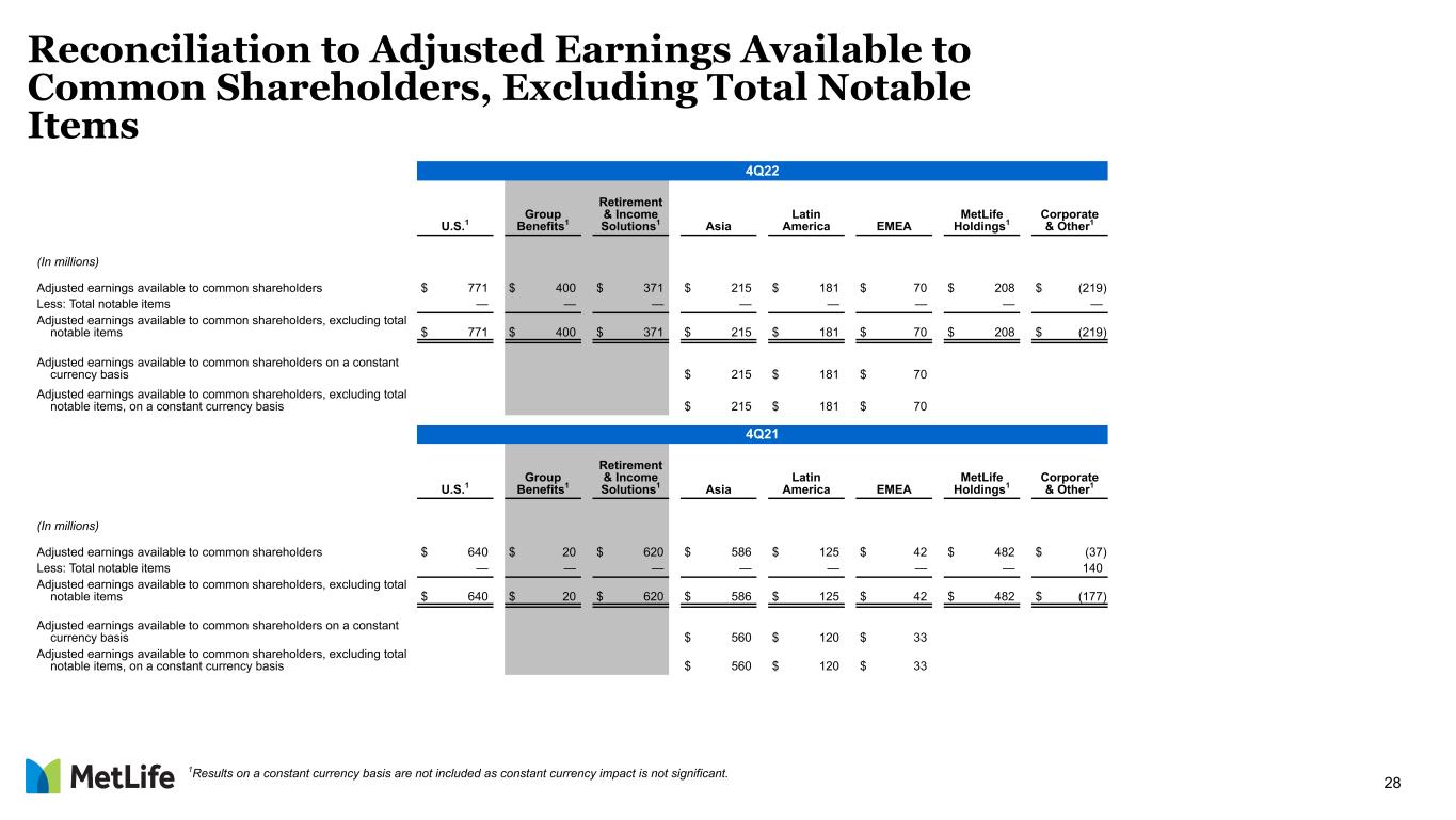 27 Reconciliation of Net Income (Loss) Available to MetLife, Inc.'s Common Shareholders to Adjusted Earnings Available to Common Shareholders 2022 4Q22 4Q21 Earnings Per Weighted Average Common Share Diluted1 Earnings Per Weighted Average Common Share Diluted1 Earnings Per Weighted Average Common Share Diluted1 (In millions, except per share data) Net Income (loss) available to MetLife, Inc.'s common shareholders $ 2,354 $ 2.91 $ 1,314 $ 1.66 $ 1,176 $ 1.39 Adjustments from net income (loss) available to MetLife, Inc.'s common shareholders to adjusted earnings available to common shareholders: Less: Net investment gains (losses) (1,262) (1.56) 355 0.45 (126) (0.15) Less: Net derivative gains (losses) (2,372) (2.93) 162 0.21 (196) (0.23) Less: Other adjustments to net income (loss) (790) (0.98) (330) (0.43) (501) (0.59) Less: Provision for income tax (expense) benefit 1,252 1.55 (96) (0.12) 167 0.20 Add: Net income (loss) attributable to noncontrolling interests 19 0.02 3 — 6 0.01 Add: Preferred stock redemption premium — — — — — — Adjusted earnings available to common shareholders 5,545 6.85 1,226 1.55 1,838 2.17 Less: Total notable items 111 0.14 — — 140 0.17 Adjusted earnings available to common shareholders, excluding total notable items $ 5,434 6.72 $ 1,226 $ 1.55 $ 1,698 $ 2.01 Adjusted earnings available to common shareholders on a constant currency basis $ 5,545 $ 6.85 $ 1,226 $ 1.55 $ 1,798 $ 2.13 Adjusted earnings available to common shareholders, excluding total notable items, on a $ 5,434 $ 6.72 $ 1,226 $ 1.55 $ 1,658 $ 1.96 constant currency basis Weighted average common shares outstanding - diluted 808.9 790.2 845.2 1Adjusted earnings available to common shareholders, excluding total notable items, per diluted common share is calculated on a standalone basis and may not equal (i) adjusted earnings available to common shareholders per diluted common share, less (ii) total notable items per diluted common share.