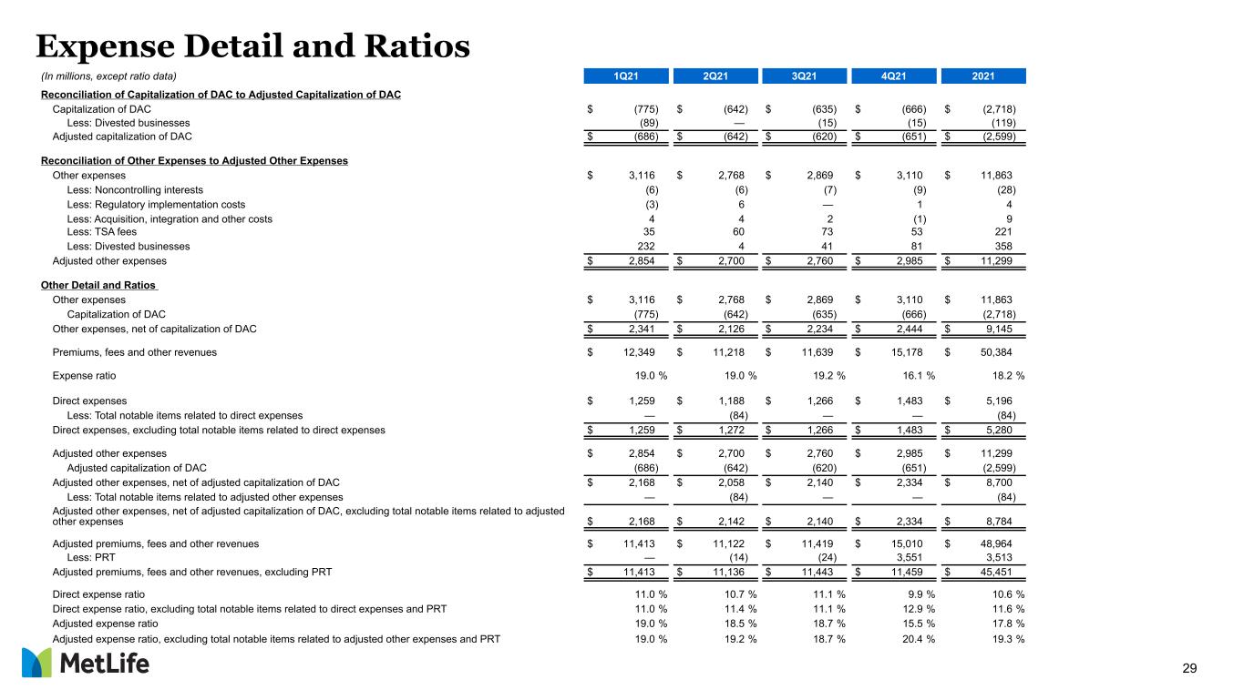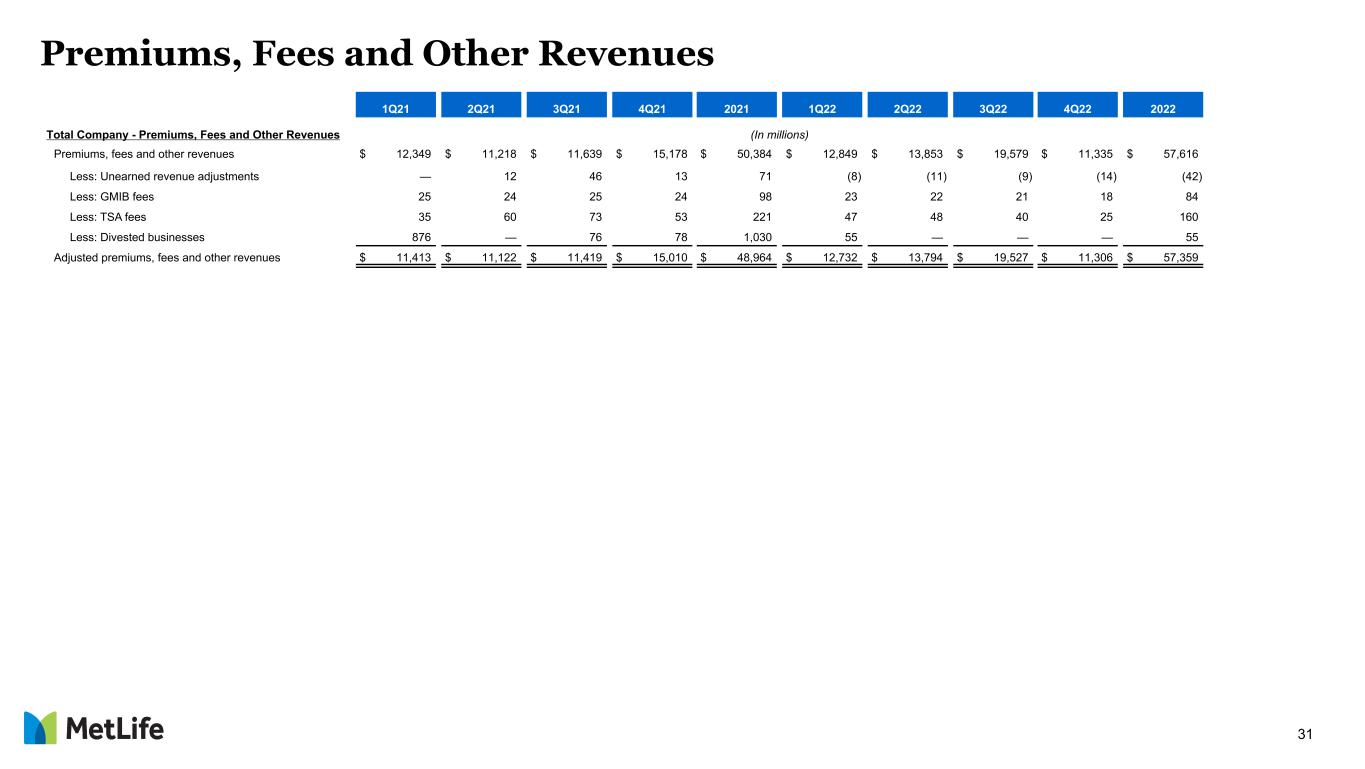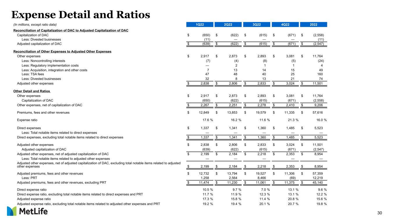 30 Expense Detail and Ratios (In millions, except ratio data) 1Q22 2Q22 3Q22 4Q22 2022 Reconciliation of Capitalization of DAC to Adjusted Capitalization of DAC Capitalization of DAC $ (650) $ (622) $ (615) $ (671) $ (2,558) Less: Divested businesses (11) — — — (11) Adjusted capitalization of DAC $ (639) $ (622) $ (615) $ (671) $ (2,547) Reconciliation of Other Expenses to Adjusted Other Expenses Other expenses $ 2,917 $ 2,873 $ 2,893 $ 3,081 $ 11,764 Less: Noncontrolling interests (7) (4) (8) (5) (24) Less: Regulatory implementation costs — 2 1 1 4 Less: Acquisition, integration and other costs 7 13 14 15 49 Less: TSA fees 47 48 40 25 160 Less: Divested businesses 32 8 13 21 74 Adjusted other expenses $ 2,838 $ 2,806 $ 2,833 $ 3,024 $ 11,501 Other Detail and Ratios Other expenses $ 2,917 $ 2,873 $ 2,893 $ 3,081 $ 11,764 Capitalization of DAC (650) (622) (615) (671) (2,558) Other expenses, net of capitalization of DAC $ 2,267 $ 2,251 $ 2,278 $ 2,410 $ 9,206 Premiums, fees and other revenues $ 12,849 $ 13,853 $ 19,579 $ 11,335 $ 57,616 Expense ratio 17.6 % 16.2 % 11.6 % 21.3 % 16.0 % Direct expenses $ 1,337 $ 1,341 $ 1,360 $ 1,485 $ 5,523 Less: Total notable items related to direct expenses — — — — — Direct expenses, excluding total notable items related to direct expenses $ 1,337 $ 1,341 $ 1,360 $ 1,485 $ 5,523 Adjusted other expenses $ 2,838 $ 2,806 $ 2,833 $ 3,024 $ 11,501 Adjusted capitalization of DAC (639) (622) (615) (671) (2,547) Adjusted other expenses, net of adjusted capitalization of DAC $ 2,199 $ 2,184 $ 2,218 $ 2,353 $ 8,954 Less: Total notable items related to adjusted other expenses — — — — — Adjusted other expenses, net of adjusted capitalization of DAC, excluding total notable items related to adjusted other expenses $ 2,199 $ 2,184 $ 2,218 $ 2,353 $ 8,954 Adjusted premiums, fees and other revenues $ 12,732 $ 13,794 $ 19,527 $ 11,306 $ 57,359 Less: PRT 1,258 2,564 8,466 (69) 12,219 Adjusted premiums, fees and other revenues, excluding PRT $ 11,474 $ 11,230 $ 11,061 $ 11,375 $ 45,140 Direct expense ratio 10.5 % 9.7 % 7.0 % 13.1 % 9.6 % Direct expense ratio, excluding total notable items related to direct expenses and PRT 11.7 % 11.9 % 12.3 % 13.1 % 12.2 % Adjusted expense ratio 17.3 % 15.8 % 11.4 % 20.8 % 15.6 % Adjusted expense ratio, excluding total notable items related to adjusted other expenses and PRT 19.2 % 19.4 % 20.1 % 20.7 % 19.8 %