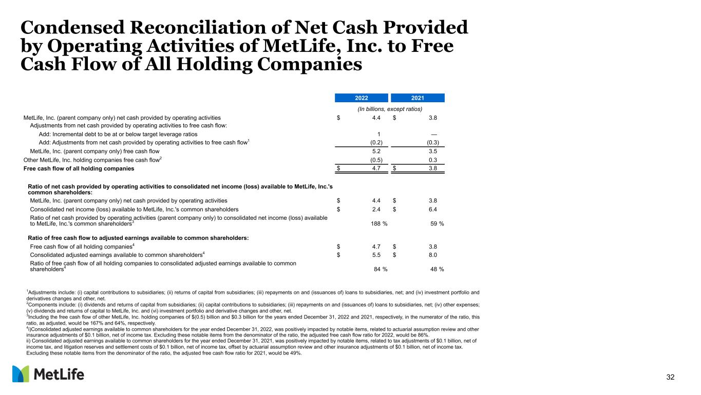 32 Condensed Reconciliation of Net Cash Provided by Operating Activities of MetLife, Inc. to Free Cash Flow of All Holding Companies 2022 2021 (In billions, except ratios) MetLife, Inc. (parent company only) net cash provided by operating activities $ 4.4 $ 3.8 Adjustments from net cash provided by operating activities to free cash flow: Add: Incremental debt to be at or below target leverage ratios 1 — Add: Adjustments from net cash provided by operating activities to free cash flow1 (0.2) (0.3) MetLife, Inc. (parent company only) free cash flow 5.2 3.5 Other MetLife, Inc. holding companies free cash flow2 (0.5) 0.3 Free cash flow of all holding companies $ 4.7 $ 3.8 Ratio of net cash provided by operating activities to consolidated net income (loss) available to MetLife, Inc.'s common shareholders: MetLife, Inc. (parent company only) net cash provided by operating activities $ 4.4 $ 3.8 Consolidated net income (loss) available to MetLife, Inc.'s common shareholders $ 2.4 $ 6.4 Ratio of net cash provided by operating activities (parent company only) to consolidated net income (loss) available to MetLife, Inc.'s common shareholders3 188 % 59 % Ratio of free cash flow to adjusted earnings available to common shareholders: Free cash flow of all holding companies4 $ 4.7 $ 3.8 Consolidated adjusted earnings available to common shareholders4 $ 5.5 $ 8.0 Ratio of free cash flow of all holding companies to consolidated adjusted earnings available to common shareholders4 84 % 48 % 1Adjustments include: (i) capital contributions to subsidiaries; (ii) returns of capital from subsidiaries; (iii) repayments on and (issuances of) loans to subsidiaries, net; and (iv) investment portfolio and derivatives changes and other, net. 2Components include: (i) dividends and returns of capital from subsidiaries; (ii) capital contributions to subsidiaries; (iii) repayments on and (issuances of) loans to subsidiaries, net; (iv) other expenses; (v) dividends and returns of capital to MetLife, Inc. and (vi) investment portfolio and derivative changes and other, net. 3Including the free cash flow of other MetLife, Inc. holding companies of $(0.5) billion and $0.3 billion for the years ended December 31, 2022 and 2021, respectively, in the numerator of the ratio, this ratio, as adjusted, would be 167% and 64%, respectively. 4i)Consolidated adjusted earnings available to common shareholders for the year ended December 31, 2022, was positively impacted by notable items, related to actuarial assumption review and other insurance adjustments of $0.1 billion, net of income tax. Excluding these notable items from the denominator of the ratio, the adjusted free cash flow ratio for 2022, would be 86%. ii) Consolidated adjusted earnings available to common shareholders for the year ended December 31, 2021, was positively impacted by notable items, related to tax adjustments of $0.1 billion, net of income tax, and litigation reserves and settlement costs of $0.1 billion, net of income tax, offset by actuarial assumption review and other insurance adjustments of $0.1 billion, net of income tax. Excluding these notable items from the denominator of the ratio, the adjusted free cash flow ratio for 2021, would be 49%.
