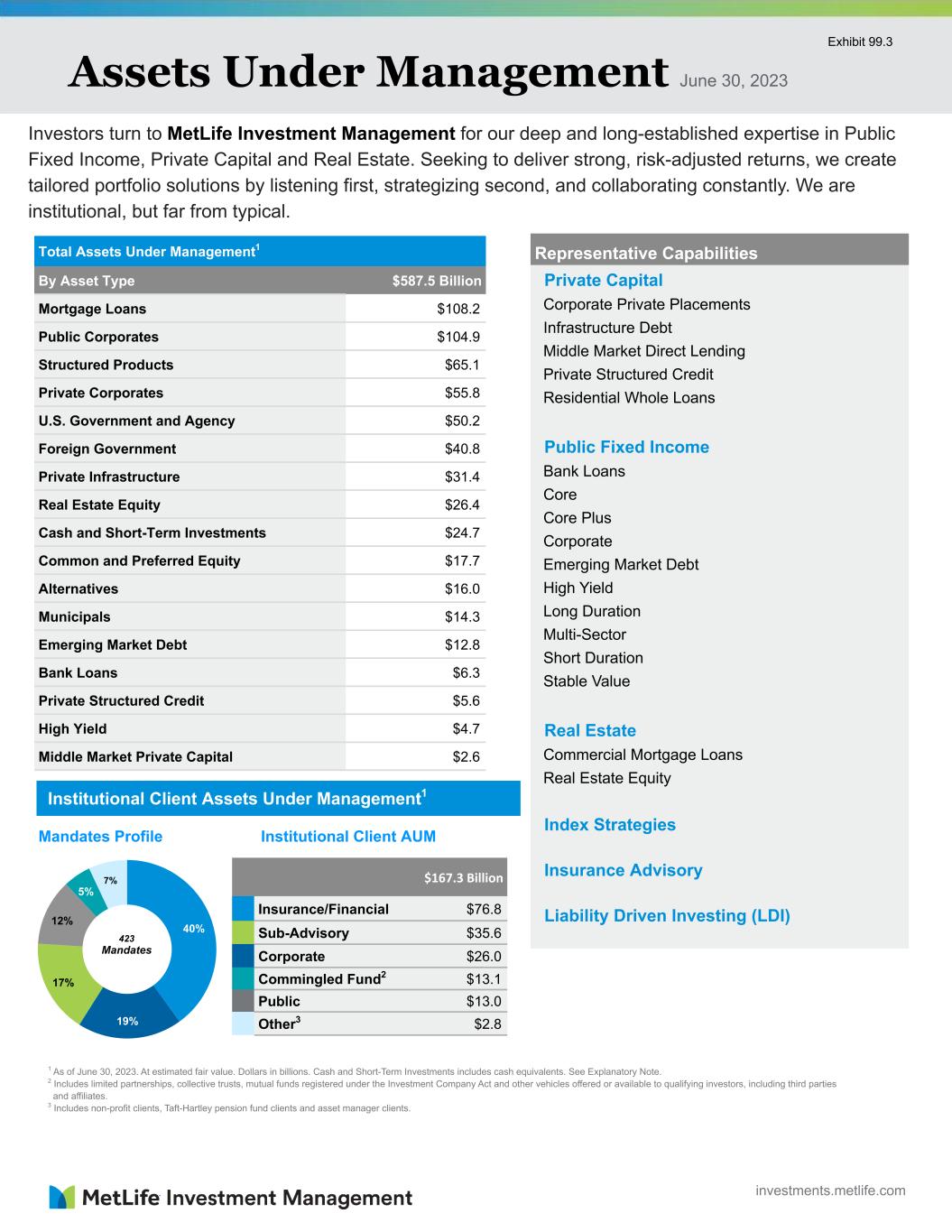 Assets Under Management June 30, 2023 Investors turn to MetLife Investment Management for our deep and long-established expertise in Public Fixed Income, Private Capital and Real Estate. Seeking to deliver strong, risk-adjusted returns, we create tailored portfolio solutions by listening first, strategizing second, and collaborating constantly. We are institutional, but far from typical. Total Assets Under Management1 By Asset Type $587.5 Billion Mortgage Loans $108.2 Public Corporates $104.9 Structured Products $65.1 Private Corporates $55.8 U.S. Government and Agency $50.2 Foreign Government $40.8 Private Infrastructure $31.4 Real Estate Equity $26.4 Cash and Short-Term Investments $24.7 Common and Preferred Equity $17.7 Alternatives $16.0 Municipals $14.3 Emerging Market Debt $12.8 Bank Loans $6.3 Private Structured Credit $5.6 High Yield $4.7 Middle Market Private Capital $2.6 Institutional Client Assets Under Management1 $167.3 Billion Insurance/Financial $76.8 Sub-Advisory $35.6 Corporate $26.0 Commingled Fund2 $13.1 Public $13.0 Other3 $2.8 1 As of June 30, 2023. At estimated fair value. Dollars in billions. Cash and Short-Term Investments includes cash equivalents. See Explanatory Note. 2 Includes limited partnerships, collective trusts, mutual funds registered under the Investment Company Act and other vehicles offered or available to qualifying investors, including third parties and affiliates. 3 Includes non-profit clients, Taft-Hartley pension fund clients and asset manager clients. 423 Mandates Representative Capabilities Private Capital Corporate Private Placements Infrastructure Debt Middle Market Direct Lending Private Structured Credit Residential Whole Loans Public Fixed Income Bank Loans Core Core Plus Corporate Emerging Market Debt High Yield Long Duration Multi-Sector Short Duration Stable Value Real Estate Commercial Mortgage Loans Real Estate Equity Index Strategies Insurance Advisory Liability Driven Investing (LDI) 40% 19% 17% 12% 5% 7% Mandates Profile Institutional Client AUM investments.metlife.com Exhibit 99.3