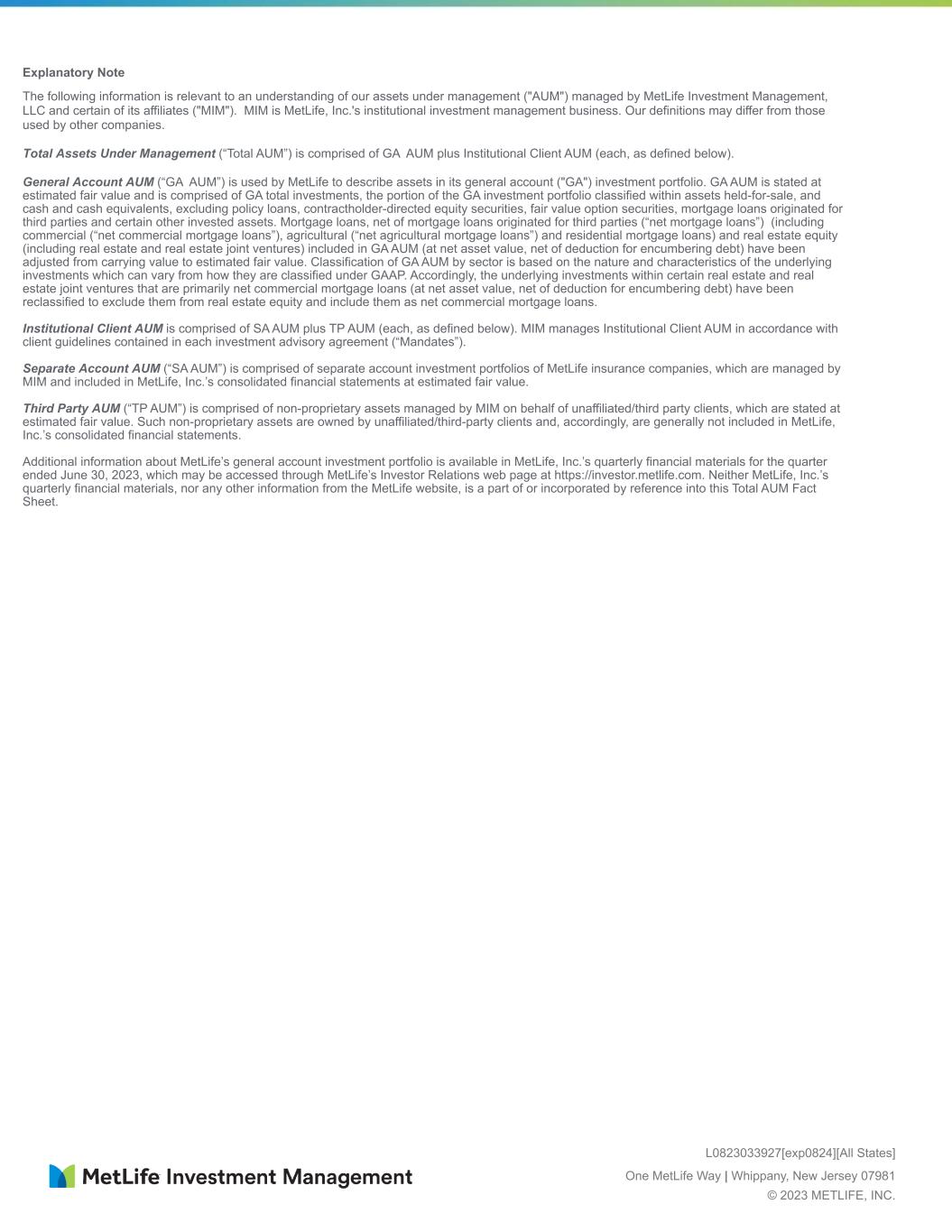 Explanatory Note The following information is relevant to an understanding of our assets under management ("AUM") managed by MetLife Investment Management, LLC and certain of its affiliates ("MIM"). MIM is MetLife, Inc.'s institutional investment management business. Our definitions may differ from those used by other companies. Total Assets Under Management (“Total AUM”) is comprised of GA AUM plus Institutional Client AUM (each, as defined below). General Account AUM (“GA AUM”) is used by MetLife to describe assets in its general account ("GA") investment portfolio. GA AUM is stated at estimated fair value and is comprised of GA total investments, the portion of the GA investment portfolio classified within assets held-for-sale, and cash and cash equivalents, excluding policy loans, contractholder-directed equity securities, fair value option securities, mortgage loans originated for third parties and certain other invested assets. Mortgage loans, net of mortgage loans originated for third parties (“net mortgage loans”) (including commercial (“net commercial mortgage loans”), agricultural (“net agricultural mortgage loans”) and residential mortgage loans) and real estate equity (including real estate and real estate joint ventures) included in GA AUM (at net asset value, net of deduction for encumbering debt) have been adjusted from carrying value to estimated fair value. Classification of GA AUM by sector is based on the nature and characteristics of the underlying investments which can vary from how they are classified under GAAP. Accordingly, the underlying investments within certain real estate and real estate joint ventures that are primarily net commercial mortgage loans (at net asset value, net of deduction for encumbering debt) have been reclassified to exclude them from real estate equity and include them as net commercial mortgage loans. Institutional Client AUM is comprised of SA AUM plus TP AUM (each, as defined below). MIM manages Institutional Client AUM in accordance with client guidelines contained in each investment advisory agreement (“Mandates”). Separate Account AUM (“SA AUM”) is comprised of separate account investment portfolios of MetLife insurance companies, which are managed by MIM and included in MetLife, Inc.’s consolidated financial statements at estimated fair value. Third Party AUM (“TP AUM”) is comprised of non-proprietary assets managed by MIM on behalf of unaffiliated/third party clients, which are stated at estimated fair value. Such non-proprietary assets are owned by unaffiliated/third-party clients and, accordingly, are generally not included in MetLife, Inc.’s consolidated financial statements. Additional information about MetLife’s general account investment portfolio is available in MetLife, Inc.’s quarterly financial materials for the quarter ended June 30, 2023, which may be accessed through MetLife’s Investor Relations web page at https://investor.metlife.com. Neither MetLife, Inc.’s quarterly financial materials, nor any other information from the MetLife website, is a part of or incorporated by reference into this Total AUM Fact Sheet. L0823033927[exp0824][All States] One MetLife Way | Whippany, New Jersey 07981 © 2023 METLIFE, INC.