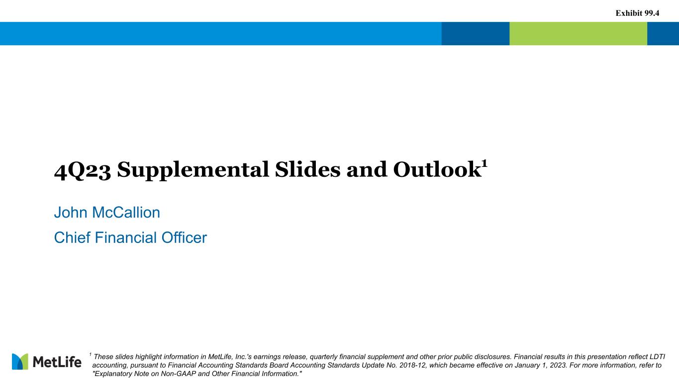 4Q23 Supplemental Slides and Outlook1 John McCallion Chief Financial Officer Exhibit 99.4 1 These slides highlight information in MetLife, Inc.'s earnings release, quarterly financial supplement and other prior public disclosures. Financial results in this presentation reflect LDTI accounting, pursuant to Financial Accounting Standards Board Accounting Standards Update No. 2018-12, which became effective on January 1, 2023. For more information, refer to "Explanatory Note on Non-GAAP and Other Financial Information."