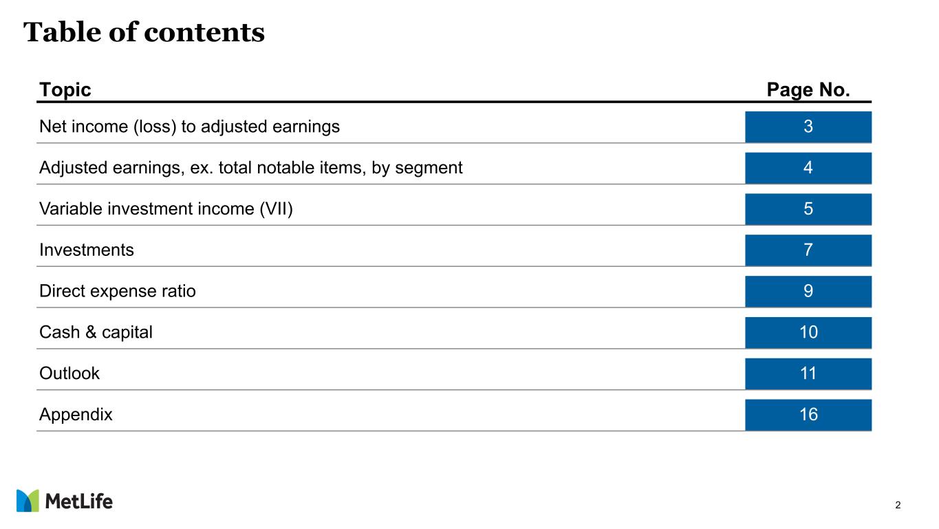 25 Explanatory Note on Non-GAAP and Other Financial Information (Continued) Asymmetrical and non-economic accounting adjustments are made to the line items indicated in calculating adjusted earnings: • Net investment income includes earned income on derivatives and amortization of premium on derivatives that are hedges of investments or that are used to replicate certain investments, but do not qualify for hedge accounting treatment ("Investment hedge adjustments"). • Other revenues include settlements of foreign currency earnings hedges and exclude asymmetrical accounting associated with in-force reinsurance. • Policyholder benefits and claims excludes (i) amortization of basis adjustments associated with de-designated fair value hedges of future policy benefits, (ii) inflation-indexed benefit adjustments associated with contracts backed by inflation- indexed investments, (iii) asymmetrical accounting associated with in-force reinsurance, and (iv) non-economic losses incurred at contract inception for certain single premium annuity business. These losses are amortized into adjusted earnings within policyholder benefits and claims over the estimated lives of the contracts. • Interest credited to policyholder account balances excludes amounts associated with periodic crediting rate adjustments based on the total return of a contractually referenced pool of assets and other pass-through adjustments and asymmetrical accounting associated with in-force reinsurance. Divested businesses are those that have been or will be sold or exited by MetLife but do not meet the discontinued operations criteria under GAAP. Divested businesses also include the net impact of transactions with exited businesses that have been eliminated in consolidation under GAAP and costs relating to businesses that have been or will be sold or exited by MetLife that do not meet the criteria to be included in results of discontinued operations under GAAP. Other adjustments are made to the line items indicated in calculating adjusted earnings: • Net investment income and interest credited to policyholder account balances excludes certain amounts related to contractholder-directed equity securities ("Unit-linked contract income") and ("Unit-linked contract costs"). • Other revenues include fee revenue on synthetic GICs accounted for as freestanding derivatives. • Other revenues exclude and other expenses include fees received in connection with services provided under transition service agreements. • Other expenses exclude (i) implementation of new insurance regulatory requirements and other costs, and (ii) acquisition, integration and other related costs. Other expenses include (i) deductions for net income attributable to noncontrolling interests, and (ii) benefits accrued on synthetic GICs accounted for as freestanding derivatives. Adjusted earnings also excludes the recognition of certain contingent assets and liabilities that could not be recognized at acquisition or adjusted for during the measurement period under GAAP business combination accounting guidance. The tax impact of the adjustments mentioned above are calculated net of the U.S. or foreign statutory tax rate, which could differ from MetLife's effective tax rate. Additionally, the provision for income tax (expense) benefit also includes the impact related to the timing of certain tax credits, as well as certain tax reforms. In addition, adjusted earnings available to common shareholders excludes the impact of preferred stock redemption premium, which is reported as a reduction to net income (loss) available to MetLife, Inc.’s common shareholders. Investment portfolio gains (losses) and derivative gains (losses) These are measures of investment and hedging activity. Investment portfolio gains (losses) principally excludes amounts that are reported within net investment gains (losses) but do not relate to the performance of the investment portfolio, such as gains (losses) on sales and divestitures of businesses, as well as investment portfolio gains (losses) of divested businesses. Derivative gains (losses) principally excludes earned income on derivatives and amortization of premium on derivatives, where such derivatives are either hedges of investments or are used to replicate certain investments, and where such derivatives do not qualify for hedge accounting. This earned income and amortization of premium is reported within adjusted earnings and not within derivative gains (losses).