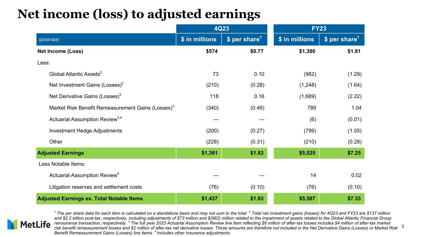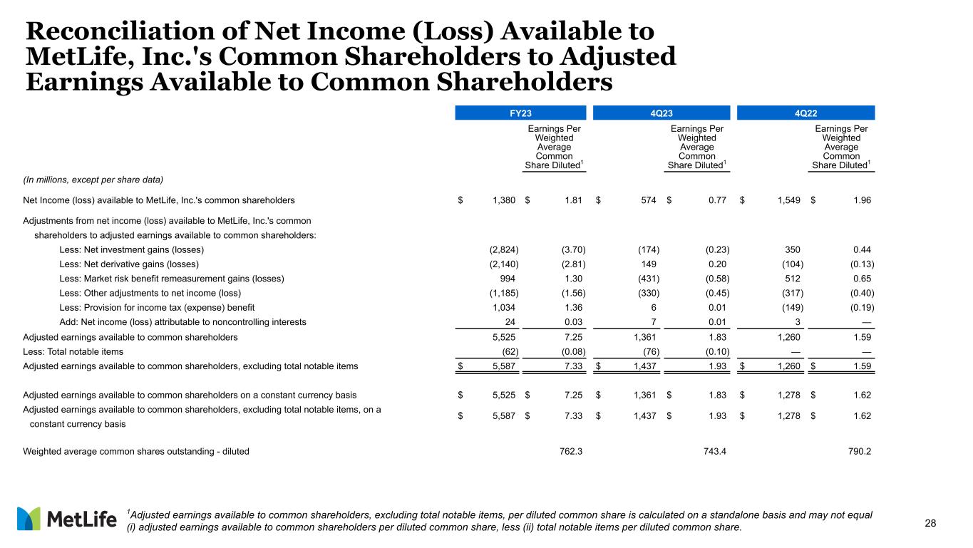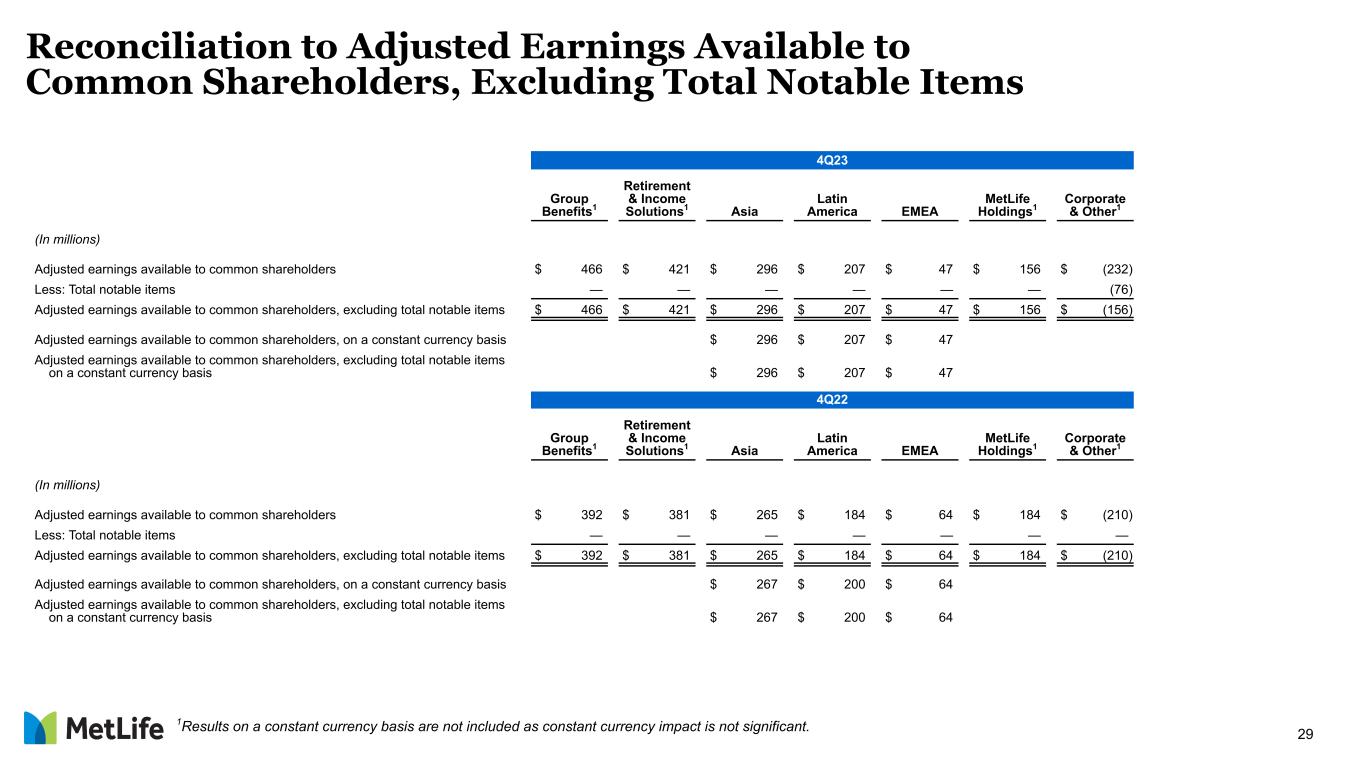 28 Reconciliation of Net Income (Loss) Available to MetLife, Inc.'s Common Shareholders to Adjusted Earnings Available to Common Shareholders FY23 4Q23 4Q22 Earnings Per Weighted Average Common Share Diluted1 Earnings Per Weighted Average Common Share Diluted1 Earnings Per Weighted Average Common Share Diluted1 (In millions, except per share data) Net Income (loss) available to MetLife, Inc.'s common shareholders $ 1,380 $ 1.81 $ 574 $ 0.77 $ 1,549 $ 1.96 Adjustments from net income (loss) available to MetLife, Inc.'s common shareholders to adjusted earnings available to common shareholders: Less: Net investment gains (losses) (2,824) (3.70) (174) (0.23) 350 0.44 Less: Net derivative gains (losses) (2,140) (2.81) 149 0.20 (104) (0.13) Less: Market risk benefit remeasurement gains (losses) 994 1.30 (431) (0.58) 512 0.65 Less: Other adjustments to net income (loss) (1,185) (1.56) (330) (0.45) (317) (0.40) Less: Provision for income tax (expense) benefit 1,034 1.36 6 0.01 (149) (0.19) Add: Net income (loss) attributable to noncontrolling interests 24 0.03 7 0.01 3 — Adjusted earnings available to common shareholders 5,525 7.25 1,361 1.83 1,260 1.59 Less: Total notable items (62) (0.08) (76) (0.10) — — Adjusted earnings available to common shareholders, excluding total notable items $ 5,587 7.33 $ 1,437 1.93 $ 1,260 $ 1.59 Adjusted earnings available to common shareholders on a constant currency basis $ 5,525 $ 7.25 $ 1,361 $ 1.83 $ 1,278 $ 1.62 Adjusted earnings available to common shareholders, excluding total notable items, on a $ 5,587 $ 7.33 $ 1,437 $ 1.93 $ 1,278 $ 1.62 constant currency basis Weighted average common shares outstanding - diluted 762.3 743.4 790.2 1Adjusted earnings available to common shareholders, excluding total notable items, per diluted common share is calculated on a standalone basis and may not equal (i) adjusted earnings available to common shareholders per diluted common share, less (ii) total notable items per diluted common share.