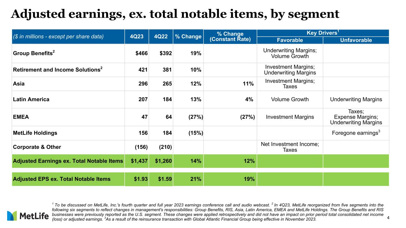 4 ($ in millions - except per share data) 4Q23 4Q22 % Change % Change (Constant Rate) Key Drivers1 Favorable Unfavorable Group Benefits2 $466 $392 19% Underwriting Margins; Volume Growth Retirement and Income Solutions2 421 381 10% Investment Margins; Underwriting Margins Asia 296 265 12% 11% Investment Margins; Taxes Latin America 207 184 13% 4% Volume Growth Underwriting Margins EMEA 47 64 (27%) (27%) Investment Margins Taxes; Expense Margins; Underwriting Margins MetLife Holdings 156 184 (15%) Foregone earnings3 Corporate & Other (156) (210) Net Investment Income; Taxes Adjusted Earnings ex. Total Notable Items $1,437 $1,260 14% 12% Adjusted EPS ex. Total Notable Items $1.93 $1.59 21% 19% Adjusted earnings, ex. total notable items, by segment 1 To be discussed on MetLife, Inc.'s fourth quarter and full year 2023 earnings conference call and audio webcast. 2 In 4Q23, MetLife reorganized from five segments into the following six segments to reflect changes in management's responsibilities: Group Benefits, RIS, Asia, Latin America, EMEA and MetLife Holdings. The Group Benefits and RIS businesses were previously reported as the U.S. segment. These changes were applied retrospectively and did not have an impact on prior period total consolidated net income (loss) or adjusted earnings. 3As a result of the reinsurance transaction with Global Atlantic Financial Group being effective in November 2023.