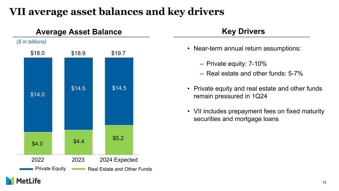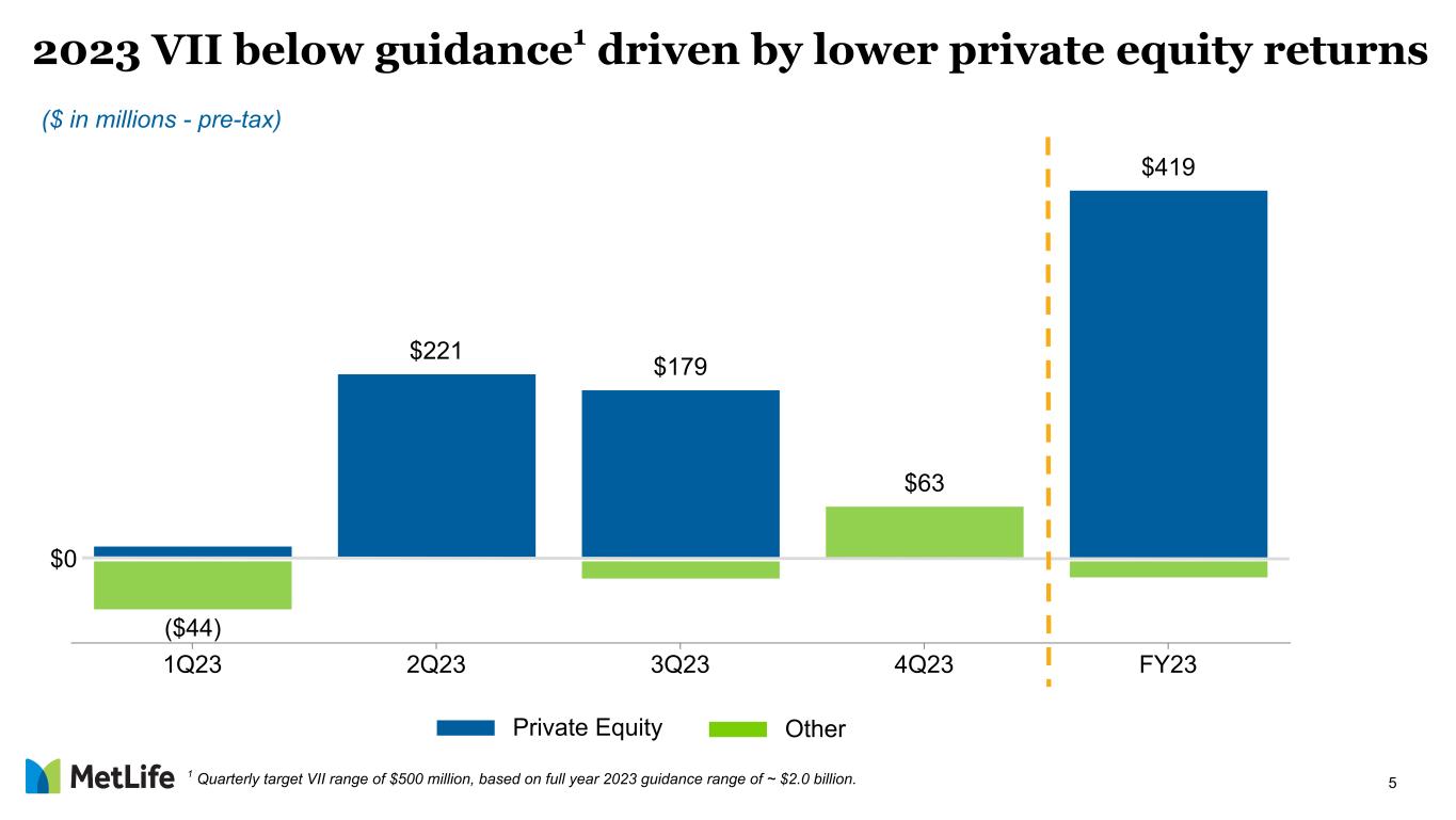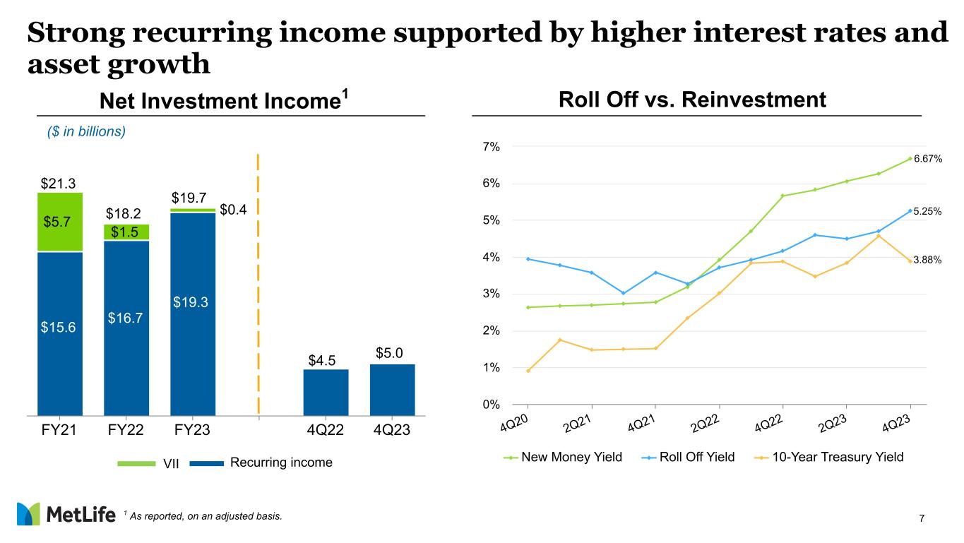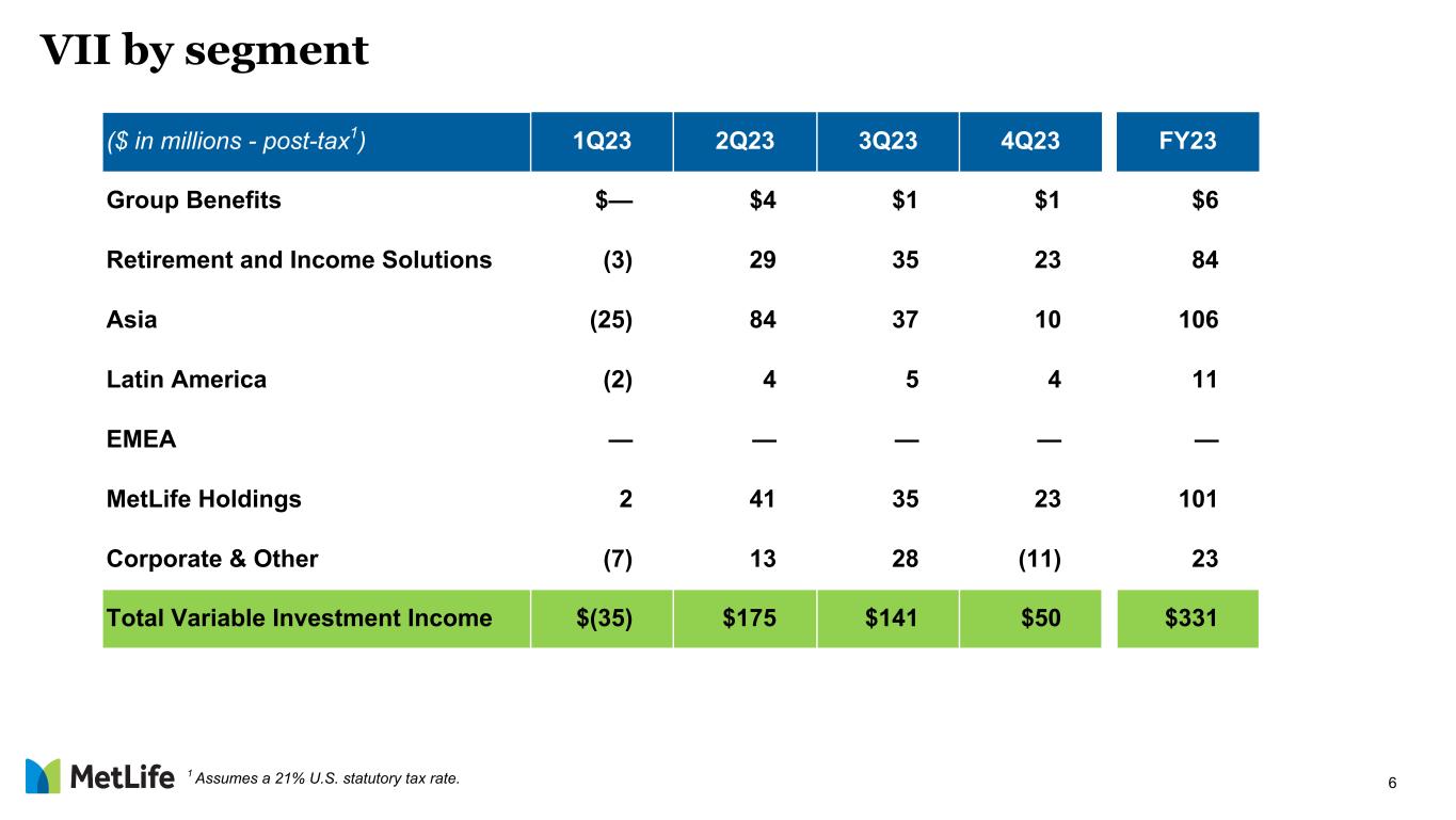 6 ($ in millions - post-tax1) 1Q23 2Q23 3Q23 4Q23 FY23 Group Benefits $— $4 $1 $1 $6 Retirement and Income Solutions (3) 29 35 23 84 Asia (25) 84 37 10 106 Latin America (2) 4 5 4 11 EMEA — — — — — MetLife Holdings 2 41 35 23 101 Corporate & Other (7) 13 28 (11) 23 Total Variable Investment Income $(35) $175 $141 $50 $331 1 Assumes a 21% U.S. statutory tax rate. VII by segment