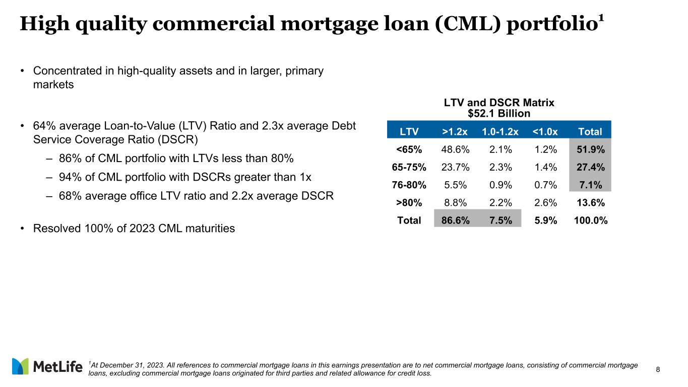 7 FY21 FY22 FY23 4Q22 4Q23 Strong recurring income supported by higher interest rates and asset growth ($ in billions) Recurring income VII Net Investment Income1 $16.7 $5.7 Roll Off vs. Reinvestment $15.6 $1.5 New Money Yield Roll Off Yield 10-Year Treasury Yield 4Q20 2Q21 4Q21 2Q22 4Q22 2Q23 4Q23 0% 1% 2% 3% 4% 5% 6% 7% 6.67% 5.25% 3.88% 1 As reported, on an adjusted basis. $21.3 $18.2 $5.0$4.5 $19.3 $0.4 $19.7