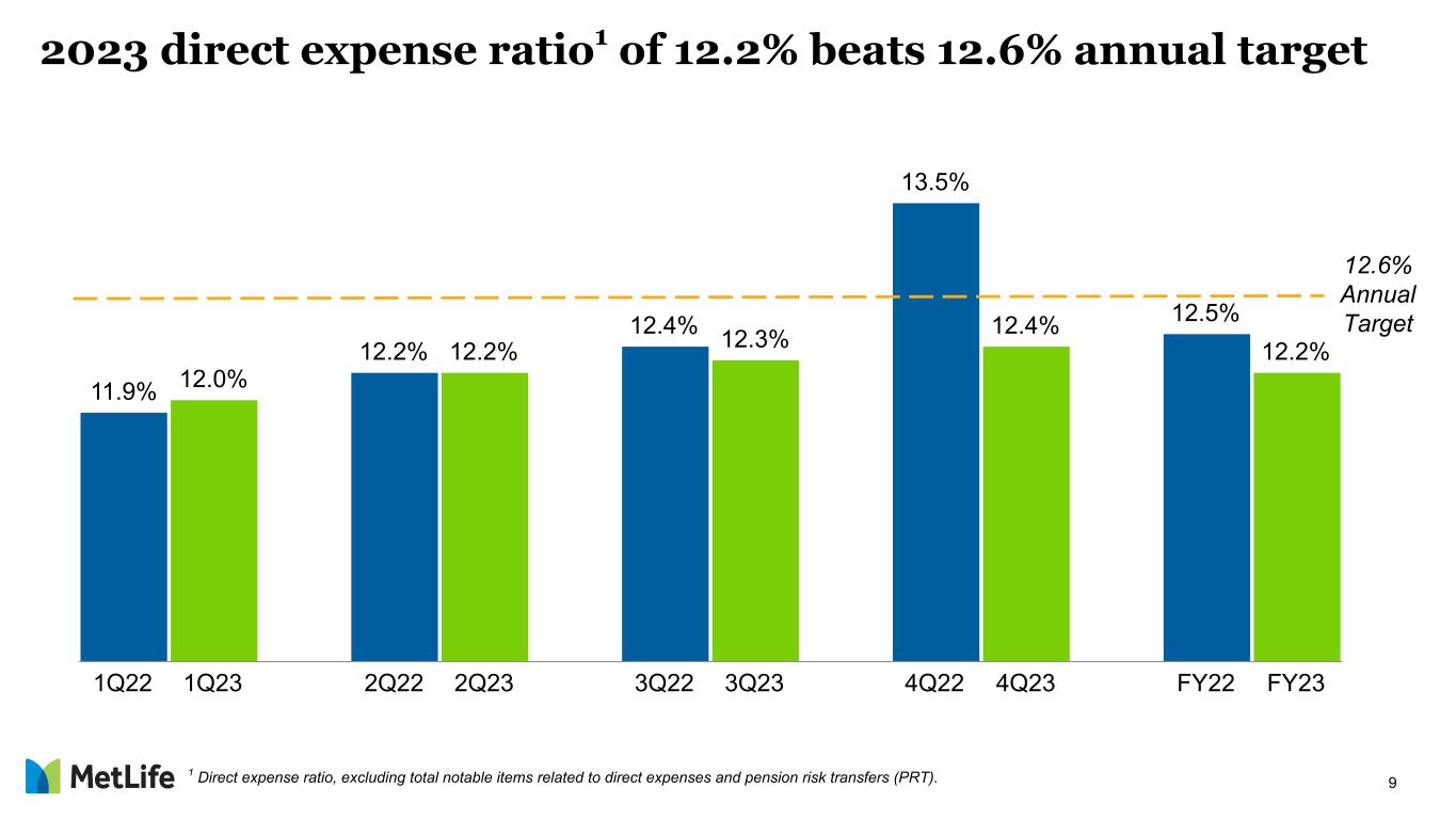 9 11.9% 12.0% 12.2% 12.2% 12.4% 12.3% 13.5% 12.4% 12.5% 12.2% 1Q22 1Q23 2Q22 2Q23 3Q22 3Q23 4Q22 4Q23 FY22 FY23 1 Direct expense ratio, excluding total notable items related to direct expenses and pension risk transfers (PRT). 12.6% Annual Target 2023 direct expense ratio1 of 12.2% beats 12.6% annual target