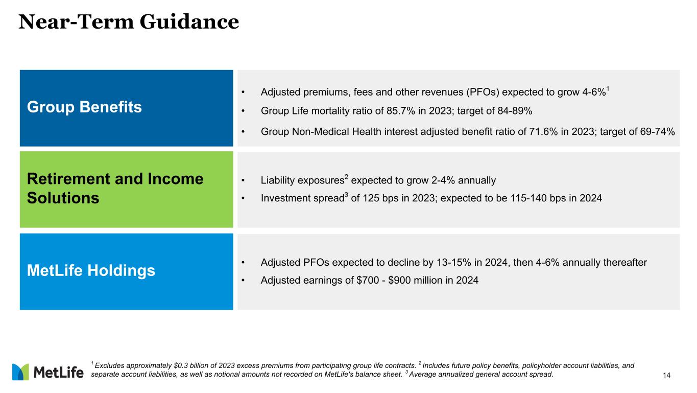 13 2022 2023 2024 Expected VII average asset balances and key drivers ($ in billions) Private Equity Real Estate and Other Funds Average Asset Balance • Near-term annual return assumptions: – Private equity: 7-10% – Real estate and other funds: 5-7% • Private equity and real estate and other funds remain pressured in 1Q24 • VII includes prepayment fees on fixed maturity securities and mortgage loans $18.0 $19.7$18.9 $14.5 $5.2 $14.5 $4.4 $14.0 $4.0 Key Drivers