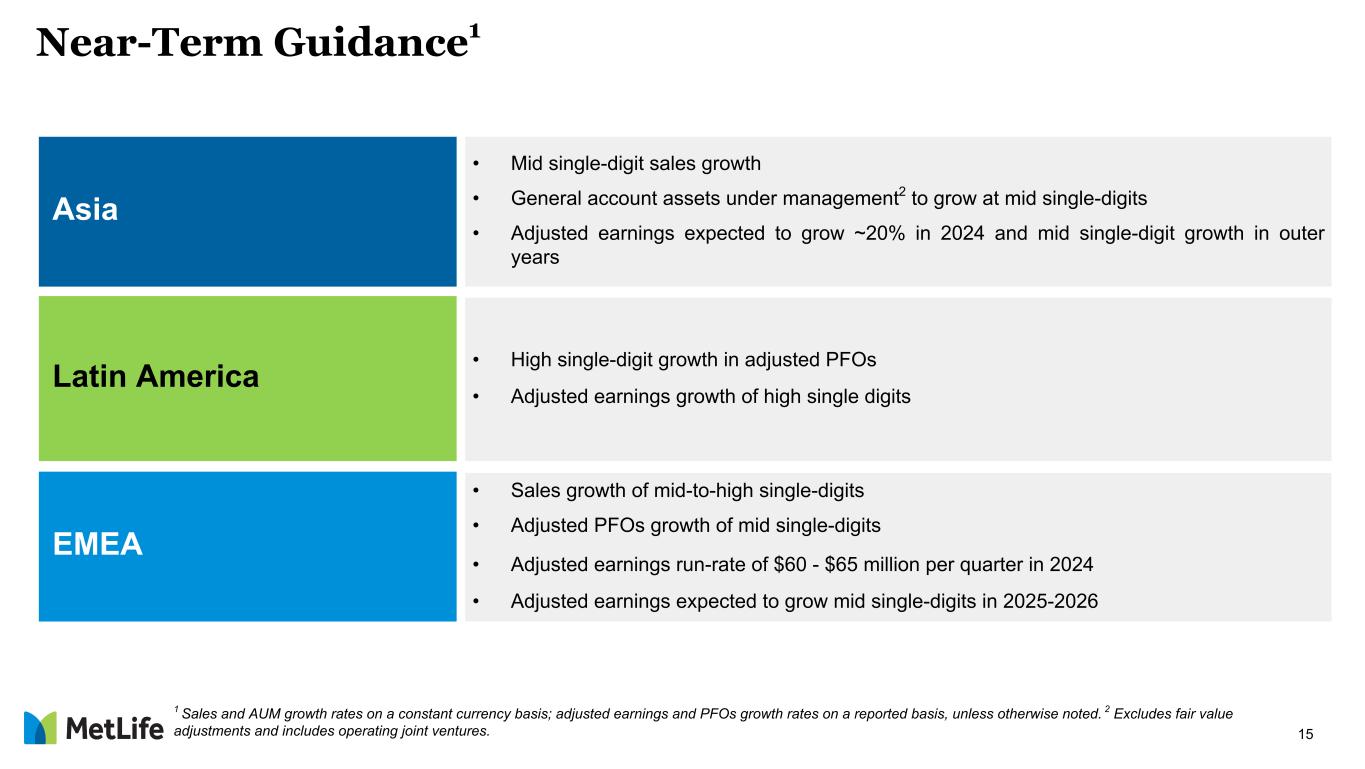 14 Near-Term Guidance • Adjusted premiums, fees and other revenues (PFOs) expected to grow 4-6%1 • Group Life mortality ratio of 85.7% in 2023; target of 84-89% • Group Non-Medical Health interest adjusted benefit ratio of 71.6% in 2023; target of 69-74% • Liability exposures2 expected to grow 2-4% annually • Investment spread3 of 125 bps in 2023; expected to be 115-140 bps in 2024 • Adjusted PFOs expected to decline by 13-15% in 2024, then 4-6% annually thereafter • Adjusted earnings of $700 - $900 million in 2024 Group Benefits Retirement and Income Solutions MetLife Holdings 1 Excludes approximately $0.3 billion of 2023 excess premiums from participating group life contracts. 2 Includes future policy benefits, policyholder account liabilities, and separate account liabilities, as well as notional amounts not recorded on MetLife's balance sheet. 3 Average annualized general account spread.
