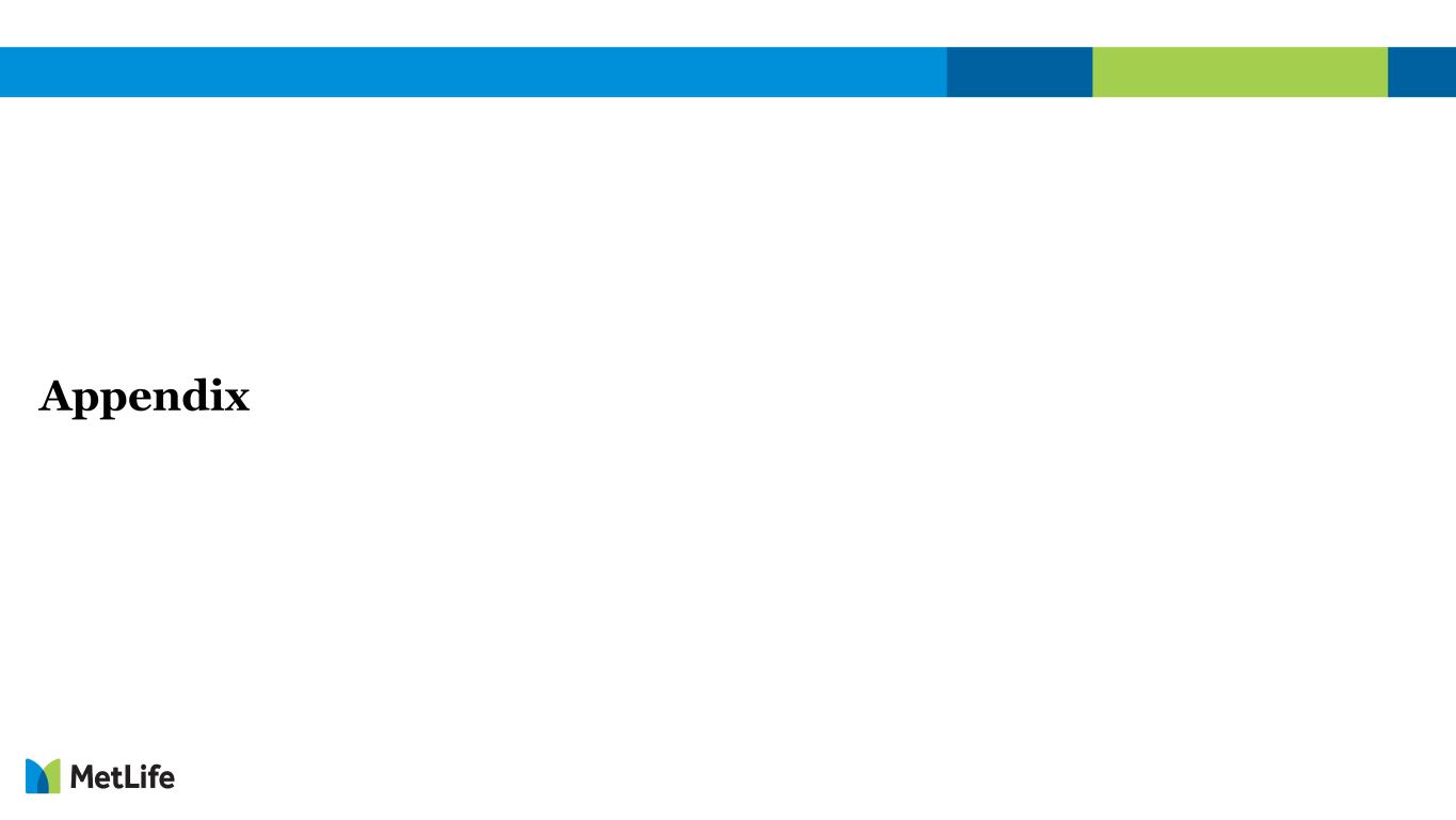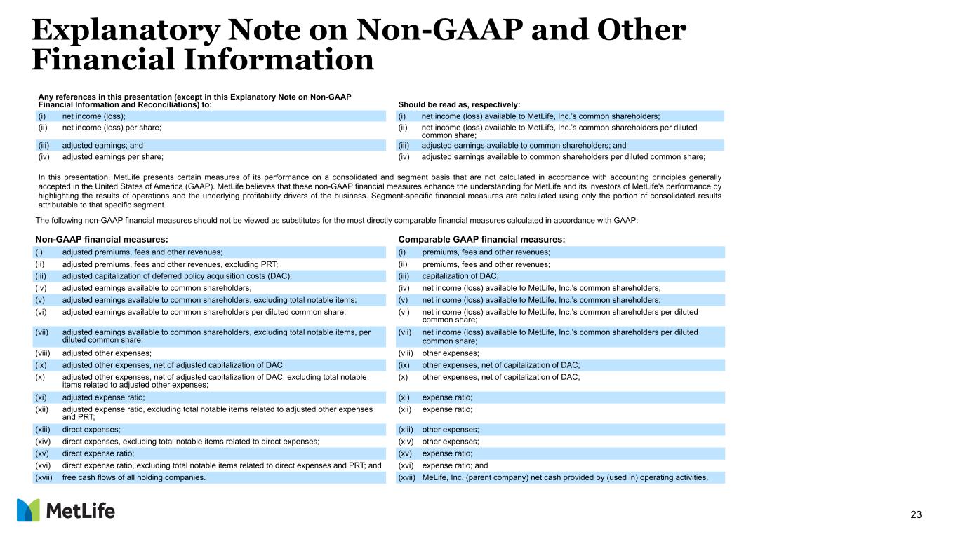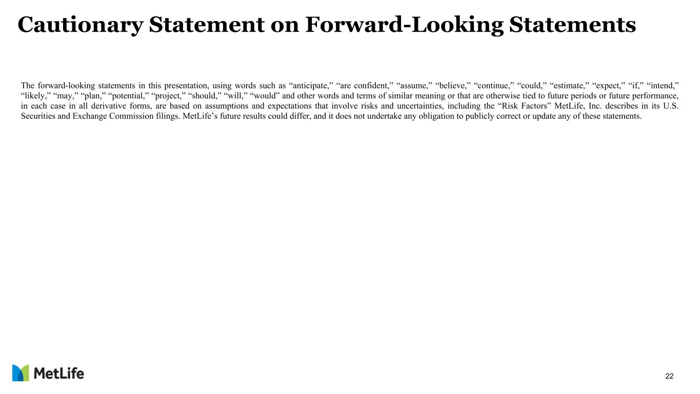 22 Cautionary Statement on Forward-Looking Statements The forward-looking statements in this presentation, using words such as “anticipate,” “are confident,” “assume,” “believe,” “continue,” “could,” “estimate,” “expect,” “if,” “intend,” “likely,” “may,” “plan,” “potential,” “project,” “should,” “will,” “would” and other words and terms of similar meaning or that are otherwise tied to future periods or future performance, in each case in all derivative forms, are based on assumptions and expectations that involve risks and uncertainties, including the “Risk Factors” MetLife, Inc. describes in its U.S. Securities and Exchange Commission filings. MetLife’s future results could differ, and it does not undertake any obligation to publicly correct or update any of these statements.