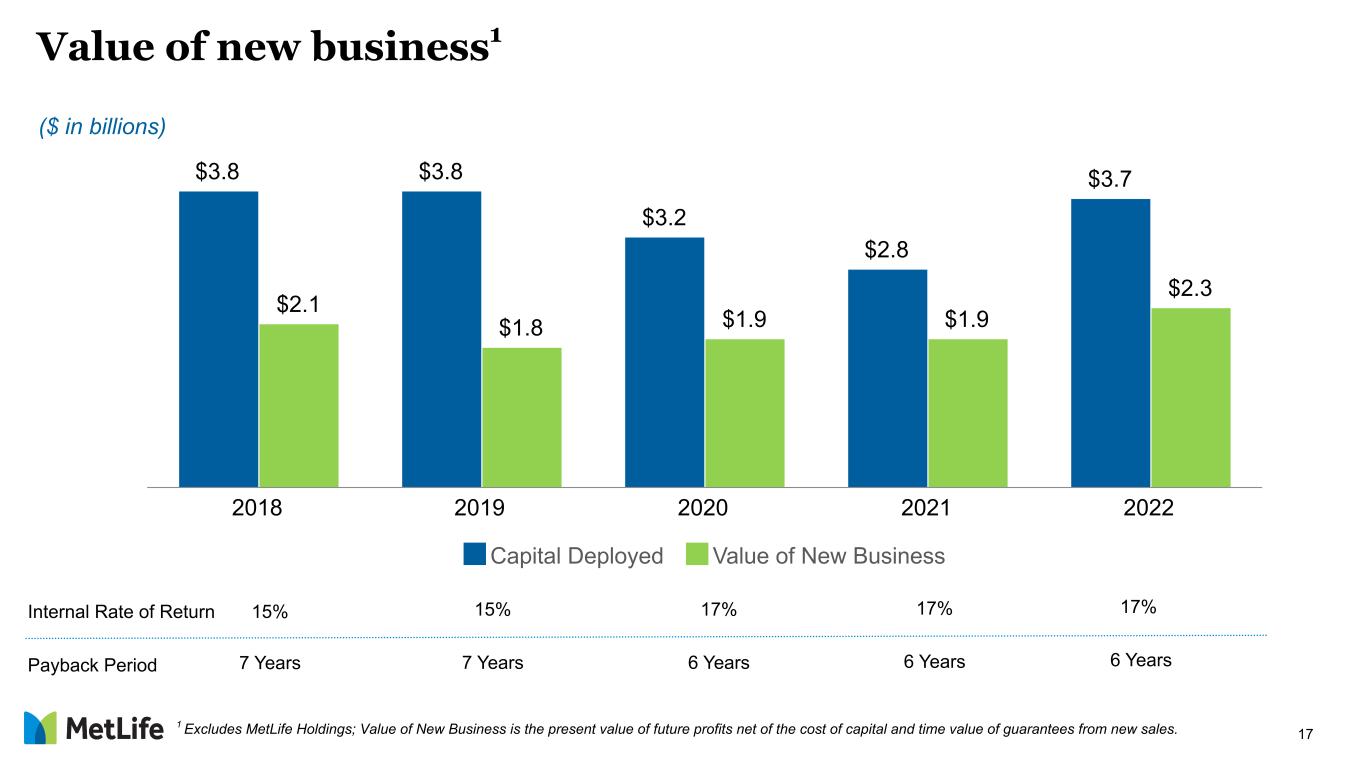 17 1 Excludes MetLife Holdings; Value of New Business is the present value of future profits net of the cost of capital and time value of guarantees from new sales. Value of new business1 $3.8 $3.8 $3.2 $2.8 $3.7 $2.1 $1.8 $1.9 $1.9 $2.3 Capital Deployed Value of New Business 2018 2019 2020 2021 2022 ($ in billions) Internal Rate of Return Payback Period 15% 7 Years 15% 7 Years 17% 6 Years 17% 6 Years 17% 6 Years