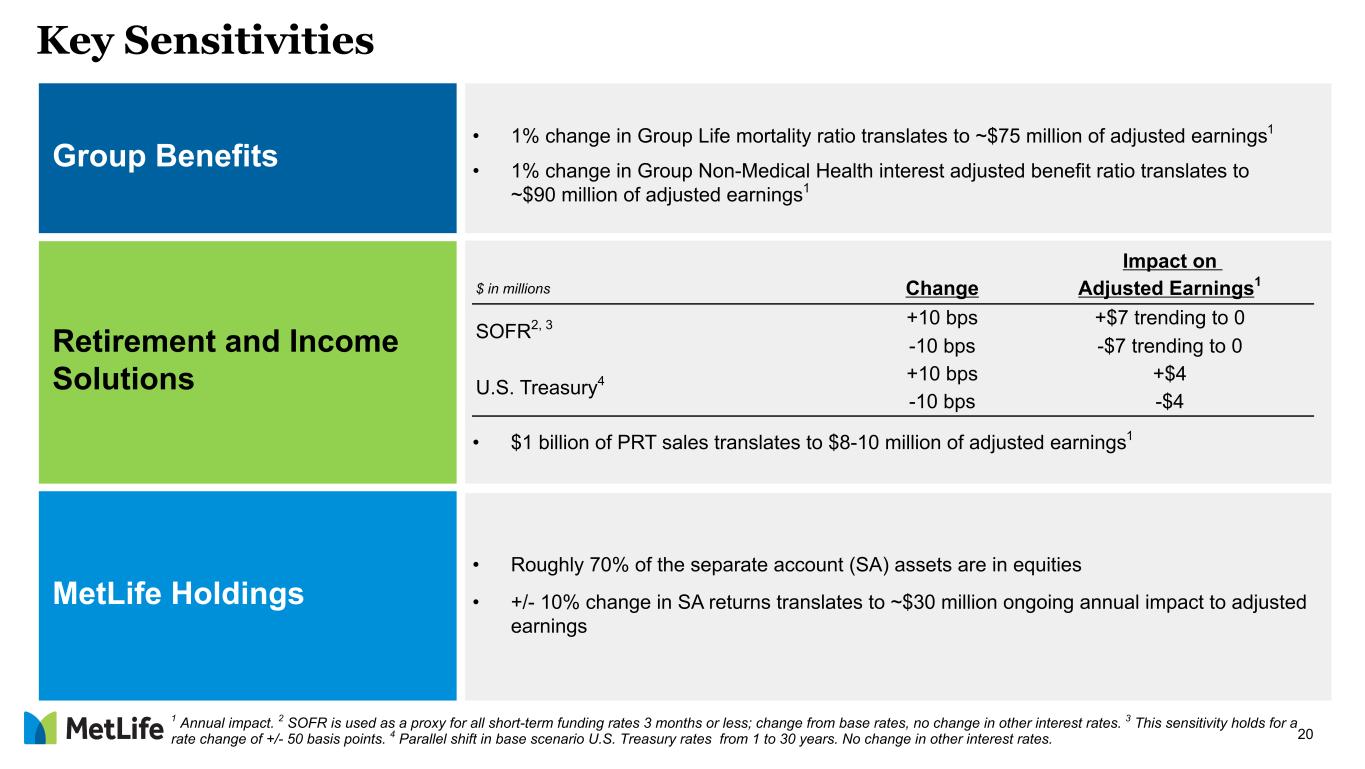 20 Key Sensitivities • 1% change in Group Life mortality ratio translates to ~$75 million of adjusted earnings1 • 1% change in Group Non-Medical Health interest adjusted benefit ratio translates to ~$90 million of adjusted earnings1 • Roughly 70% of the separate account (SA) assets are in equities • +/- 10% change in SA returns translates to ~$30 million ongoing annual impact to adjusted earnings Group Benefits Retirement and Income Solutions MetLife Holdings Impact on $ in millions Change Adjusted Earnings1 SOFR2, 3 +10 bps +$7 trending to 0 -10 bps -$7 trending to 0 U.S. Treasury4 +10 bps +$4 -10 bps -$4 • $1 billion of PRT sales translates to $8-10 million of adjusted earnings1 1 Annual impact. 2 SOFR is used as a proxy for all short-term funding rates 3 months or less; change from base rates, no change in other interest rates. 3 This sensitivity holds for a rate change of +/- 50 basis points. 4 Parallel shift in base scenario U.S. Treasury rates from 1 to 30 years. No change in other interest rates.