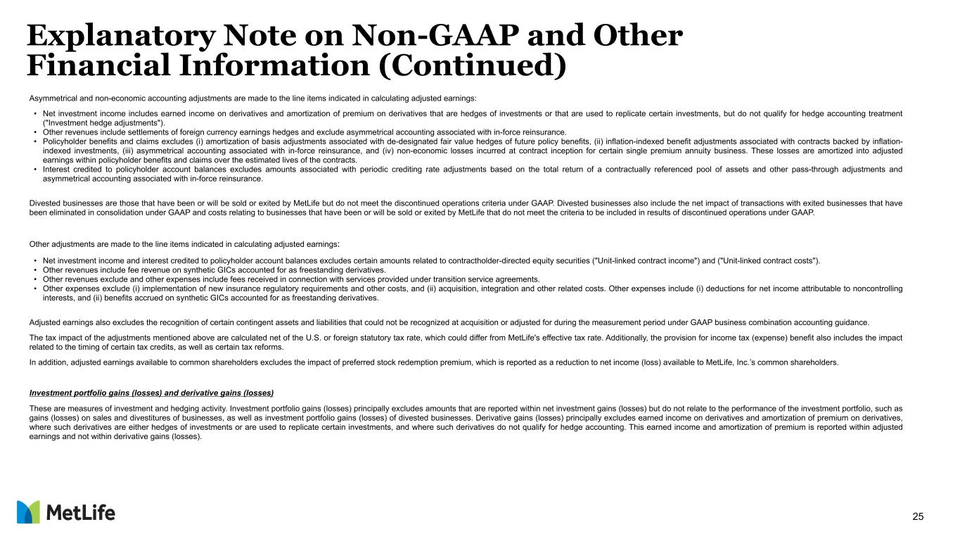 24 MetLife’s definitions of non-GAAP and other financial measures discussed in this presentation may differ from those used by other companies: Adjusted earnings and related measures • adjusted earnings; • adjusted earnings available to common shareholders; • adjusted earnings available to common shareholders, excluding total notable items; • adjusted earnings available to common shareholders per diluted common share; • adjusted earnings available to common shareholders, excluding total notable items per diluted common share; and • adjusted earnings available to common shareholders on a constant currency basis. These measures are used by management to evaluate performance and allocate resources. Consistent with GAAP guidance for segment reporting, adjusted earnings and components of, or other financial measures based on adjusted earnings are also MetLife’s GAAP measures of segment performance. Adjusted earnings and other financial measures based on adjusted earnings are also the measures by which MetLife senior management’s and many other employees’ performance is evaluated for the purposes of determining their compensation under applicable compensation plans. Adjusted earnings and other financial measures based on adjusted earnings allow analysis of MetLife's performance relative to its business plan and facilitate comparisons to industry results. Effective January 1, 2023, MetLife adopted ASU 2018-12, Financial Services - Insurance (Topic 944): Targeted Improvements to the Accounting for Long-Duration Contracts, as amended ("LDTI"), with a transition date of January 1, 2021, which impacted the calculation of adjusted earnings. With the the adoption of LDTI, the measurement model was simplified for DAC and VOBA, and most embedded derivatives were reclassified as market risk benefits. As a result, MetLife updated its calculation of adjusted earnings to remove certain adjustments related to the amortization of DAC, VOBA and related intangibles and adjusted for changes in measurement of certain guarantees. Under LDTI, adjusted earnings excludes changes in fair value associated with market risk benefits, changes in discount rates on certain annuitization guarantees, losses at contract inception for certain single premium business, and asymmetrical accounting associated with in-force reinsurance. All periods presented herein reflect the updated calculation of adjusted earnings. Adjusted earnings is defined as adjusted revenues less adjusted expenses, net of income tax. Adjusted earnings available to common shareholders is defined as adjusted earnings less preferred stock dividends. Adjusted revenues and adjusted expenses These financial measures, along with the related adjusted premiums, fees and other revenues, focus on our primary businesses principally by excluding the impact of (i) market volatility which could distort trends, (ii) asymmetrical and non-economic accounting, and (iii) revenues and costs related to divested businesses, non-core products and certain entities required to be consolidated under GAAP. Also, these measures exclude results of discontinued operations under GAAP. Market volatility can have a significant impact on the Company’s financial results. Adjusted earnings excludes net investment gains (losses), net derivative gains (losses), market risk benefits remeasurement gains (losses) and goodwill impairments. Further, policyholder benefits and claims exclude (i) changes in the discount rate on certain annuitization guarantees accounted for as additional liabilities and (ii) market value adjustments. Explanatory Note on Non-GAAP and Other Financial Information (Continued) Any of these financial measures shown on a constant currency basis reflect the impact of changes in foreign currency exchange rates and are calculated using the average foreign currency exchange rates for the most recent period. As a result, comparable prior period amounts are updated each period to reflect the most recent period average foreign currency exchange rates. Reconciliations of these non-GAAP financial measures to the most directly comparable GAAP financial measures are included in this presentation and in this period’s earnings news release, which is available at www.metlife.com.