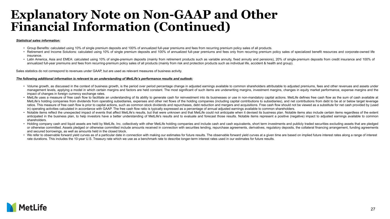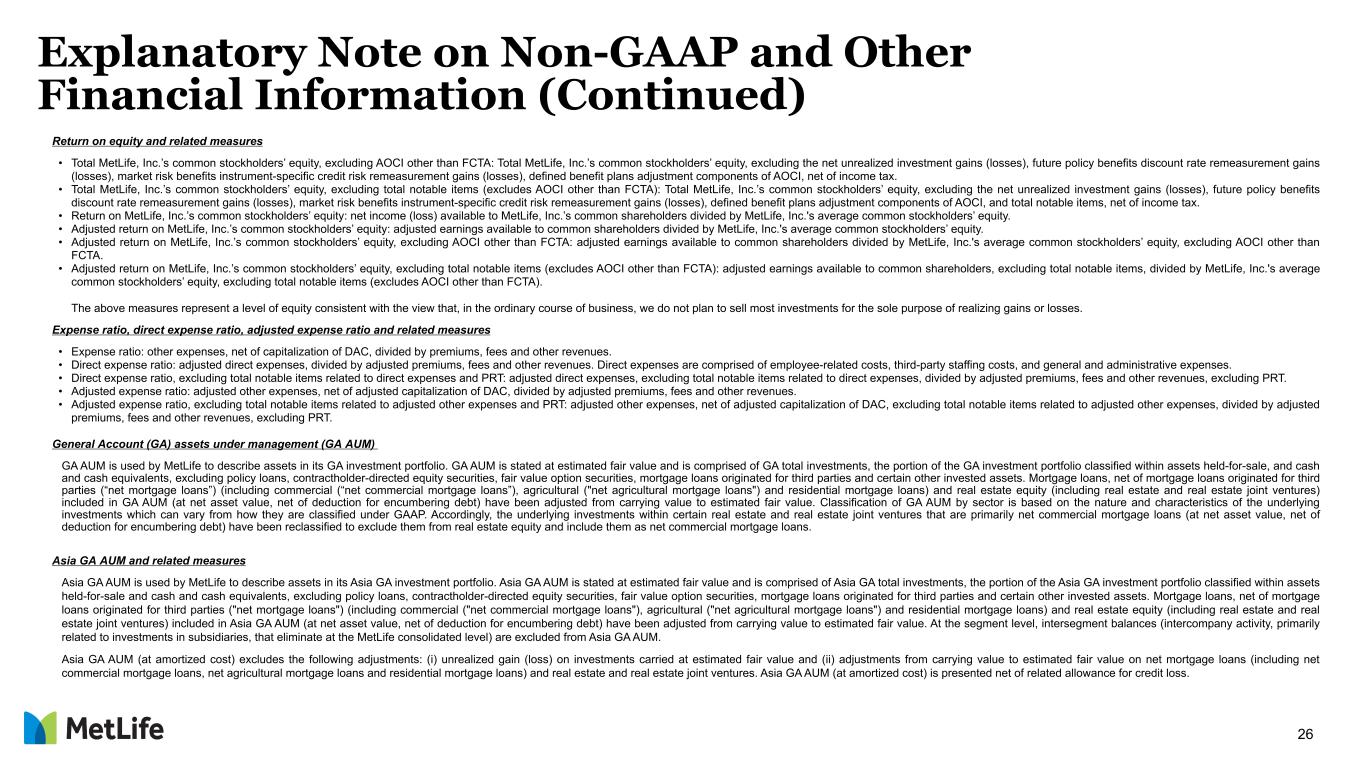 26 Explanatory Note on Non-GAAP and Other Financial Information (Continued) Return on equity and related measures • Total MetLife, Inc.’s common stockholders’ equity, excluding AOCI other than FCTA: Total MetLife, Inc.’s common stockholders’ equity, excluding the net unrealized investment gains (losses), future policy benefits discount rate remeasurement gains (losses), market risk benefits instrument-specific credit risk remeasurement gains (losses), defined benefit plans adjustment components of AOCI, net of income tax. • Total MetLife, Inc.’s common stockholders’ equity, excluding total notable items (excludes AOCI other than FCTA): Total MetLife, Inc.’s common stockholders’ equity, excluding the net unrealized investment gains (losses), future policy benefits discount rate remeasurement gains (losses), market risk benefits instrument-specific credit risk remeasurement gains (losses), defined benefit plans adjustment components of AOCI, and total notable items, net of income tax. • Return on MetLife, Inc.’s common stockholders’ equity: net income (loss) available to MetLife, Inc.’s common shareholders divided by MetLife, Inc.'s average common stockholders’ equity. • Adjusted return on MetLife, Inc.’s common stockholders’ equity: adjusted earnings available to common shareholders divided by MetLife, Inc.'s average common stockholders’ equity. • Adjusted return on MetLife, Inc.’s common stockholders’ equity, excluding AOCI other than FCTA: adjusted earnings available to common shareholders divided by MetLife, Inc.'s average common stockholders’ equity, excluding AOCI other than FCTA. • Adjusted return on MetLife, Inc.’s common stockholders’ equity, excluding total notable items (excludes AOCI other than FCTA): adjusted earnings available to common shareholders, excluding total notable items, divided by MetLife, Inc.'s average common stockholders’ equity, excluding total notable items (excludes AOCI other than FCTA). The above measures represent a level of equity consistent with the view that, in the ordinary course of business, we do not plan to sell most investments for the sole purpose of realizing gains or losses. Expense ratio, direct expense ratio, adjusted expense ratio and related measures • Expense ratio: other expenses, net of capitalization of DAC, divided by premiums, fees and other revenues. • Direct expense ratio: adjusted direct expenses, divided by adjusted premiums, fees and other revenues. Direct expenses are comprised of employee-related costs, third-party staffing costs, and general and administrative expenses. • Direct expense ratio, excluding total notable items related to direct expenses and PRT: adjusted direct expenses, excluding total notable items related to direct expenses, divided by adjusted premiums, fees and other revenues, excluding PRT. • Adjusted expense ratio: adjusted other expenses, net of adjusted capitalization of DAC, divided by adjusted premiums, fees and other revenues. • Adjusted expense ratio, excluding total notable items related to adjusted other expenses and PRT: adjusted other expenses, net of adjusted capitalization of DAC, excluding total notable items related to adjusted other expenses, divided by adjusted premiums, fees and other revenues, excluding PRT. General Account (GA) assets under management (GA AUM) GA AUM is used by MetLife to describe assets in its GA investment portfolio. GA AUM is stated at estimated fair value and is comprised of GA total investments, the portion of the GA investment portfolio classified within assets held-for-sale, and cash and cash equivalents, excluding policy loans, contractholder-directed equity securities, fair value option securities, mortgage loans originated for third parties and certain other invested assets. Mortgage loans, net of mortgage loans originated for third parties (“net mortgage loans”) (including commercial (“net commercial mortgage loans”), agricultural ("net agricultural mortgage loans") and residential mortgage loans) and real estate equity (including real estate and real estate joint ventures) included in GA AUM (at net asset value, net of deduction for encumbering debt) have been adjusted from carrying value to estimated fair value. Classification of GA AUM by sector is based on the nature and characteristics of the underlying investments which can vary from how they are classified under GAAP. Accordingly, the underlying investments within certain real estate and real estate joint ventures that are primarily net commercial mortgage loans (at net asset value, net of deduction for encumbering debt) have been reclassified to exclude them from real estate equity and include them as net commercial mortgage loans. Asia GA AUM and related measures Asia GA AUM is used by MetLife to describe assets in its Asia GA investment portfolio. Asia GA AUM is stated at estimated fair value and is comprised of Asia GA total investments, the portion of the Asia GA investment portfolio classified within assets held-for-sale and cash and cash equivalents, excluding policy loans, contractholder-directed equity securities, fair value option securities, mortgage loans originated for third parties and certain other invested assets. Mortgage loans, net of mortgage loans originated for third parties ("net mortgage loans") (including commercial ("net commercial mortgage loans"), agricultural ("net agricultural mortgage loans") and residential mortgage loans) and real estate equity (including real estate and real estate joint ventures) included in Asia GA AUM (at net asset value, net of deduction for encumbering debt) have been adjusted from carrying value to estimated fair value. At the segment level, intersegment balances (intercompany activity, primarily related to investments in subsidiaries, that eliminate at the MetLife consolidated level) are excluded from Asia GA AUM. Asia GA AUM (at amortized cost) excludes the following adjustmen