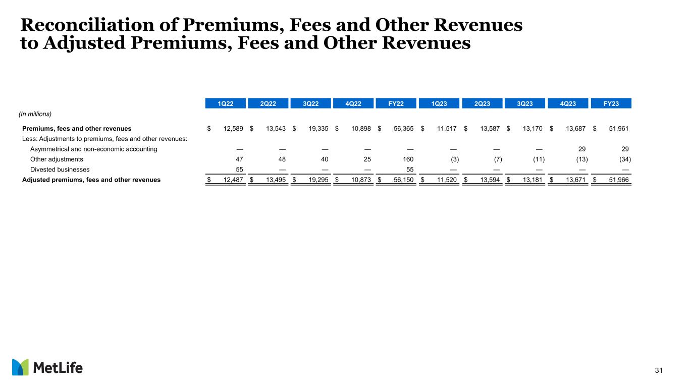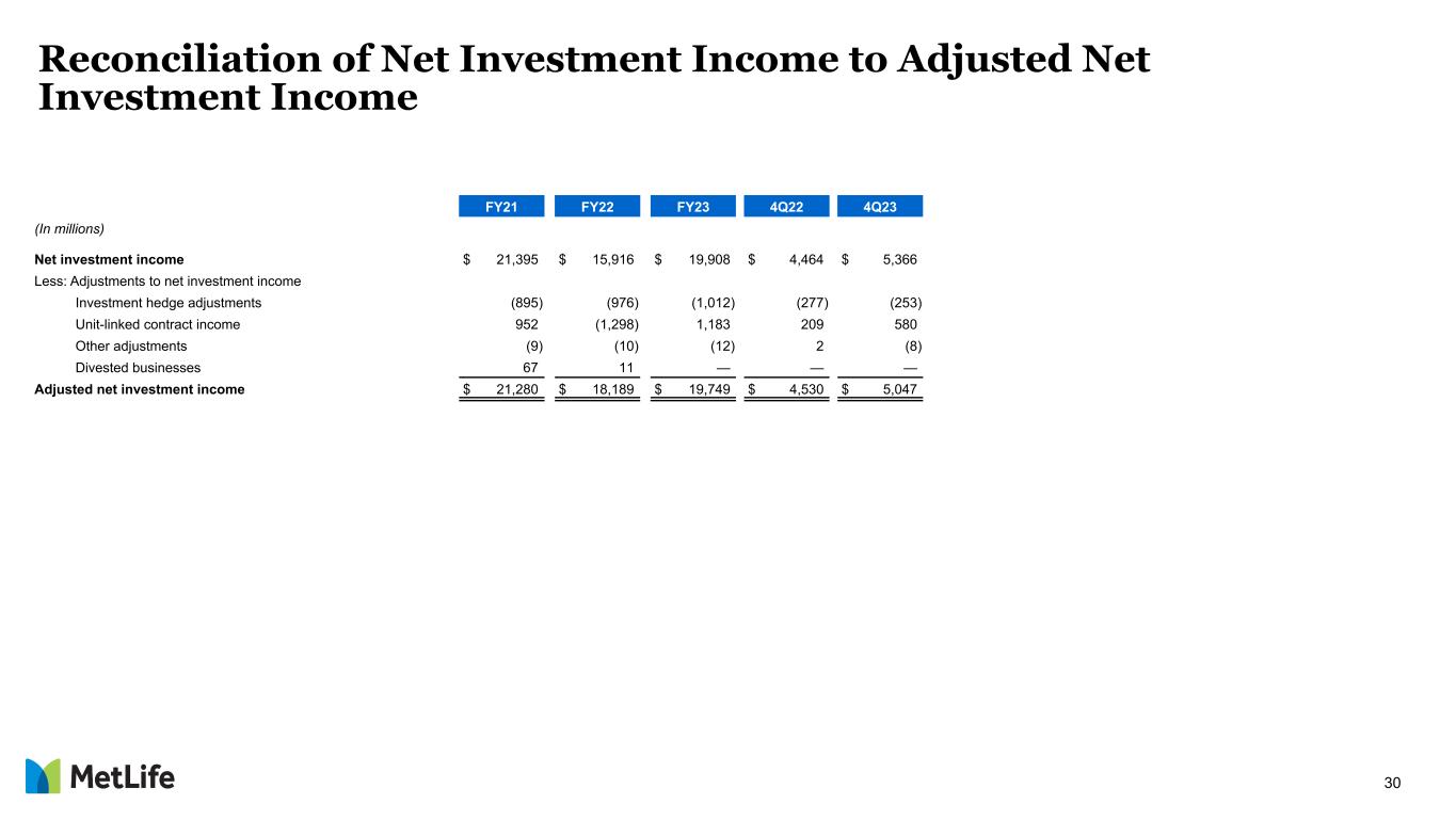 30 Reconciliation of Net Investment Income to Adjusted Net Investment Income FY21 FY22 FY23 4Q22 4Q23 (In millions) Net investment income $ 21,395 $ 15,916 $ 19,908 $ 4,464 $ 5,366 Less: Adjustments to net investment income Investment hedge adjustments (895) (976) (1,012) (277) (253) Unit-linked contract income 952 (1,298) 1,183 209 580 Other adjustments (9) (10) (12) 2 (8) Divested businesses 67 11 — — — Adjusted net investment income $ 21,280 $ 18,189 $ 19,749 $ 4,530 $ 5,047