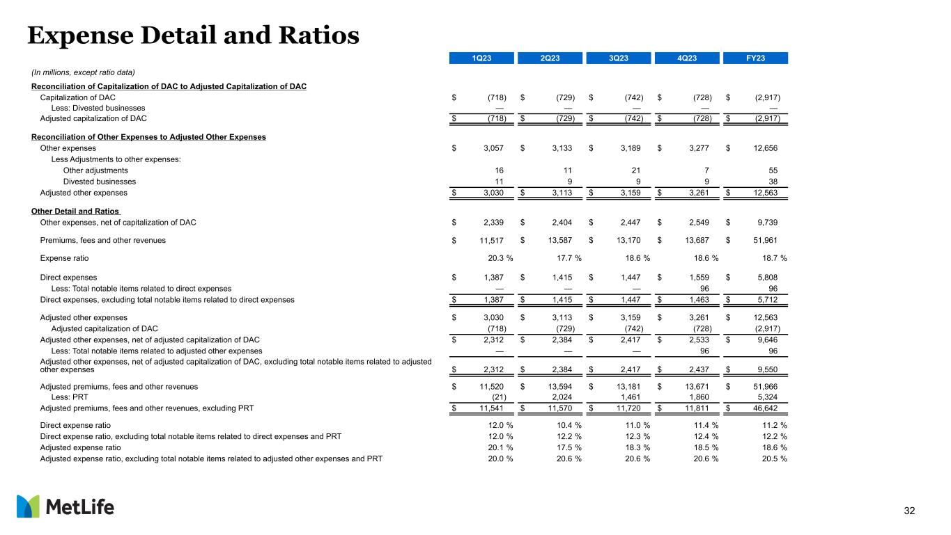 31 Reconciliation of Premiums, Fees and Other Revenues to Adjusted Premiums, Fees and Other Revenues 1Q22 2Q22 3Q22 4Q22 FY22 1Q23 2Q23 3Q23 4Q23 FY23 (In millions) Premiums, fees and other revenues $ 12,589 $ 13,543 $ 19,335 $ 10,898 $ 56,365 $ 11,517 $ 13,587 $ 13,170 $ 13,687 $ 51,961 Less: Adjustments to premiums, fees and other revenues: Asymmetrical and non-economic accounting — — — — — — — — 29 29 Other adjustments 47 48 40 25 160 (3) (7) (11) (13) (34) Divested businesses 55 — — — 55 — — — — — Adjusted premiums, fees and other revenues $ 12,487 $ 13,495 $ 19,295 $ 10,873 $ 56,150 $ 11,520 $ 13,594 $ 13,181 $ 13,671 $ 51,966