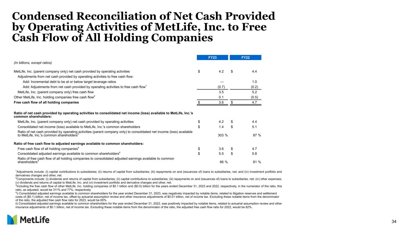 34 Condensed Reconciliation of Net Cash Provided by Operating Activities of MetLife, Inc. to Free Cash Flow of All Holding Companies FY23 FY22 (In billions, except ratios) MetLife, Inc. (parent company only) net cash provided by operating activities $ 4.2 $ 4.4 Adjustments from net cash provided by operating activities to free cash flow: Add: Incremental debt to be at or below target leverage ratios — 1.0 Add: Adjustments from net cash provided by operating activities to free cash flow1 (0.7) (0.2) MetLife, Inc. (parent company only) free cash flow 3.5 5.2 Other MetLife, Inc. holding companies free cash flow2 0.1 (0.5) Free cash flow of all holding companies $ 3.6 $ 4.7 Ratio of net cash provided by operating activities to consolidated net income (loss) available to MetLife, Inc.'s common shareholders: MetLife, Inc. (parent company only) net cash provided by operating activities $ 4.2 $ 4.4 Consolidated net income (loss) available to MetLife, Inc.'s common shareholders $ 1.4 $ 5.1 Ratio of net cash provided by operating activities (parent company only) to consolidated net income (loss) available to MetLife, Inc.'s common shareholders3 303 % 87 % Ratio of free cash flow to adjusted earnings available to common shareholders: Free cash flow of all holding companies4 $ 3.6 $ 4.7 Consolidated adjusted earnings available to common shareholders4 $ 5.5 $ 5.8 Ratio of free cash flow of all holding companies to consolidated adjusted earnings available to common shareholders4 66 % 81 % 1Adjustments include: (i) capital contributions to subsidiaries; (ii) returns of capital from subsidiaries; (iii) repayments on and (issuances of) loans to subsidiaries, net; and (iv) investment portfolio and derivatives changes and other, net. 2Components include: (i) dividends and returns of capital from subsidiaries; (ii) capital contributions to subsidiaries; (iii) repayments on and (issuances of) loans to subsidiaries, net; (iv) other expenses; (v) dividends and returns of capital to MetLife, Inc. and (vi) investment portfolio and derivative changes and other, net. 3Including the free cash flow of other MetLife, Inc. holding companies of $0.1 billion and ($0.5) billion for the years ended December 31, 2023 and 2022, respectively, in the numerator of the ratio, this ratio, as adjusted, would be 311% and 77%, respectively. 4i) Consolidated adjusted earnings available to common shareholders for the year ended December 31, 2023, was negatively impacted by notable items, related to litigation reserves and settlement costs of ($0.1) billion, net of income tax, offset by actuarial assumption review and other insurance adjustments of $0.01 billion, net of income tax. Excluding these notable items from the denominator of the ratio, the adjusted free cash flow ratio for 2023, would be 65%. ii) Consolidated adjusted earnings available to common shareholders for the year ended December 31, 2022, was positively impacted by notable items, related to actuarial assumption review and other insurance adjustments of $0.1 billion, net of income tax. Excluding these notable items from the denominator of the ratio, the adjusted free cash flow ratio for 2022, would be 82%.