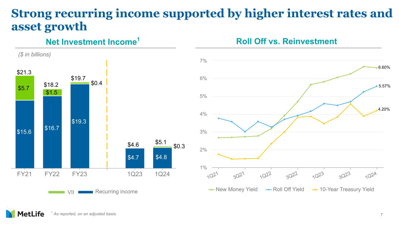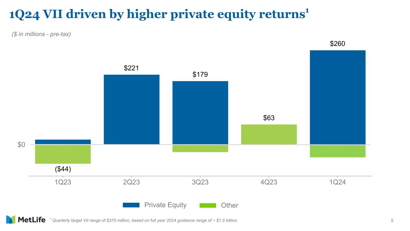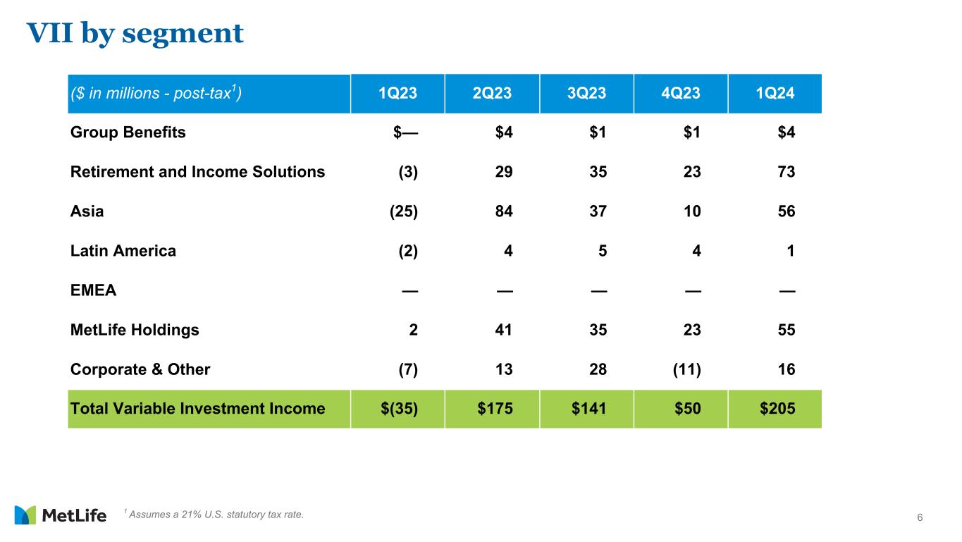 6 ($ in millions - post-tax1) 1Q23 2Q23 3Q23 4Q23 1Q24 Group Benefits $— $4 $1 $1 $4 Retirement and Income Solutions (3) 29 35 23 73 Asia (25) 84 37 10 56 Latin America (2) 4 5 4 1 EMEA — — — — — MetLife Holdings 2 41 35 23 55 Corporate & Other (7) 13 28 (11) 16 Total Variable Investment Income $(35) $175 $141 $50 $205 1 Assumes a 21% U.S. statutory tax rate. VII by segment