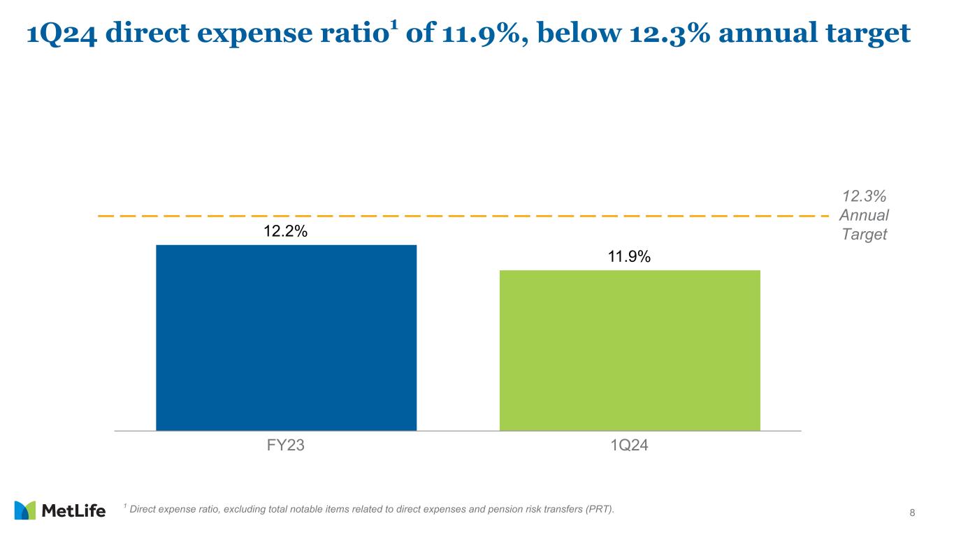 7 FY21 FY22 FY23 1Q23 1Q24 Strong recurring income supported by higher interest rates and asset growth ($ in billions) Recurring income VII Net Investment Income1 $16.7 $5.7 Roll Off vs. Reinvestment $15.6 $1.5 New Money Yield Roll Off Yield 10-Year Treasury Yield 1Q21 3Q21 1Q22 3Q22 1Q23 3Q23 1Q24 1% 2% 3% 4% 5% 6% 7% 6.60% 5.57% 4.20% 1 As reported, on an adjusted basis. $21.3 $18.2 $4.6 $19.3 $0.4 $19.7 $4.7 $5.1 $0.3 $4.8