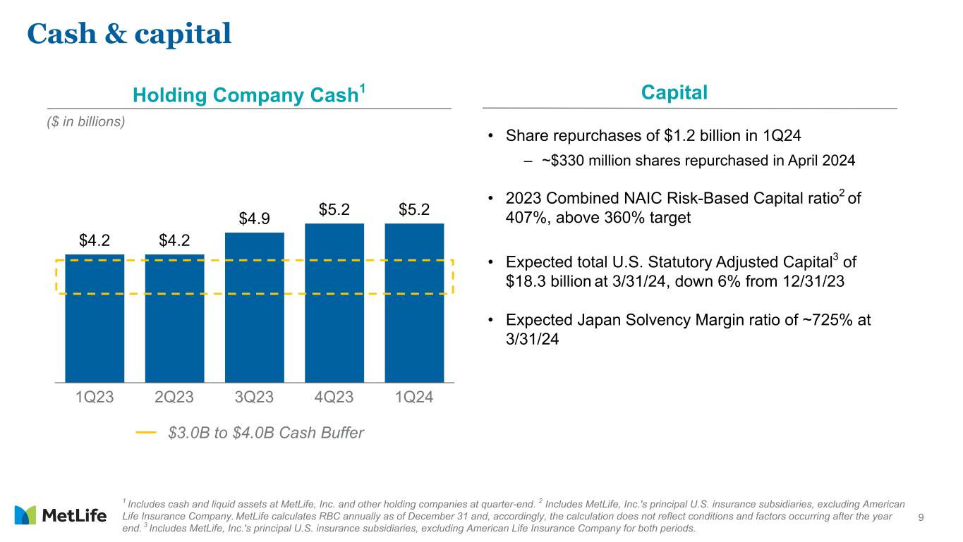 9 Holding Company Cash1 $4.2 $4.2 $4.9 $5.2 $5.2 1Q23 2Q23 3Q23 4Q23 1Q24 Cash & capital 1 Includes cash and liquid assets at MetLife, Inc. and other holding companies at quarter-end. 2 Includes MetLife, Inc.'s principal U.S. insurance subsidiaries, excluding American Life Insurance Company. MetLife calculates RBC annually as of December 31 and, accordingly, the calculation does not reflect conditions and factors occurring after the year end. 3 Includes MetLife, Inc.'s principal U.S. insurance subsidiaries, excluding American Life Insurance Company for both periods. $3.0B to $4.0B Cash Buffer Capital ($ in billions) • Share repurchases of $1.2 billion in 1Q24 – ~$330 million shares repurchased in April 2024 • 2023 Combined NAIC Risk-Based Capital ratio2 of 407%, above 360% target • Expected total U.S. Statutory Adjusted Capital3 of $18.3 billion at 3/31/24, down 6% from 12/31/23 • Expected Japan Solvency Margin ratio of ~725% at 3/31/24