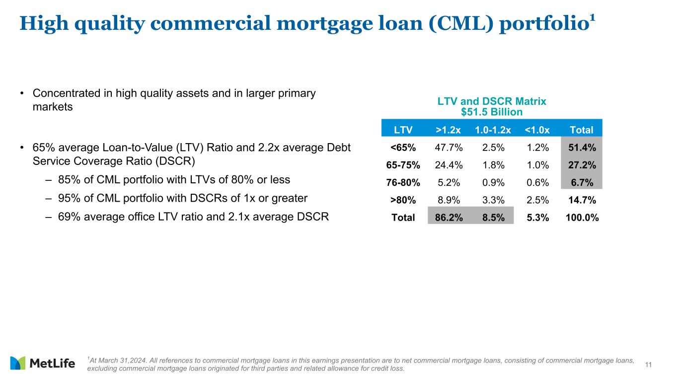 11 High quality commercial mortgage loan (CML) portfolio1 • Concentrated in high quality assets and in larger primary markets • 65% average Loan-to-Value (LTV) Ratio and 2.2x average Debt Service Coverage Ratio (DSCR) – 85% of CML portfolio with LTVs of 80% or less – 95% of CML portfolio with DSCRs of 1x or greater – 69% average office LTV ratio and 2.1x average DSCR 1At March 31,2024. All references to commercial mortgage loans in this earnings presentation are to net commercial mortgage loans, consisting of commercial mortgage loans, excluding commercial mortgage loans originated for third parties and related allowance for credit loss. LTV and DSCR Matrix $51.5 Billion LTV >1.2x 1.0-1.2x <1.0x Total <65% 47.7% 2.5% 1.2% 51.4% 65-75% 24.4% 1.8% 1.0% 27.2% 76-80% 5.2% 0.9% 0.6% 6.7% >80% 8.9% 3.3% 2.5% 14.7% Total 86.2% 8.5% 5.3% 100.0%