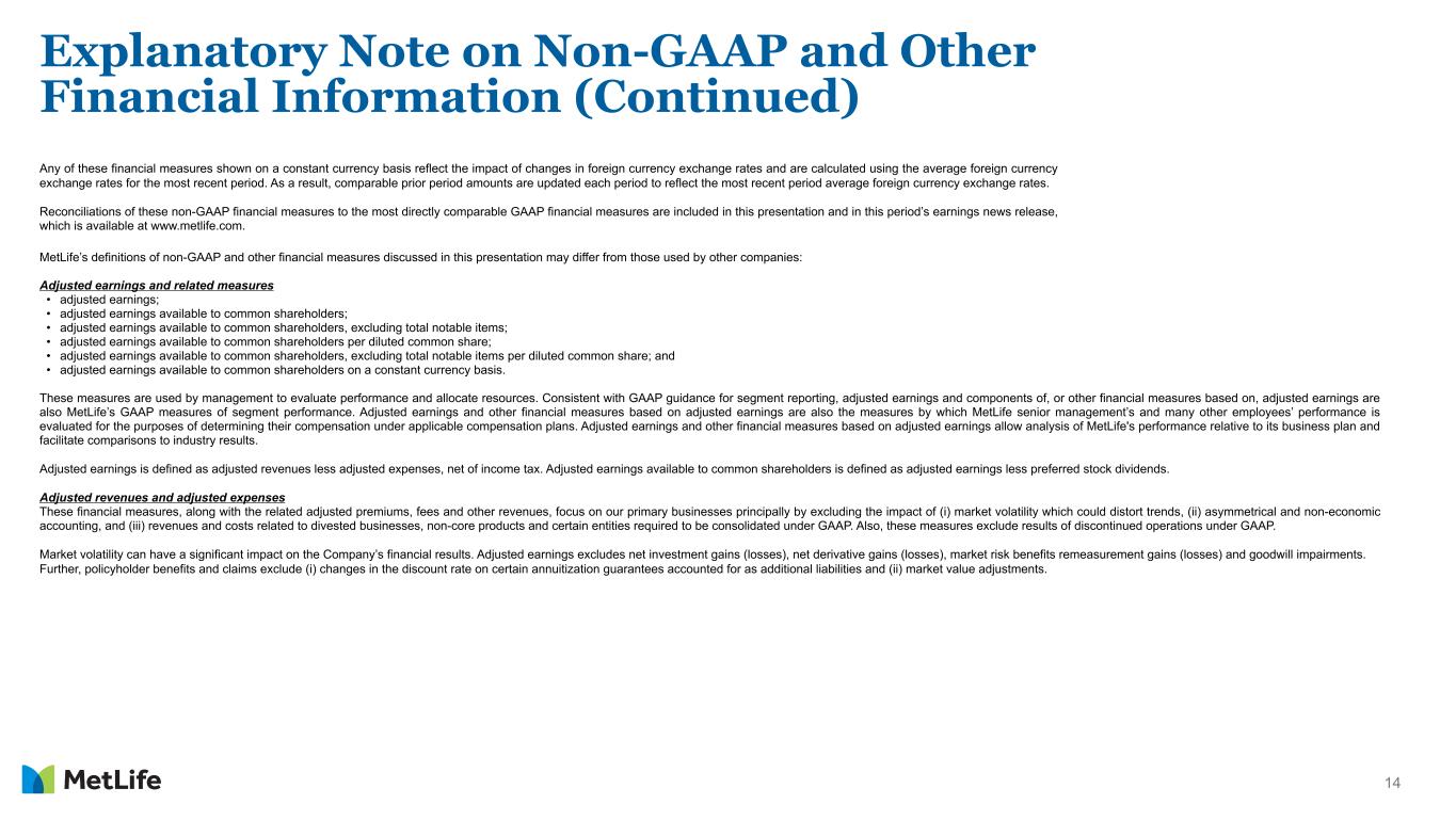 13 Explanatory Note on Non-GAAP and Other Financial Information Any references in this presentation (except in this Explanatory Note on Non-GAAP Financial Information and Reconciliations) to: Should be read as, respectively: (i) net income (loss); (i) net income (loss) available to MetLife, Inc.’s common shareholders; (ii) net income (loss) per share; (ii) net income (loss) available to MetLife, Inc.’s common shareholders per diluted common share; (iii) adjusted earnings; and (iii) adjusted earnings available to common shareholders; and (iv) adjusted earnings per share. (iv) adjusted earnings available to common shareholders per diluted common share. In this presentation, MetLife presents certain measures of its performance on a consolidated and segment basis that are not calculated in accordance with accounting principles generally accepted in the United States of America (GAAP). MetLife believes that these non-GAAP financial measures enhance the understanding for MetLife and its investors of MetLife's performance by highlighting the results of operations and the underlying profitability drivers of the business. Segment-specific financial measures are calculated using only the portion of consolidated results attributable to that specific segment. The following non-GAAP financial measures should not be viewed as substitutes for the most directly comparable financial measures calculated in accordance with GAAP: Non-GAAP financial measures: Comparable GAAP financial measures: (i) adjusted premiums, fees and other revenues; (i) premiums, fees and other revenues; (ii) adjusted premiums, fees and other revenues, excluding PRT; (ii) premiums, fees and other revenues; (iii) adjusted capitalization of deferred policy acquisition costs (DAC); (iii) capitalization of DAC; (iv) adjusted earnings available to common shareholders; (iv) net income (loss) available to MetLife, Inc.’s common shareholders; (v) adjusted earnings available to common shareholders, excluding total notable items; (v) net income (loss) available to MetLife, Inc.’s common shareholders; (vi) adjusted earnings available to common shareholders per diluted common share; (vi) net income (loss) available to MetLife, Inc.’s common shareholders per diluted common share; (vii) adjusted earnings available to common shareholders, excluding total notable items, per diluted common share; (vii) net income (loss) available to MetLife, Inc.’s common shareholders per diluted common share; (viii) adjusted other expenses; (viii) other expenses; (ix) adjusted other expenses, net of adjusted capitalization of DAC; (ix) other expenses, net of capitalization of DAC; (x) adjusted other expenses, net of adjusted capitalization of DAC, excluding total notable items related to adjusted other expenses; (x) other expenses, net of capitalization of DAC; (xi) adjusted expense ratio; (xi) expense ratio; (xii) adjusted expense ratio, excluding total notable items related to adjusted other expenses and PRT; (xii) expense ratio; (xiii) direct expenses; (xiii) other expenses; (xiv) direct expenses, excluding total notable items related to direct expenses; (xiv) other expenses; (xv) direct expense ratio; (xv) expense ratio; (xvi) direct expense ratio, excluding total notable items related to direct expenses and PRT; and (xvi) expense ratio; and (xvii) free cash flows of all holding companies. (xvii) MeLife, Inc. (parent company) net cash provided by (used in) operating activities.