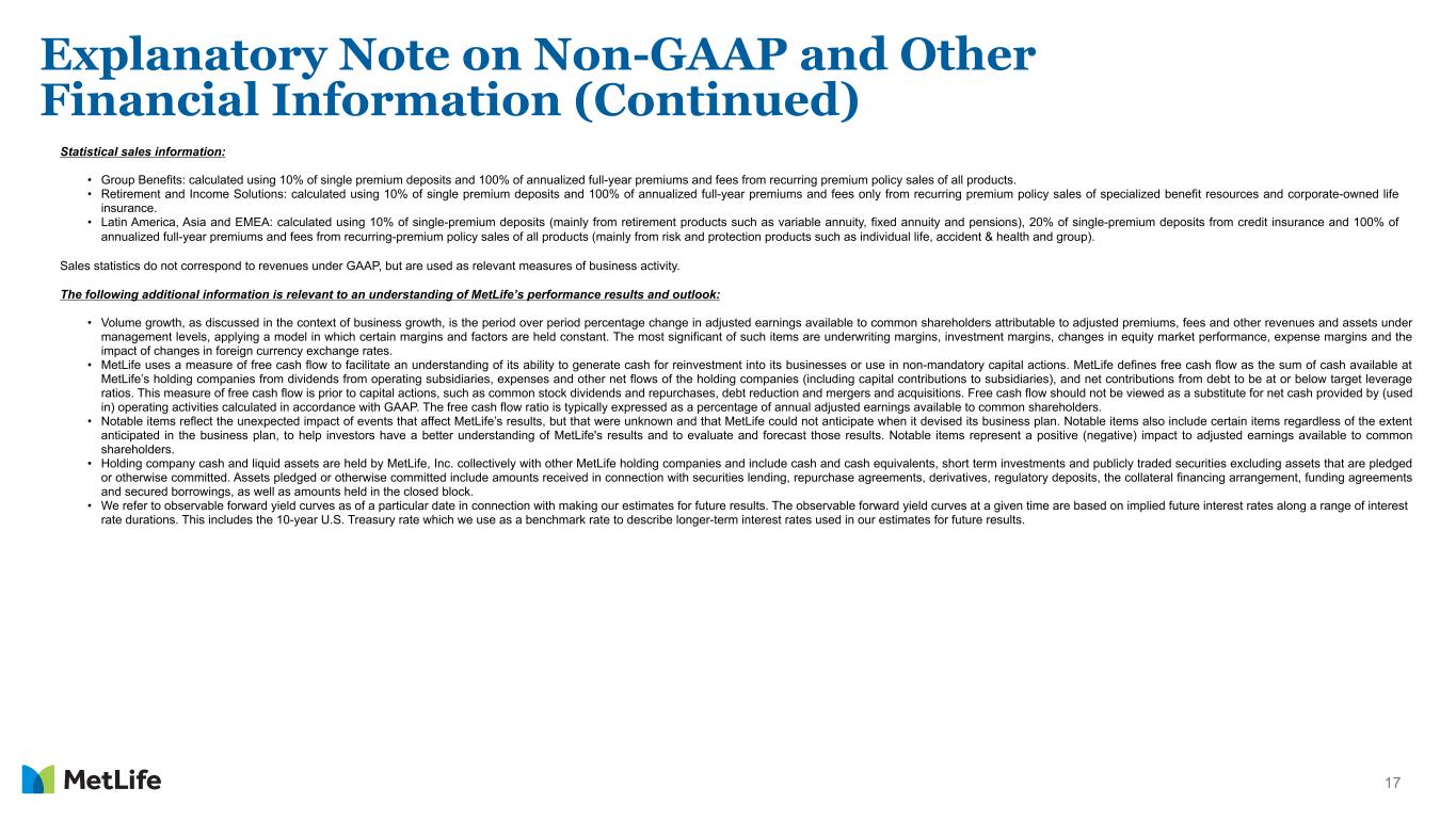 16 Explanatory Note on Non-GAAP and Other Financial Information (Continued) Return on equity and related measures • Total MetLife, Inc.’s common stockholders’ equity, excluding AOCI other than FCTA: Total MetLife, Inc.’s common stockholders’ equity, excluding the net unrealized investment gains (losses), future policy benefits discount rate remeasurement gains (losses), market risk benefits instrument-specific credit risk remeasurement gains (losses), defined benefit plans adjustment components of AOCI, net of income tax. • Total MetLife, Inc.’s common stockholders’ equity, excluding total notable items (excludes AOCI other than FCTA): Total MetLife, Inc.’s common stockholders’ equity, excluding the net unrealized investment gains (losses), future policy benefits discount rate remeasurement gains (losses), market risk benefits instrument-specific credit risk remeasurement gains (losses), defined benefit plans adjustment components of AOCI, and total notable items, net of income tax. • Return on MetLife, Inc.’s common stockholders’ equity: net income (loss) available to MetLife, Inc.’s common shareholders divided by MetLife, Inc.'s average common stockholders’ equity. • Adjusted return on MetLife, Inc.’s common stockholders’ equity: adjusted earnings available to common shareholders divided by MetLife, Inc.'s average common stockholders’ equity. • Adjusted return on MetLife, Inc.’s common stockholders’ equity, excluding AOCI other than FCTA: adjusted earnings available to common shareholders divided by MetLife, Inc.'s average common stockholders’ equity, excluding AOCI other than FCTA. • Adjusted return on MetLife, Inc.’s common stockholders’ equity, excluding total notable items (excludes AOCI other than FCTA): adjusted earnings available to common shareholders, excluding total notable items, divided by MetLife, Inc.'s average common stockholders’ equity, excluding total notable items (excludes AOCI other than FCTA). The above measures represent a level of equity consistent with the view that, in the ordinary course of business, we do not plan to sell most investments for the sole purpose of realizing gains or losses. Expense ratio, direct expense ratio, adjusted expense ratio and related measures • Expense ratio: other expenses, net of capitalization of DAC, divided by premiums, fees and other revenues. • Direct expense ratio: adjusted direct expenses, divided by adjusted premiums, fees and other revenues. Direct expenses are comprised of employee-related costs, third-party staffing costs, and general and administrative expenses. • Direct expense ratio, excluding total notable items related to direct expenses and PRT: adjusted direct expenses, excluding total notable items related to direct expenses, divided by adjusted premiums, fees and other revenues, excluding PRT. • Adjusted expense ratio: adjusted other expenses, net of adjusted capitalization of DAC, divided by adjusted premiums, fees and other revenues. • Adjusted expense ratio, excluding total notable items related to adjusted other expenses and PRT: adjusted other expenses, net of adjusted capitalization of DAC, excluding total notable items related to adjusted other expenses, divided by adjusted premiums, fees and other revenues, excluding PRT. General Account (GA) assets under management (GA AUM) GA AUM is used by MetLife to describe assets in its GA investment portfolio. GA AUM is stated at estimated fair value and is comprised of GA total investments, the portion of the GA investment portfolio classified within assets held-for-sale, and cash and cash equivalents, excluding policy loans, contractholder-directed equity securities, fair value option securities, mortgage loans originated for third parties and certain other invested assets. Mortgage loans, net of mortgage loans originated for third parties (“net mortgage loans”) (including commercial (“net commercial mortgage loans”), agricultural ("net agricultural mortgage loans") and residential mortgage loans) and real estate equity (including real estate and real estate joint ventures) included in GA AUM (at net asset value, net of deduction for encumbering debt) have been adjusted from carrying value to estimated fair value. Classification of GA AUM by sector is based on the nature and characteristics of the underlying investments which can vary from how they are classified under GAAP. Accordingly, the underlying investments within certain real estate and real estate joint ventures that are primarily net commercial mortgage loans (at net asset value, net of deduction for encumbering debt) have been reclassified to exclude them from real estate equity and include them as net commercial mortgage loans. Asia GA AUM and related measures Asia GA AUM is used by MetLife to describe assets in its Asia GA investment portfolio. Asia GA AUM is stated at estimated fair value and is comprised of Asia GA total investments, the portion of the Asia GA investment portfolio classified within assets held-for-sale and cash and cash equivalents, excluding policy loans, contractholder-directed equity securities, fair value option securities, mortgage loans originated for third parties and certain other invested assets. Mortgage loans, net of mortgage loans originated for third parties ("net mortgage loans") (including commercial ("net commercial mortgage loans"), agricultural ("net agricultural mortgage loans") and residential mortgage loans) and real estate equity (including real estate and real estate joint ventures) included in Asia GA AUM (at net asset value, net of deduction for encumbering debt) have been adjusted from carrying value to estimated fair value. At the segment level, intersegment balances (intercompany activity, primarily related to investments in subsidiaries, that eliminate at the MetLife consolidated level) are excluded from Asia GA AUM. Asia GA AUM (at amortized cost) excludes the following adjustmen