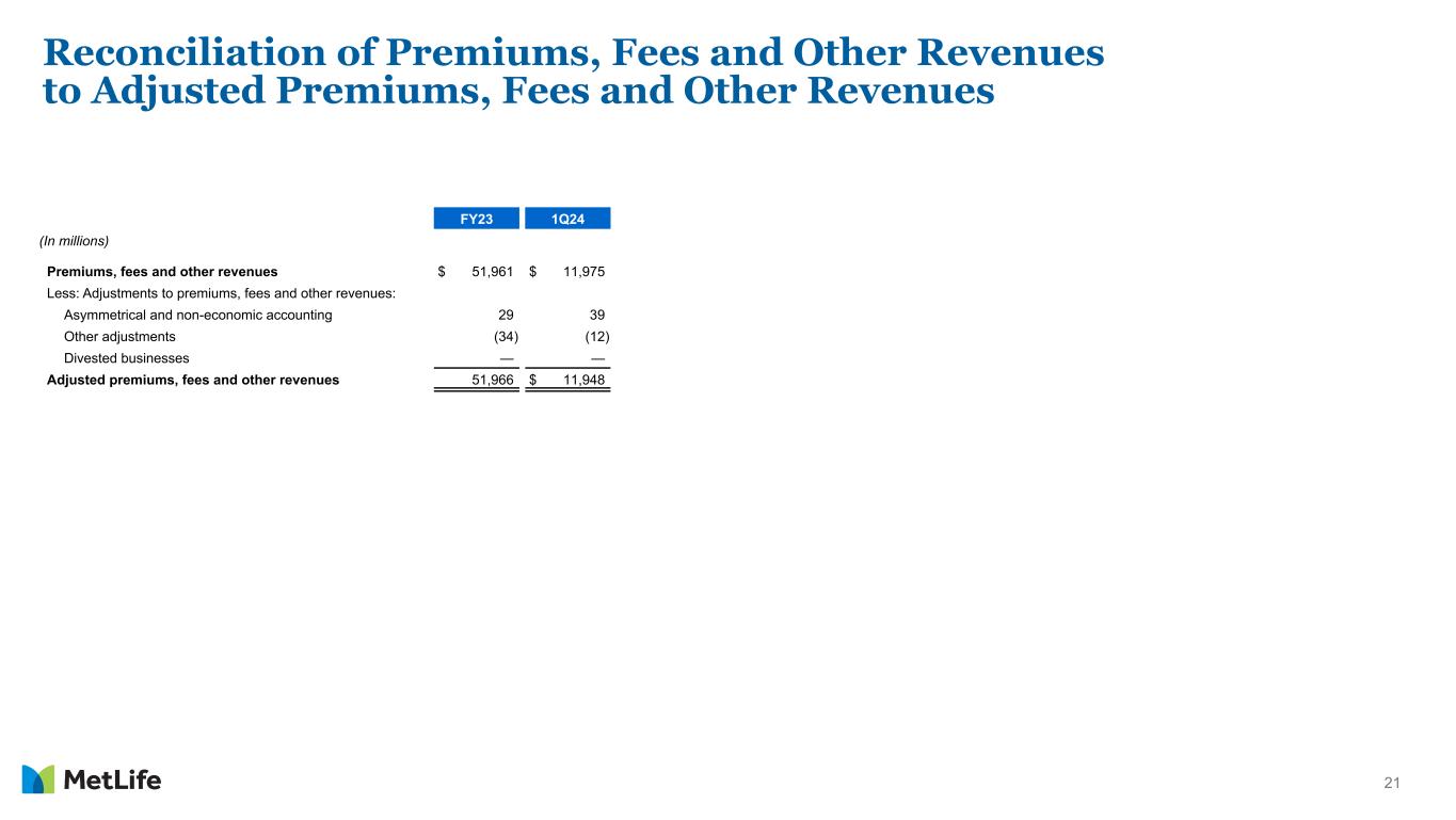 20 Reconciliation of Net Investment Income to Adjusted Net Investment Income FY21 FY22 FY23 1Q23 1Q24 (In millions) Net investment income $ 21,395 $ 15,916 $ 19,908 $ 4,645 $ 5,436 Less: Adjustments to net investment income Investment hedge adjustments (895) (976) (1,012) (264) (176) Unit-linked contract income 952 (1,298) 1,183 303 542 Other adjustments (9) (10) (12) — 2 Divested businesses 67 11 — — — Adjusted net investment income $ 21,280 18,189 $ 19,749 $ 4,606 $ 5,068
