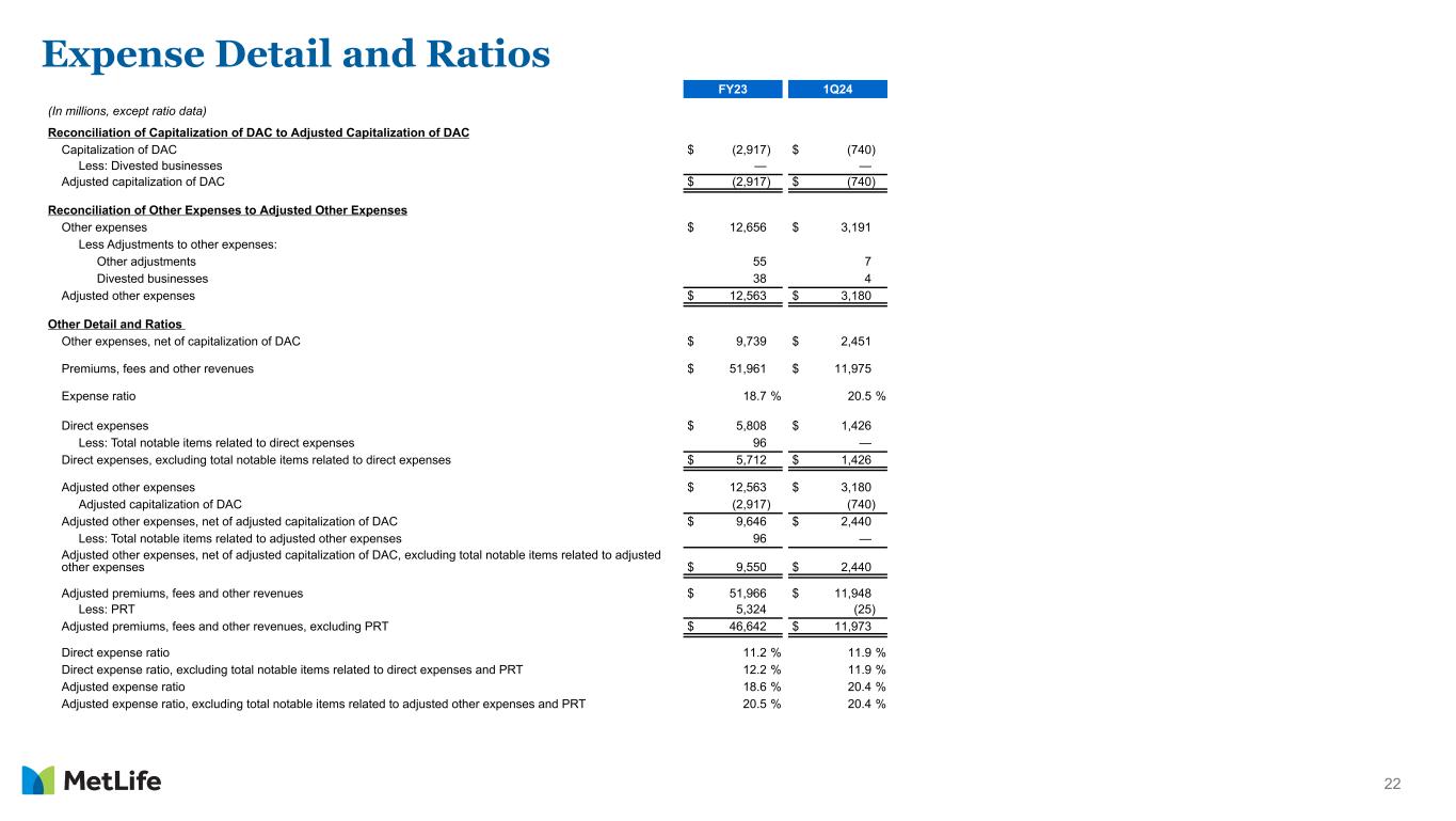 21 Reconciliation of Premiums, Fees and Other Revenues to Adjusted Premiums, Fees and Other Revenues FY23 1Q24 (In millions) Premiums, fees and other revenues $ 51,961 $ 11,975 Less: Adjustments to premiums, fees and other revenues: Asymmetrical and non-economic accounting 29 39 Other adjustments (34) (12) Divested businesses — — Adjusted premiums, fees and other revenues 51,966 $ 11,948