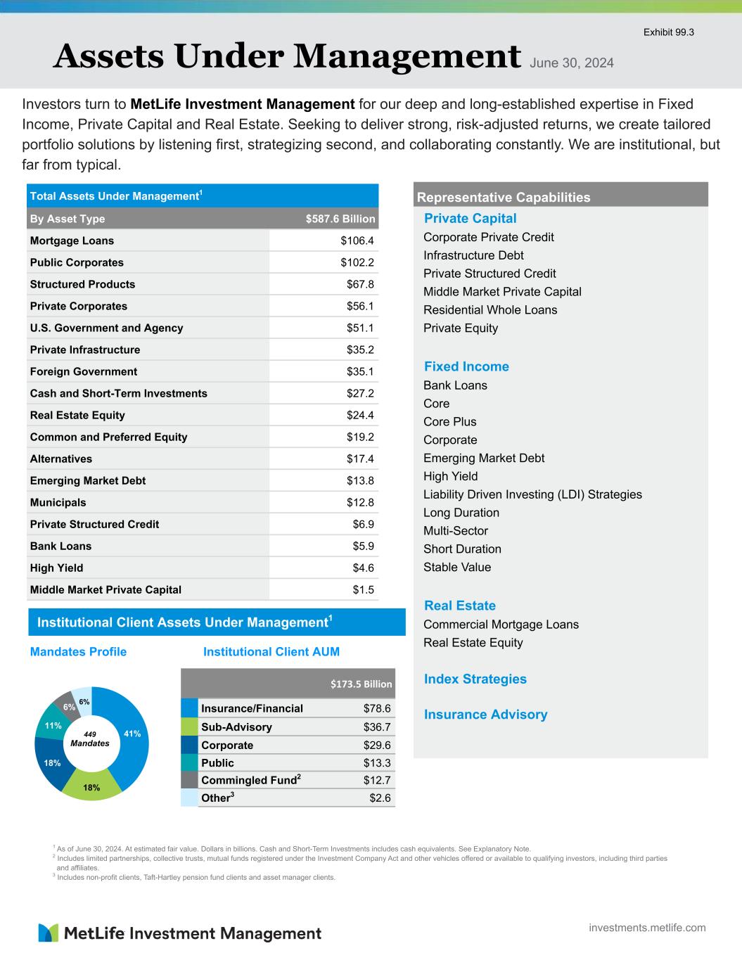 Assets Under Management June 30, 2024 Investors turn to MetLife Investment Management for our deep and long-established expertise in Fixed Income, Private Capital and Real Estate. Seeking to deliver strong, risk-adjusted returns, we create tailored portfolio solutions by listening first, strategizing second, and collaborating constantly. We are institutional, but far from typical. Total Assets Under Management1 By Asset Type $587.6 Billion Mortgage Loans $106.4 Public Corporates $102.2 Structured Products $67.8 Private Corporates $56.1 U.S. Government and Agency $51.1 Private Infrastructure $35.2 Foreign Government $35.1 Cash and Short-Term Investments $27.2 Real Estate Equity $24.4 Common and Preferred Equity $19.2 Alternatives $17.4 Emerging Market Debt $13.8 Municipals $12.8 Private Structured Credit $6.9 Bank Loans $5.9 High Yield $4.6 Middle Market Private Capital $1.5 Institutional Client Assets Under Management1 $173.5 Billion Insurance/Financial $78.6 Sub-Advisory $36.7 Corporate $29.6 Public $13.3 Commingled Fund2 $12.7 Other3 $2.6 1 As of June 30, 2024. At estimated fair value. Dollars in billions. Cash and Short-Term Investments includes cash equivalents. See Explanatory Note. 2 Includes limited partnerships, collective trusts, mutual funds registered under the Investment Company Act and other vehicles offered or available to qualifying investors, including third parties and affiliates. 3 Includes non-profit clients, Taft-Hartley pension fund clients and asset manager clients. 449 Mandates Representative Capabilities Private Capital Corporate Private Credit Infrastructure Debt Private Structured Credit Middle Market Private Capital Residential Whole Loans Private Equity Fixed Income Bank Loans Core Core Plus Corporate Emerging Market Debt High Yield Liability Driven Investing (LDI) Strategies Long Duration Multi-Sector Short Duration Stable Value Real Estate Commercial Mortgage Loans Real Estate Equity Index Strategies Insurance Advisory 41% 18% 18% 11% 6% 6% Mandates Profile Institutional Client AUM investments.metlife.com Exhibit 99.3