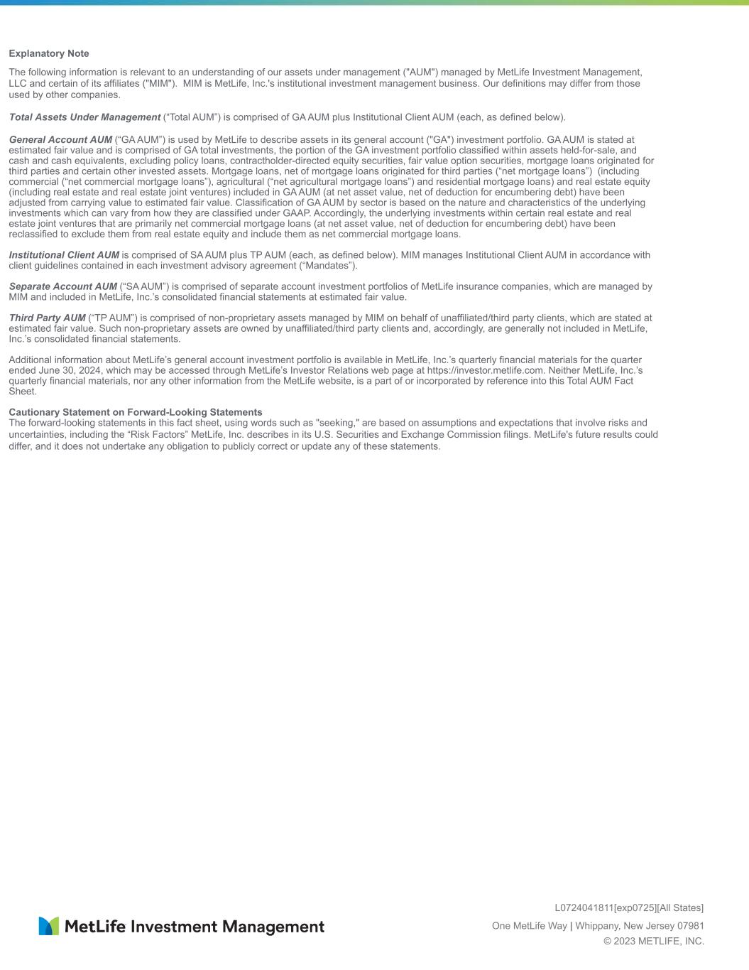 Explanatory Note The following information is relevant to an understanding of our assets under management ("AUM") managed by MetLife Investment Management, LLC and certain of its affiliates ("MIM"). MIM is MetLife, Inc.'s institutional investment management business. Our definitions may differ from those used by other companies. Total Assets Under Management (“Total AUM”) is comprised of GA AUM plus Institutional Client AUM (each, as defined below). General Account AUM (“GA AUM”) is used by MetLife to describe assets in its general account ("GA") investment portfolio. GA AUM is stated at estimated fair value and is comprised of GA total investments, the portion of the GA investment portfolio classified within assets held-for-sale, and cash and cash equivalents, excluding policy loans, contractholder-directed equity securities, fair value option securities, mortgage loans originated for third parties and certain other invested assets. Mortgage loans, net of mortgage loans originated for third parties (“net mortgage loans”) (including commercial (“net commercial mortgage loans”), agricultural (“net agricultural mortgage loans”) and residential mortgage loans) and real estate equity (including real estate and real estate joint ventures) included in GA AUM (at net asset value, net of deduction for encumbering debt) have been adjusted from carrying value to estimated fair value. Classification of GA AUM by sector is based on the nature and characteristics of the underlying investments which can vary from how they are classified under GAAP. Accordingly, the underlying investments within certain real estate and real estate joint ventures that are primarily net commercial mortgage loans (at net asset value, net of deduction for encumbering debt) have been reclassified to exclude them from real estate equity and include them as net commercial mortgage loans. Institutional Client AUM is comprised of SA AUM plus TP AUM (each, as defined below). MIM manages Institutional Client AUM in accordance with client guidelines contained in each investment advisory agreement (“Mandates”). Separate Account AUM (“SA AUM”) is comprised of separate account investment portfolios of MetLife insurance companies, which are managed by MIM and included in MetLife, Inc.’s consolidated financial statements at estimated fair value. Third Party AUM (“TP AUM”) is comprised of non-proprietary assets managed by MIM on behalf of unaffiliated/third party clients, which are stated at estimated fair value. Such non-proprietary assets are owned by unaffiliated/third party clients and, accordingly, are generally not included in MetLife, Inc.’s consolidated financial statements. Additional information about MetLife’s general account investment portfolio is available in MetLife, Inc.’s quarterly financial materials for the quarter ended June 30, 2024, which may be accessed through MetLife’s Investor Relations web page at https://investor.metlife.com. Neither MetLife, Inc.’s quarterly financial materials, nor any other information from the MetLife website, is a part of or incorporated by reference into this Total AUM Fact Sheet. Cautionary Statement on Forward-Looking Statements The forward-looking statements in this fact sheet, using words such as "seeking," are based on assumptions and expectations that involve risks and uncertainties, including the “Risk Factors” MetLife, Inc. describes in its U.S. Securities and Exchange Commission filings. MetLife's future results could differ, and it does not undertake any obligation to publicly correct or update any of these statements. L0724041811[exp0725][All States] One MetLife Way | Whippany, New Jersey 07981 © 2023 METLIFE, INC.