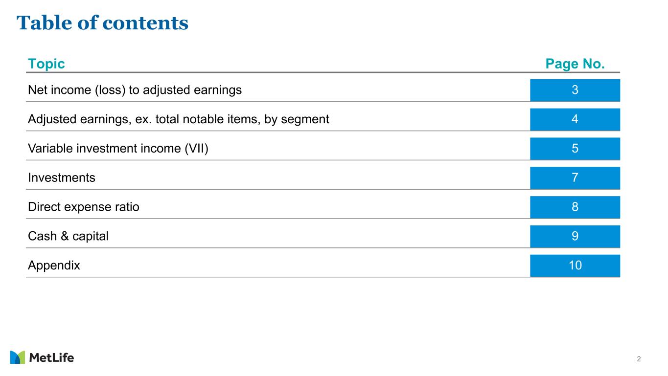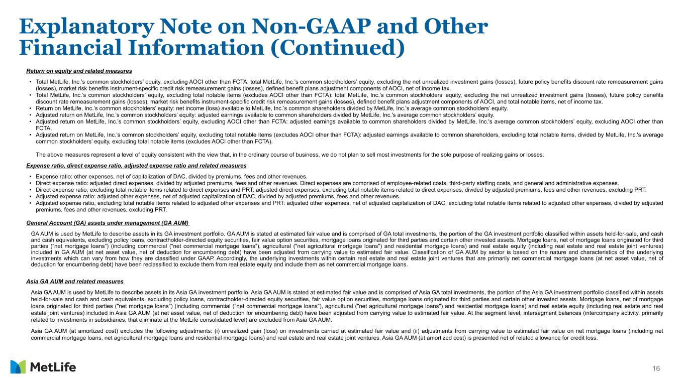 15 Explanatory Note on Non-GAAP and Other Financial Information (Continued) Asymmetrical and non-economic accounting adjustments are made to the line items indicated in calculating adjusted earnings: • Net investment income includes earned income on derivatives and amortization of premium on derivatives that are hedges of investments or that are used to replicate certain investments, but do not qualify for hedge accounting treatment ("Investment hedge adjustments"). • Other revenues include settlements of foreign currency earnings hedges and exclude asymmetrical accounting associated with in-force reinsurance. • Policyholder benefits and claims excludes (i) amortization of basis adjustments associated with de-designated fair value hedges of future policy benefits, (ii) inflation-indexed benefit adjustments associated with contracts backed by inflation- indexed investments, (iii) asymmetrical accounting associated with in-force reinsurance, and (iv) non-economic losses incurred at contract inception for certain single premium annuity business. These losses are amortized into adjusted earnings within policyholder benefits and claims over the estimated lives of the contracts. • Interest credited to policyholder account balances excludes amounts associated with periodic crediting rate adjustments based on the total return of a contractually referenced pool of assets and other pass-through adjustments and asymmetrical accounting associated with in-force reinsurance. Divested businesses are those that have been or will be sold or exited by MetLife but do not meet the discontinued operations criteria under GAAP. Divested businesses also include the net impact of transactions with exited businesses that have been eliminated in consolidation under GAAP and costs relating to businesses that have been or will be sold or exited by MetLife that do not meet the criteria to be included in results of discontinued operations under GAAP. Other adjustments are made to the line items indicated in calculating adjusted earnings: • Net investment income and interest credited to policyholder account balances excludes certain amounts related to contractholder-directed equity securities ("Unit-linked contract income") and ("Unit-linked contract costs"). • Other revenues include fee revenue on synthetic guaranteed interest contracts ("GICs") accounted for as freestanding derivatives. • Other revenues exclude and other expenses include fees received in connection with services provided under transition service agreements. • Other expenses exclude (i) implementation of new insurance regulatory requirements and other costs, and (ii) acquisition, integration and other related costs. Other expenses include (i) deductions for net income attributable to noncontrolling interests, and (ii) benefits accrued on synthetic GICs accounted for as freestanding derivatives. Adjusted earnings also excludes the recognition of certain contingent assets and liabilities that could not be recognized at acquisition or adjusted for during the measurement period under GAAP business combination accounting guidance. The tax impact of the adjustments mentioned above are calculated net of the U.S. or foreign statutory tax rate, which could differ from MetLife's effective tax rate. Additionally, the provision for income tax (expense) benefit also includes the impact related to the timing of certain tax credits, as well as certain tax reforms. In addition, adjusted earnings available to common shareholders excludes the impact of preferred stock redemption premium, which is reported as a reduction to net income (loss) available to MetLife, Inc.’s common shareholders. Investment portfolio gains (losses) and derivative gains (losses) These are measures of investment and hedging activity. Investment portfolio gains (losses) principally excludes amounts that are reported within net investment gains (losses) but do not relate to the performance of the investment portfolio, such as gains (losses) on sales and divestitures of businesses, as well as investment portfolio gains (losses) of divested businesses. Derivative gains (losses) principally excludes earned income on derivatives and amortization of premium on derivatives, where such derivatives are either hedges of investments or are used to replicate certain investments, and where such derivatives do not qualify for hedge accounting. This earned income and amortization of premium is reported within adjusted earnings and not within derivative gains (losses).