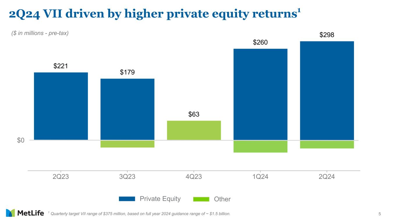 4 ($ in millions - except per share data) 2Q24 2Q23 % Change % Change (Constant Rate) Key Drivers1 Favorable Unfavorable Group Benefits $533 $372 43% Underwriting Margins Retirement and Income Solutions 410 417 (2%) Volume Growth Investment Margins Asia 449 431 4% 8% Underwriting Margins; Investment Margins Latin America 226 219 3% 8% Volume Growth; Underwriting Margins Equity Markets EMEA 77 70 10% 20% Volume Growth; Investment Margins Expense Margins MetLife Holdings 153 211 (27%) Foregone earnings2 Corporate & Other (220) (228) Expenses Taxes Adjusted Earnings ex. Total Notable Items $1,628 $1,492 9% 11% Adjusted EPS ex. Total Notable Items $2.28 $1.94 18% 20% Adjusted earnings, ex. total notable items, by segment 1 To be discussed on MetLife, Inc.'s second quarter 2024 earnings conference call and audio webcast. 2 As a result of the reinsurance transaction with Global Atlantic Financial Group being effective in November 2023.