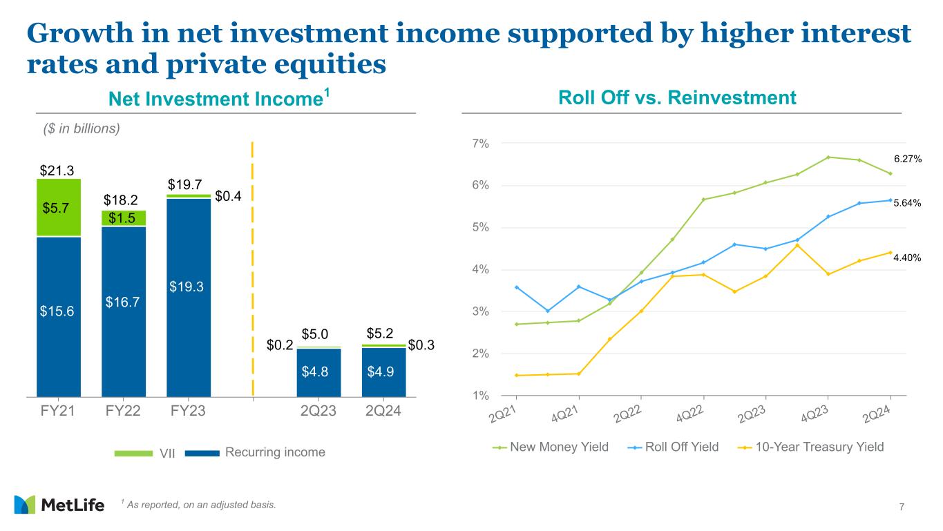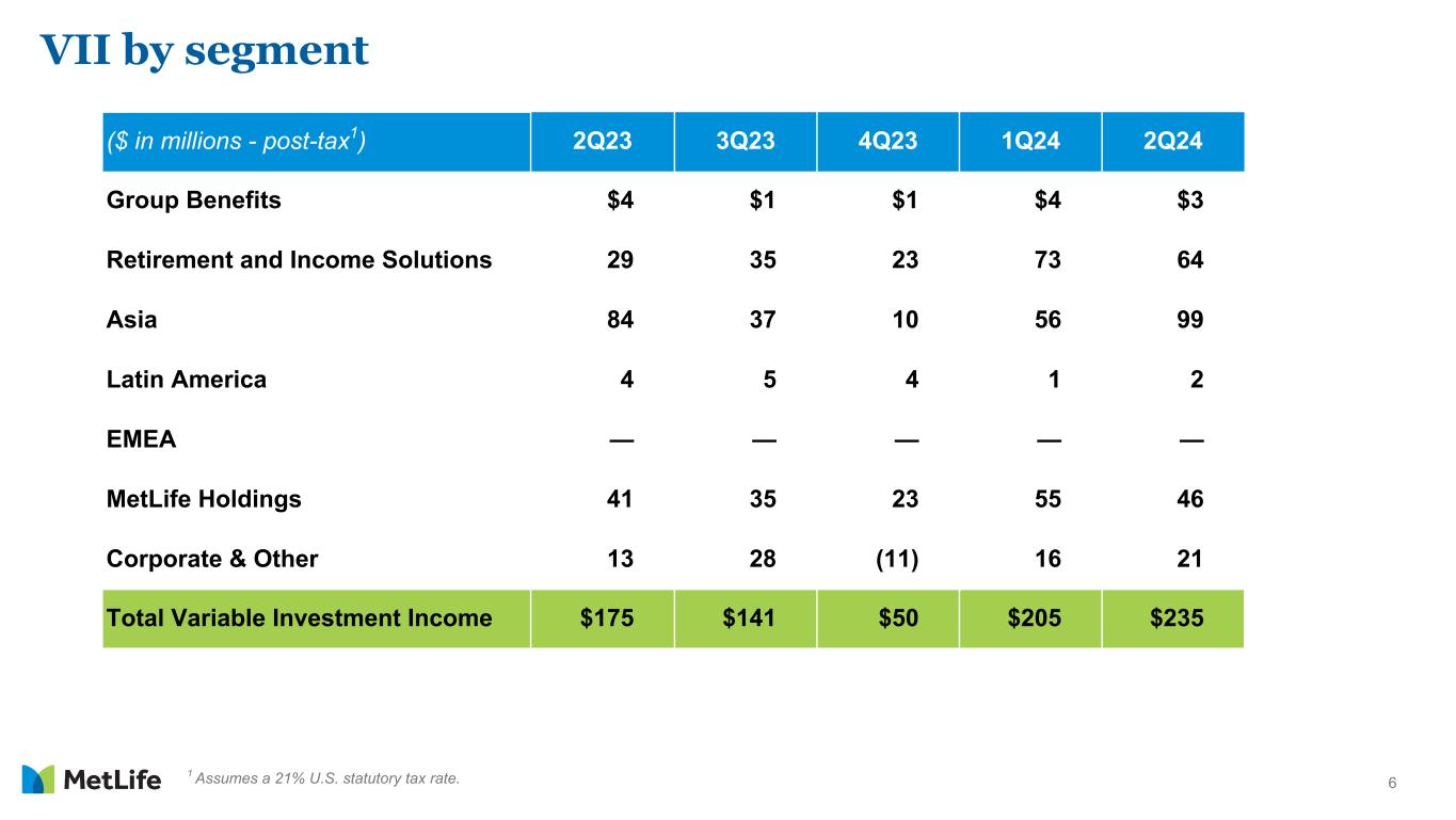 6 ($ in millions - post-tax1) 2Q23 3Q23 4Q23 1Q24 2Q24 Group Benefits $4 $1 $1 $4 $3 Retirement and Income Solutions 29 35 23 73 64 Asia 84 37 10 56 99 Latin America 4 5 4 1 2 EMEA — — — — — MetLife Holdings 41 35 23 55 46 Corporate & Other 13 28 (11) 16 21 Total Variable Investment Income $175 $141 $50 $205 $235 1 Assumes a 21% U.S. statutory tax rate. VII by segment