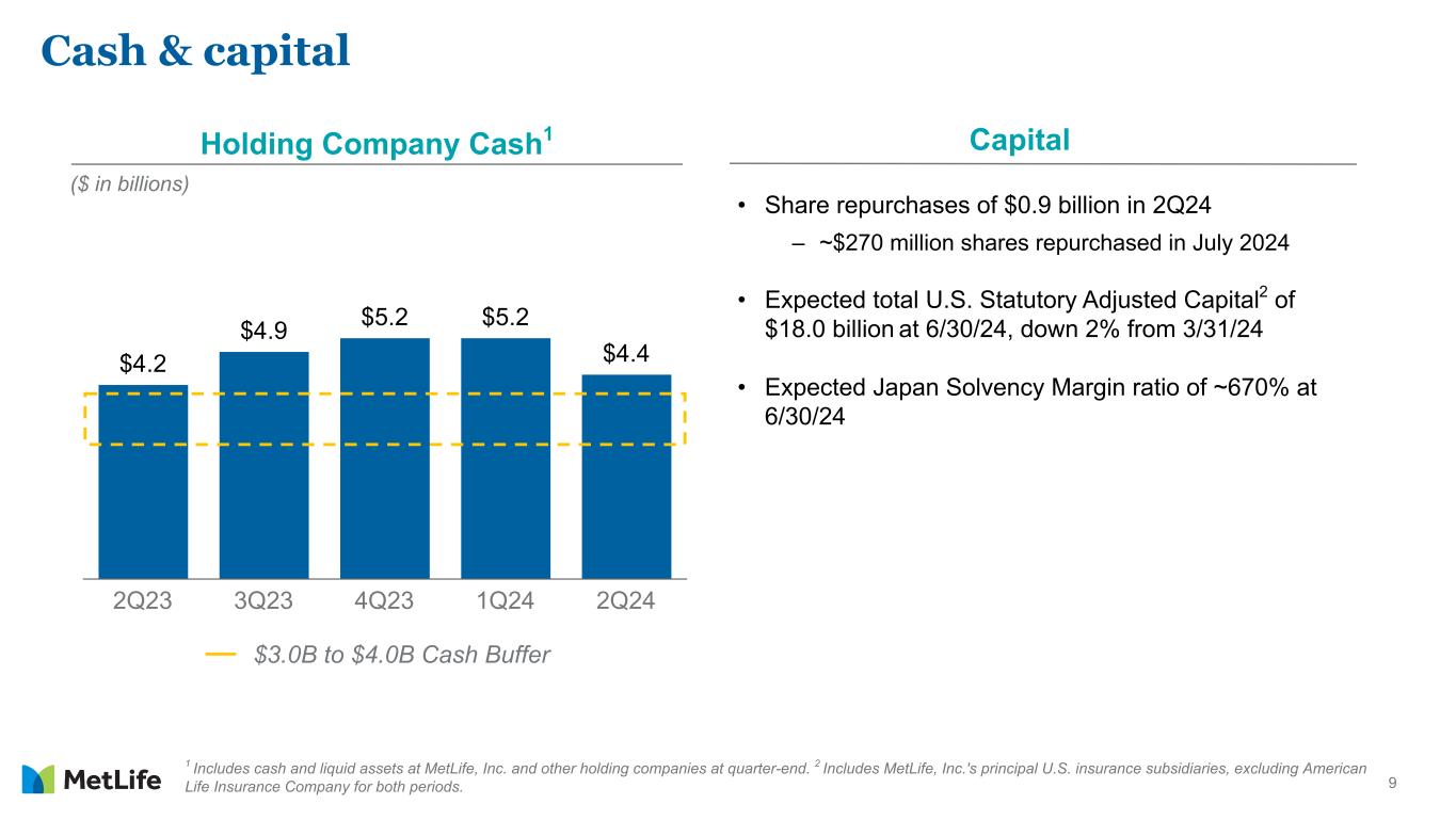8 12.2% 11.9% 11.9% FY23 1Q24 2Q24 1 Direct expense ratio, excluding total notable items related to direct expenses and pension risk transfers (PRT). 12.3% Annual Target 2Q24 direct expense ratio1 of 11.9%, below 12.3% annual target