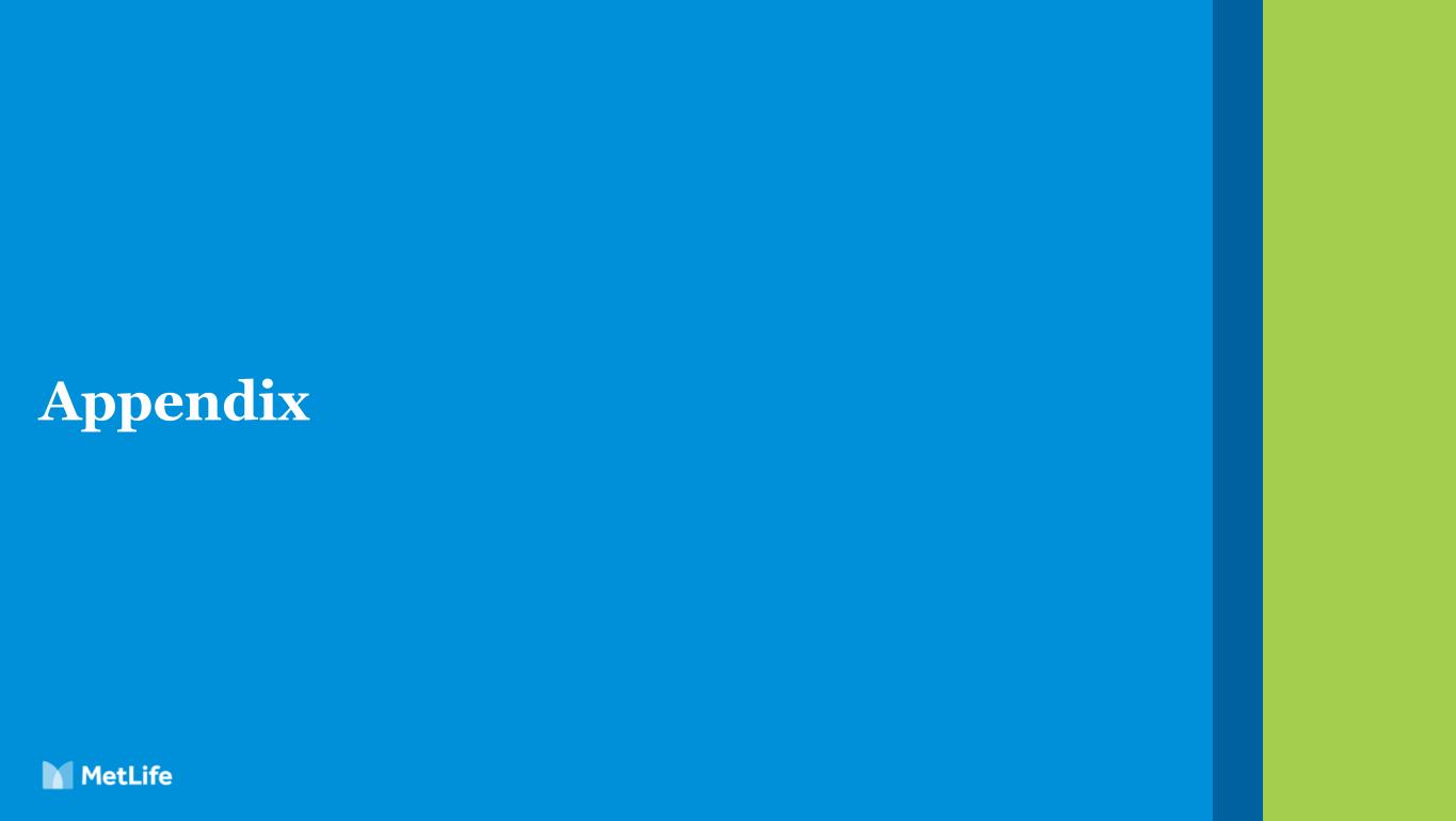 17 Explanatory Note on Non-GAAP and Other Financial Information (Continued) Statistical sales information: • Group Benefits: calculated using 10% of single premium deposits and 100% of annualized full-year premiums and fees from recurring premium policy sales of all products. • Retirement and Income Solutions: calculated using 10% of single premium contracts, on and off-balance sheet deposits, and the contract value for new UK longevity reinsurance contracts, and 100% of annualized full-year premiums and fees only from recurring premium policy sales of specialized benefit resources and corporate-owned life insurance. • Latin America, Asia and EMEA: calculated using 10% of single premium deposits (mainly from retirement products such as variable annuity, fixed annuity and pensions), 20% of single premium deposits from credit insurance and 100% of annualized full-year premiums and fees from recurring-premium policy sales of all products (mainly from risk and protection products such as individual life, accident & health and group). Sales statistics do not correspond to revenues under GAAP, but are used as relevant measures of business activity. The following additional information is relevant to an understanding of MetLife’s performance results and outlook: • Volume growth, as discussed in the context of business growth, is the period over period percentage change in adjusted earnings available to common shareholders attributable to adjusted premiums, fees and other revenues and assets under management levels, applying a model in which certain margins and factors are held constant. The most significant of such items are underwriting margins, investment margins, changes in equity market performance, expense margins and the impact of changes in foreign currency exchange rates. • MetLife uses a measure of free cash flow to facilitate an understanding of its ability to generate cash for reinvestment into its businesses or use in non-mandatory capital actions. MetLife defines free cash flow as the sum of cash available at MetLife’s holding companies from dividends from operating subsidiaries, expenses and other net flows of the holding companies (including capital contributions to subsidiaries), and net contributions from debt to be at or below target leverage ratios. This measure of free cash flow is prior to capital actions, such as common stock dividends and repurchases, debt reduction and mergers and acquisitions. Free cash flow should not be viewed as a substitute for net cash provided by (used in) operating activities calculated in accordance with GAAP. The free cash flow ratio is typically expressed as a percentage of annual adjusted earnings available to common shareholders. • Notable items reflect the unexpected impact of events that affect MetLife’s results, but that were unknown and that MetLife could not anticipate when it devised its business plan. Notable items also include certain items regardless of the extent anticipated in the business plan, to help investors have a better understanding of MetLife's results and to evaluate and forecast those results. Notable items represent a positive (negative) impact to adjusted earnings available to common shareholders. • Holding company cash and liquid assets are held by MetLife, Inc. collectively with other MetLife holding companies and include cash and cash equivalents, short term investments and publicly traded securities excluding assets that are pledged or otherwise committed. Assets pledged or otherwise committed include amounts received in connection with securities lending, repurchase agreements, derivatives, regulatory deposits, the collateral financing arrangement, funding agreements and secured borrowings, as well as amounts held in the closed block. • We refer to observable forward yield curves as of a particular date in connection with making our estimates for future results. The observable forward yield curves at a given time are based on implied future interest rates along a range of interest rate durations. This includes the 10-year U.S. Treasury rate which we use as a benchmark rate to describe longer-term interest rates used in our estimates for future results.
