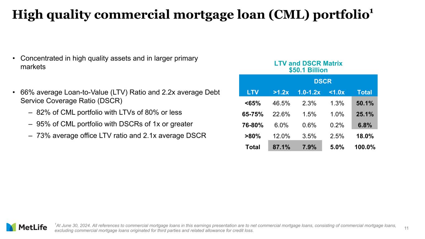 11 High quality commercial mortgage loan (CML) portfolio1 • Concentrated in high quality assets and in larger primary markets • 66% average Loan-to-Value (LTV) Ratio and 2.2x average Debt Service Coverage Ratio (DSCR) – 82% of CML portfolio with LTVs of 80% or less – 95% of CML portfolio with DSCRs of 1x or greater – 73% average office LTV ratio and 2.1x average DSCR 1At June 30, 2024. All references to commercial mortgage loans in this earnings presentation are to net commercial mortgage loans, consisting of commercial mortgage loans, excluding commercial mortgage loans originated for third parties and related allowance for credit loss. LTV and DSCR Matrix $50.1 Billion DSCR LTV >1.2x 1.0-1.2x <1.0x Total <65% 46.5% 2.3% 1.3% 50.1% 65-75% 22.6% 1.5% 1.0% 25.1% 76-80% 6.0% 0.6% 0.2% 6.8% >80% 12.0% 3.5% 2.5% 18.0% Total 87.1% 7.9% 5.0% 100.0%