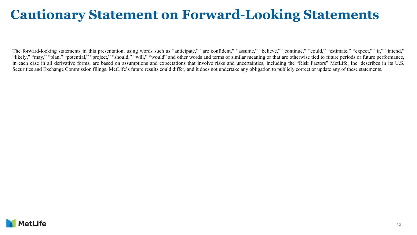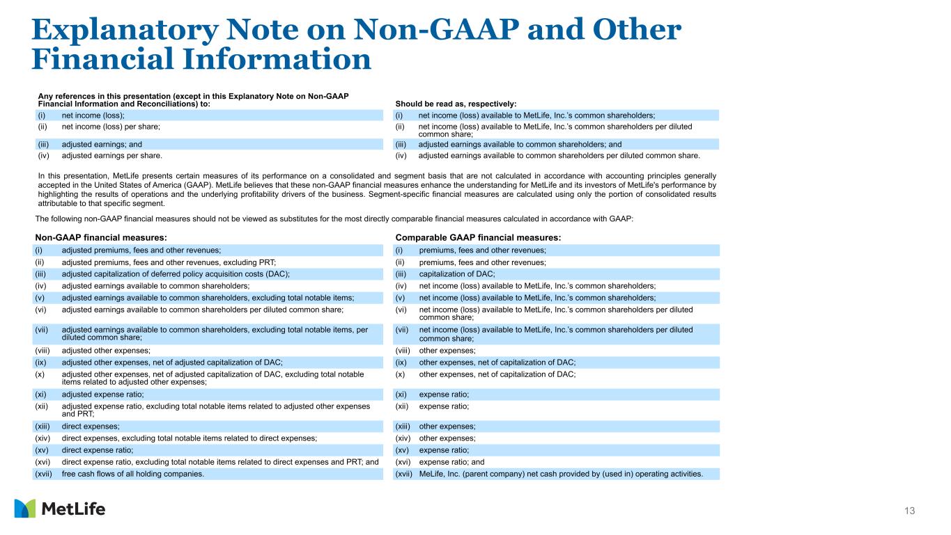 12 Cautionary Statement on Forward-Looking Statements The forward-looking statements in this presentation, using words such as “anticipate,” “are confident,” “assume,” “believe,” “continue,” “could,” “estimate,” “expect,” “if,” “intend,” “likely,” “may,” “plan,” “potential,” “project,” “should,” “will,” “would” and other words and terms of similar meaning or that are otherwise tied to future periods or future performance, in each case in all derivative forms, are based on assumptions and expectations that involve risks and uncertainties, including the “Risk Factors” MetLife, Inc. describes in its U.S. Securities and Exchange Commission filings. MetLife’s future results could differ, and it does not undertake any obligation to publicly correct or update any of these statements.